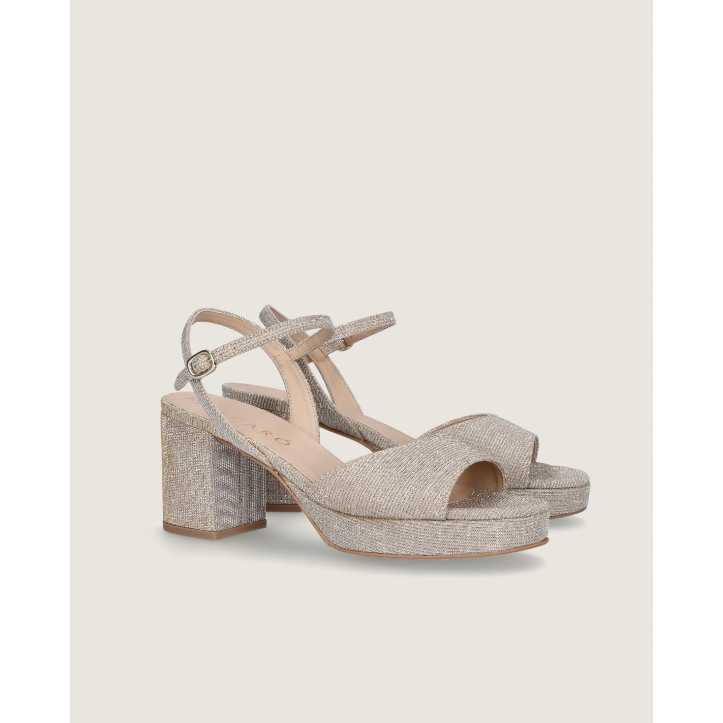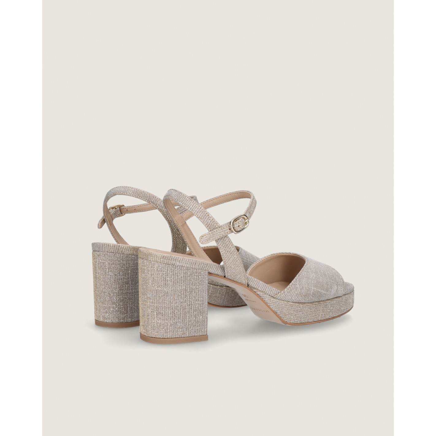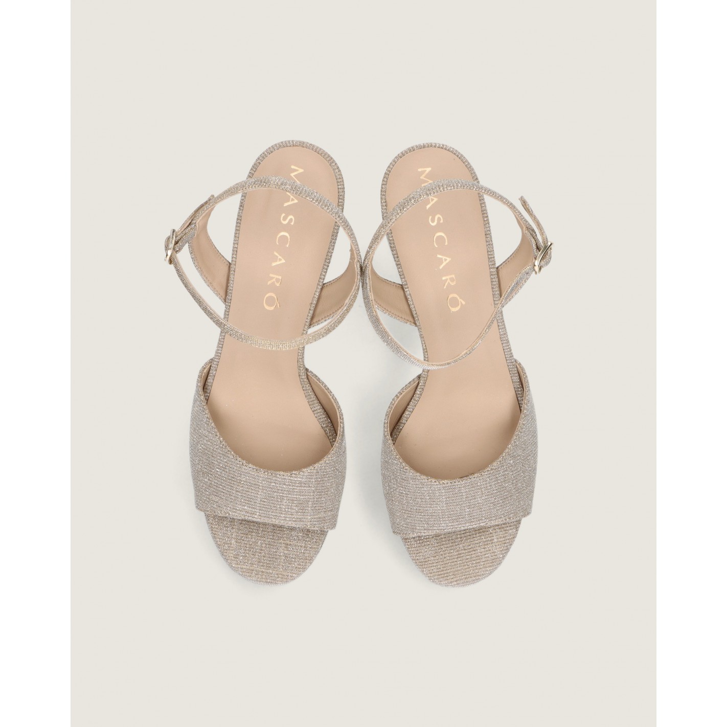 Sandale Mae mit Knoechelriemchen und 7cm Absatz aus champagnergoldenem, glitzerndem Textil mit Gummisohle und Innensohle aus Leder.