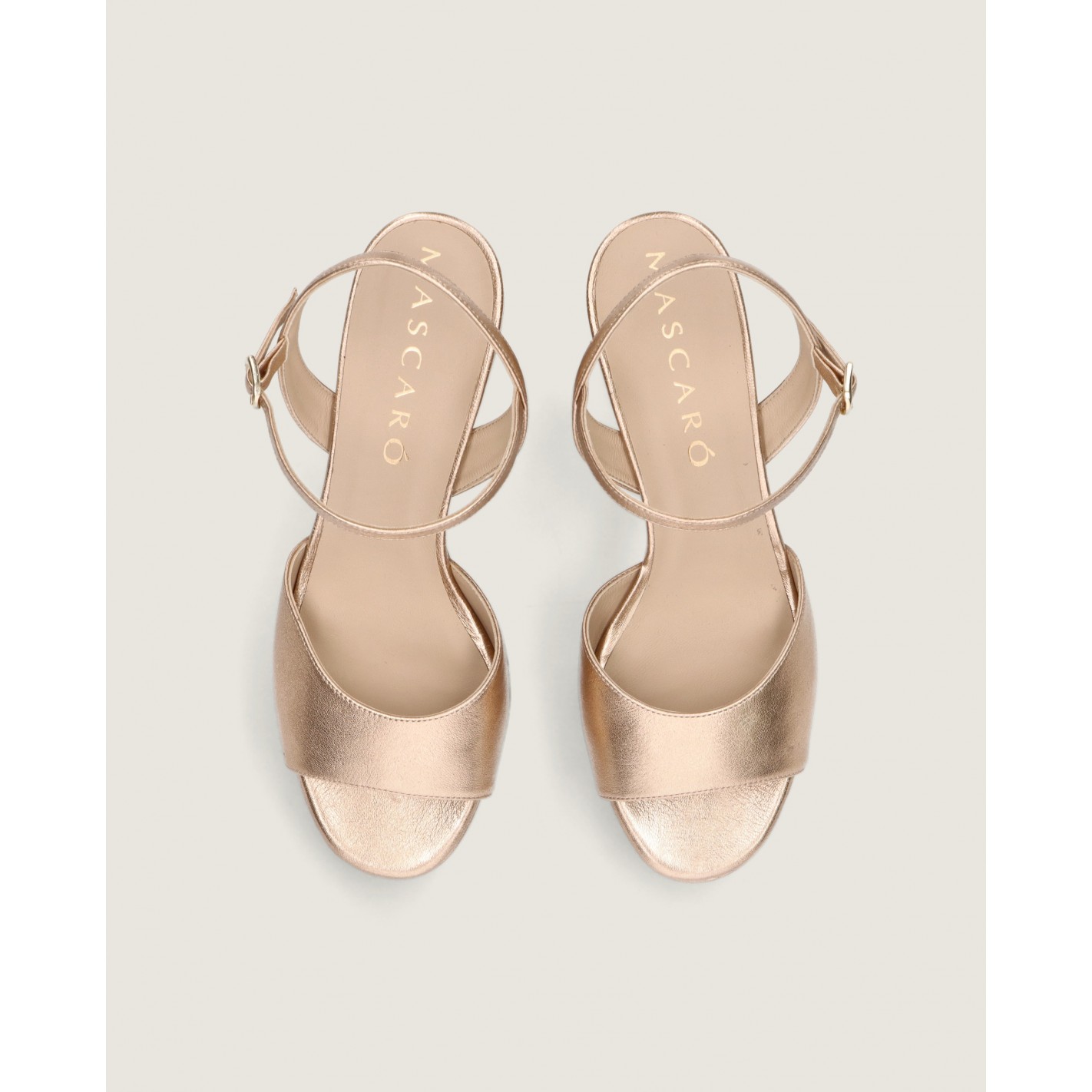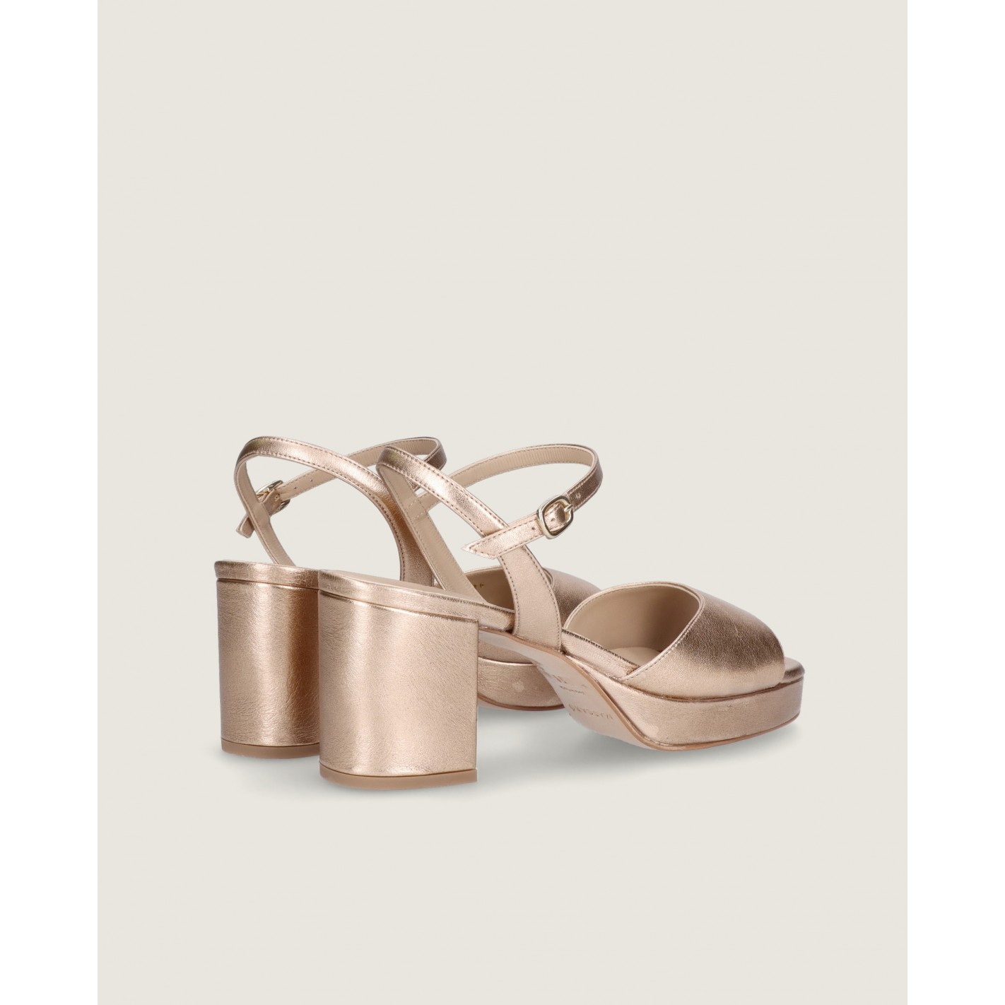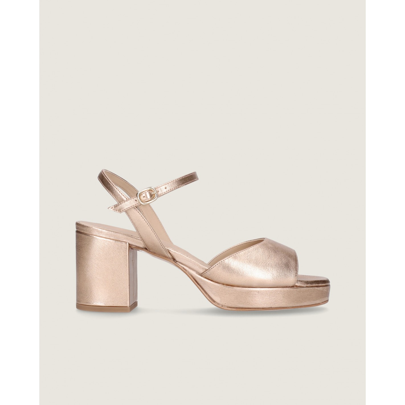 Sandale Mae mit Knoechelriemchen und 7cm Absatz aus weichem nudefarbenem Metallic-Leder mit Gummisohle und Innensohle aus Leder.