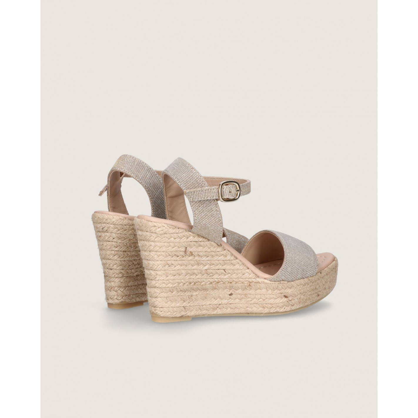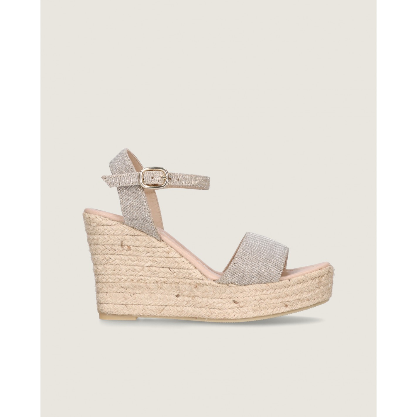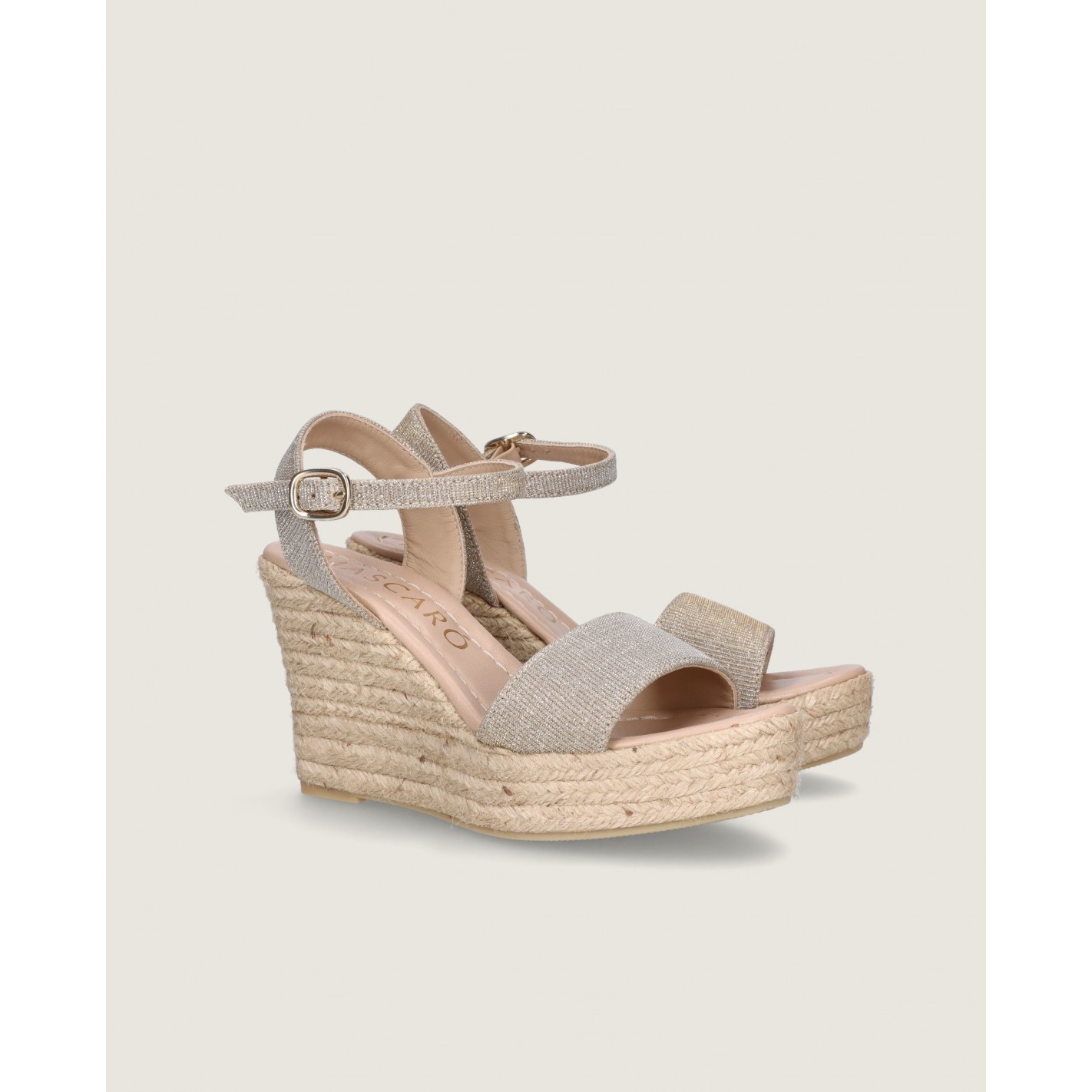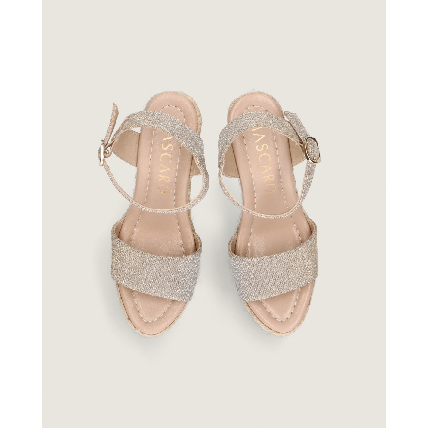 Clutch im Baguette-Stil aus champagnergoldenem, glitzerndem Stoff mit goldenen Kettendetails. Maße: 9 cm hoch x 30 cm breit x 4 cm tief.