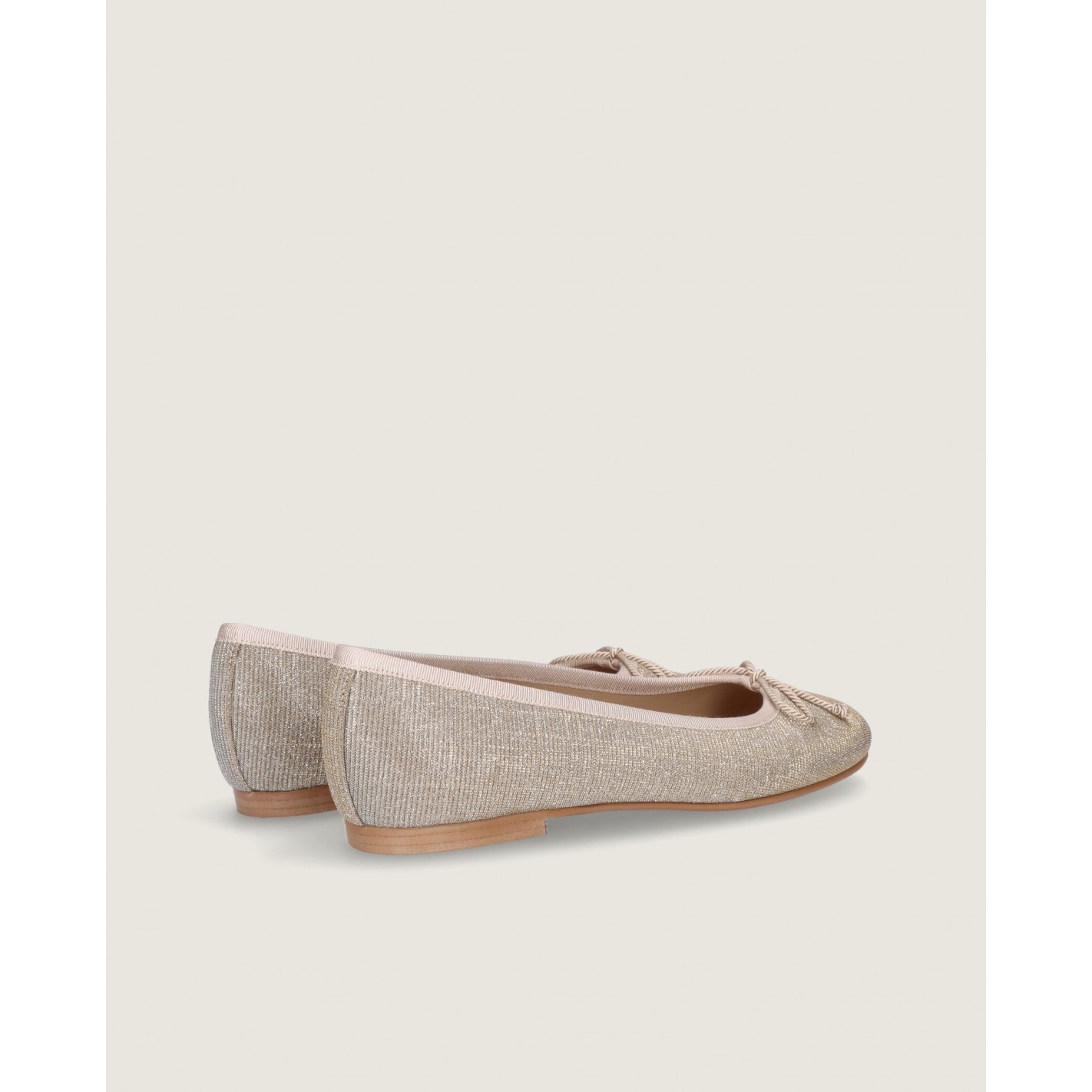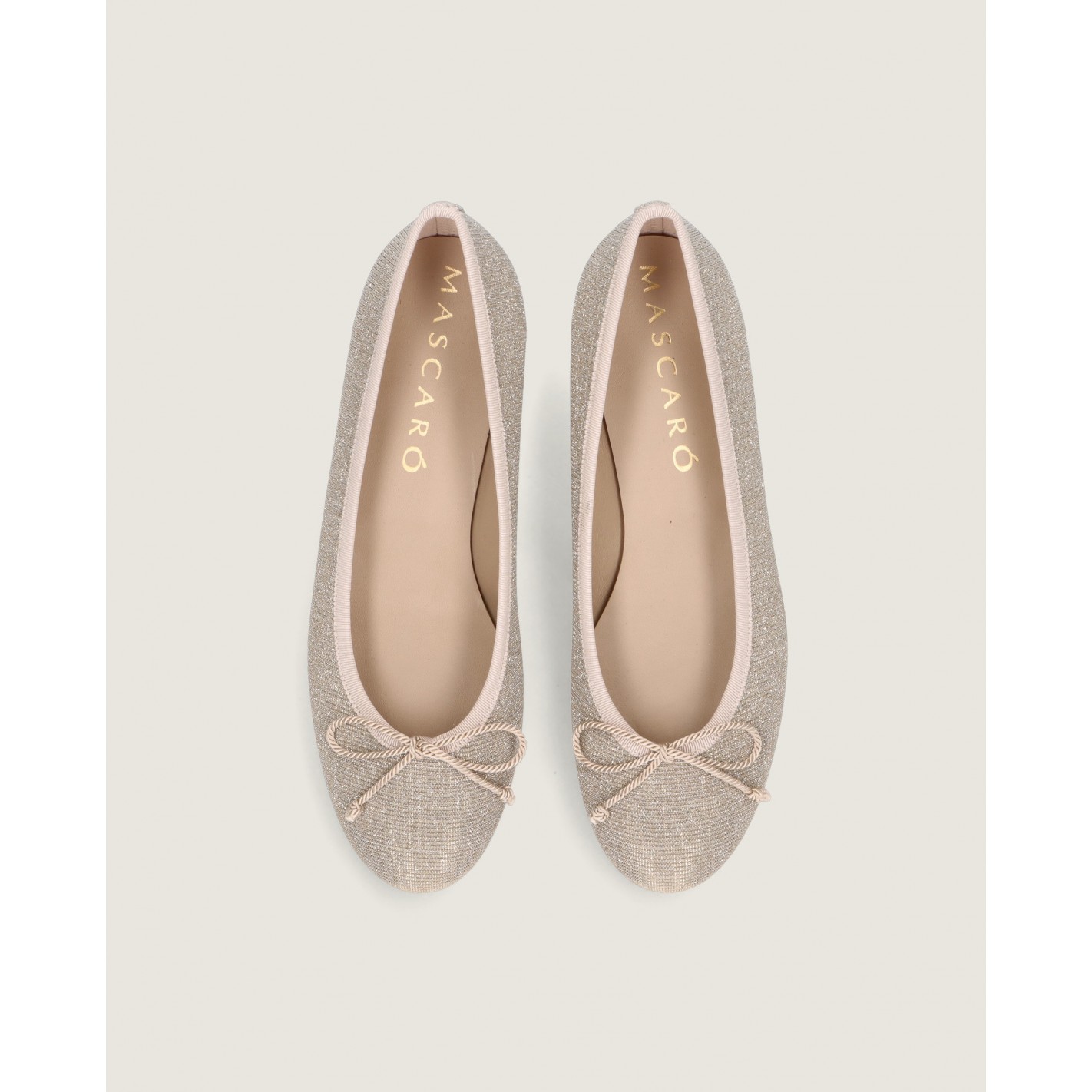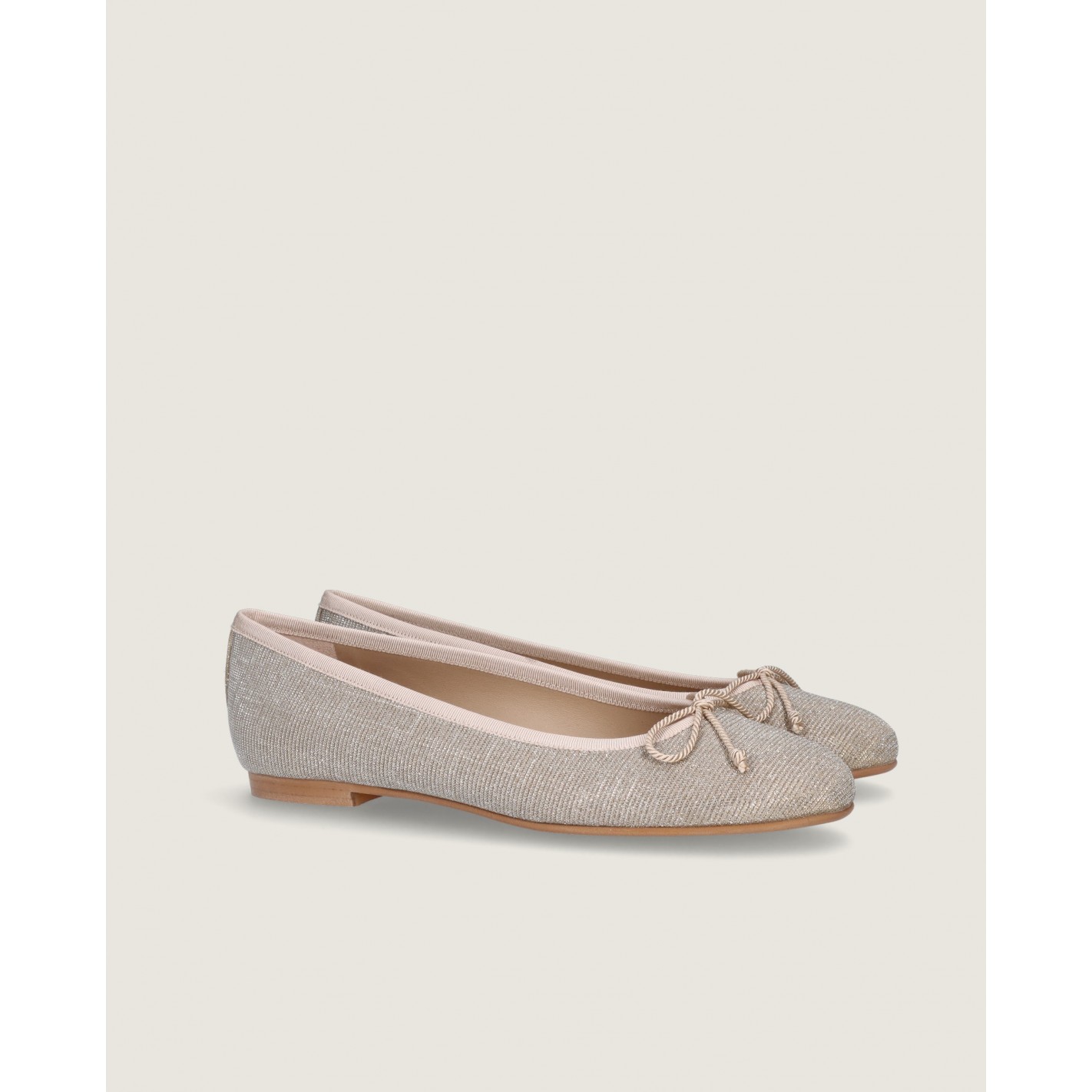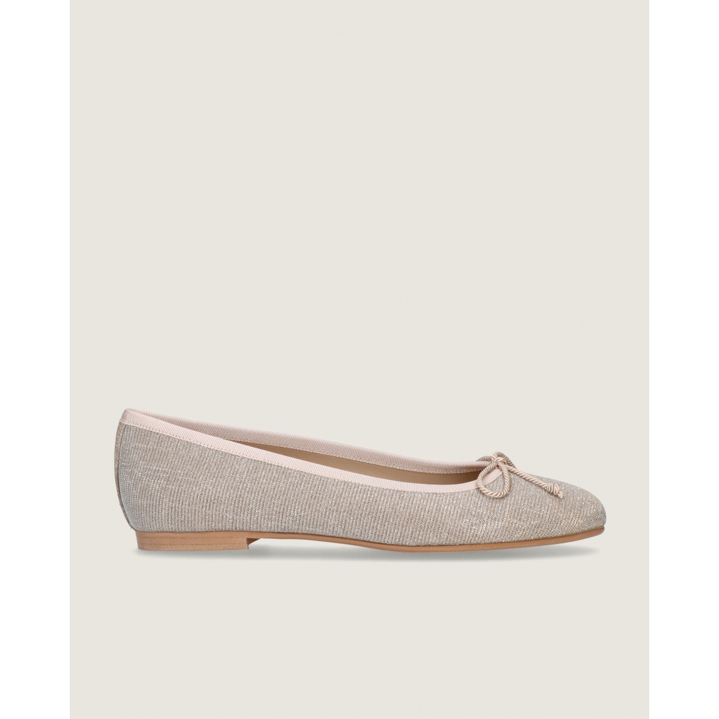 Ballerina Audrey mit mandelförmiger Spitze und 1 cm Absatz aus champagnergoldenem, glitzerndem Textil mit Gummisohle, Innensohle und Futter aus Leder.