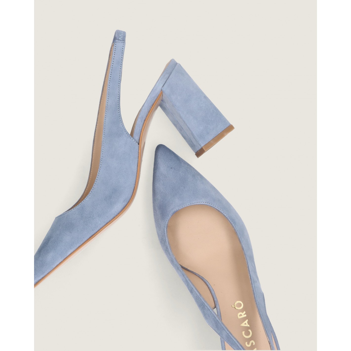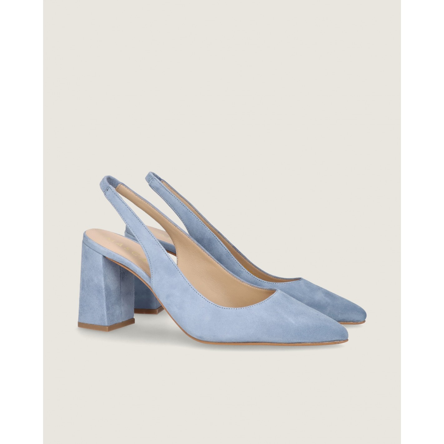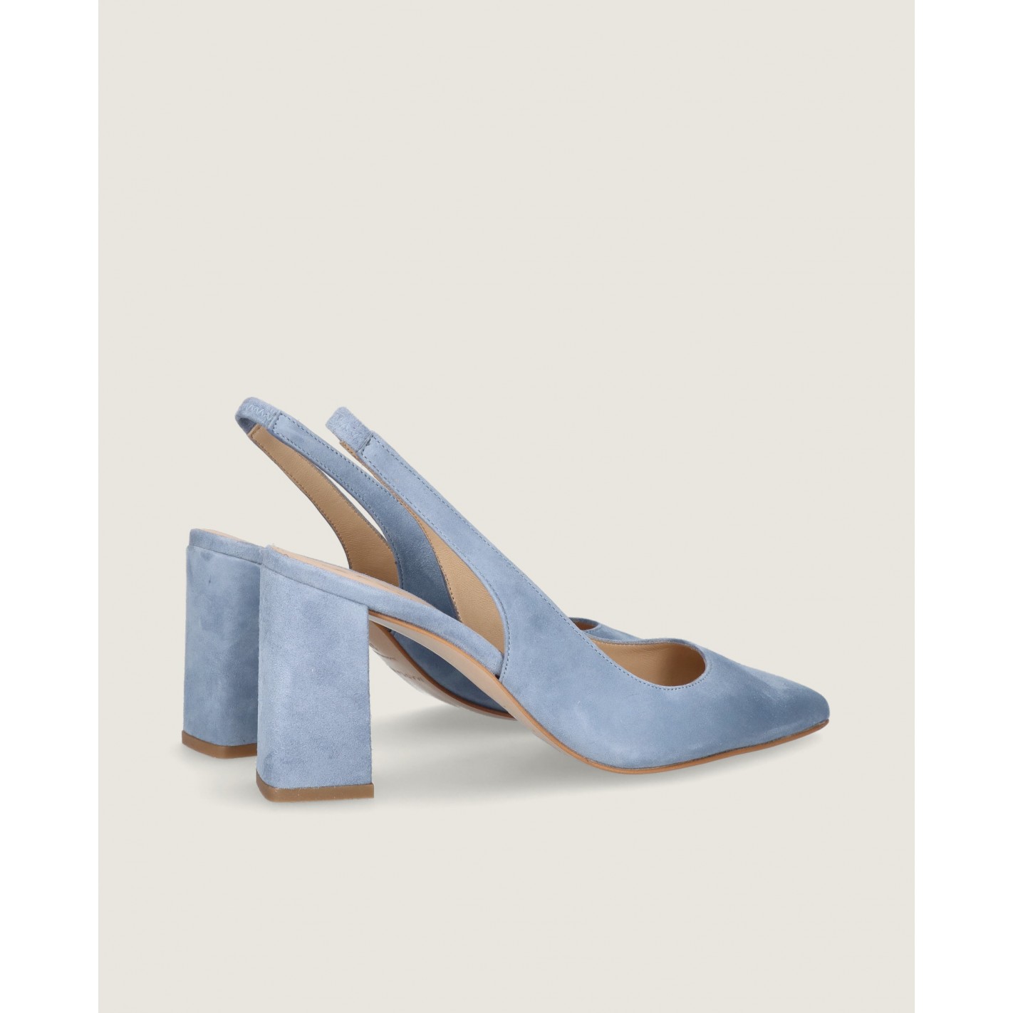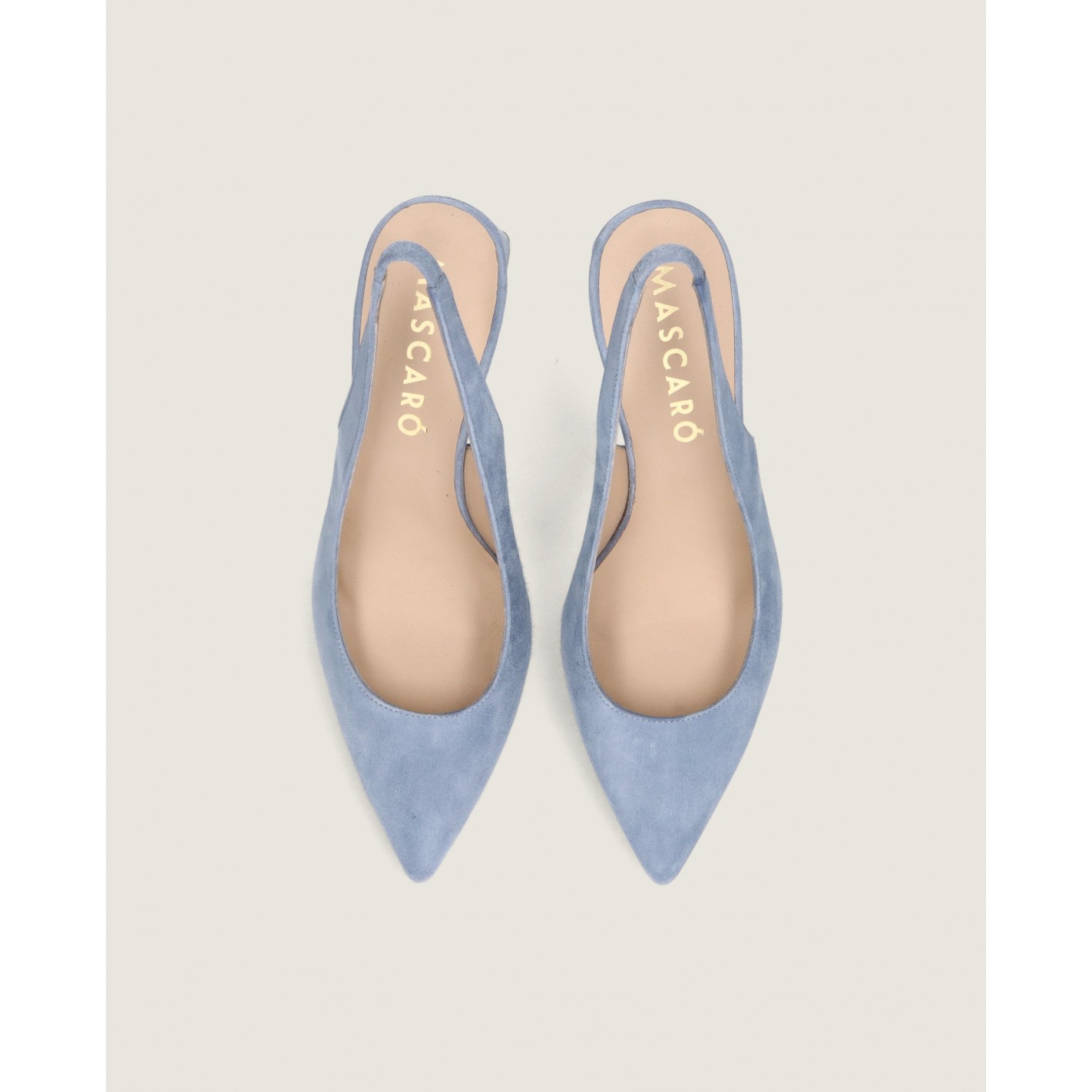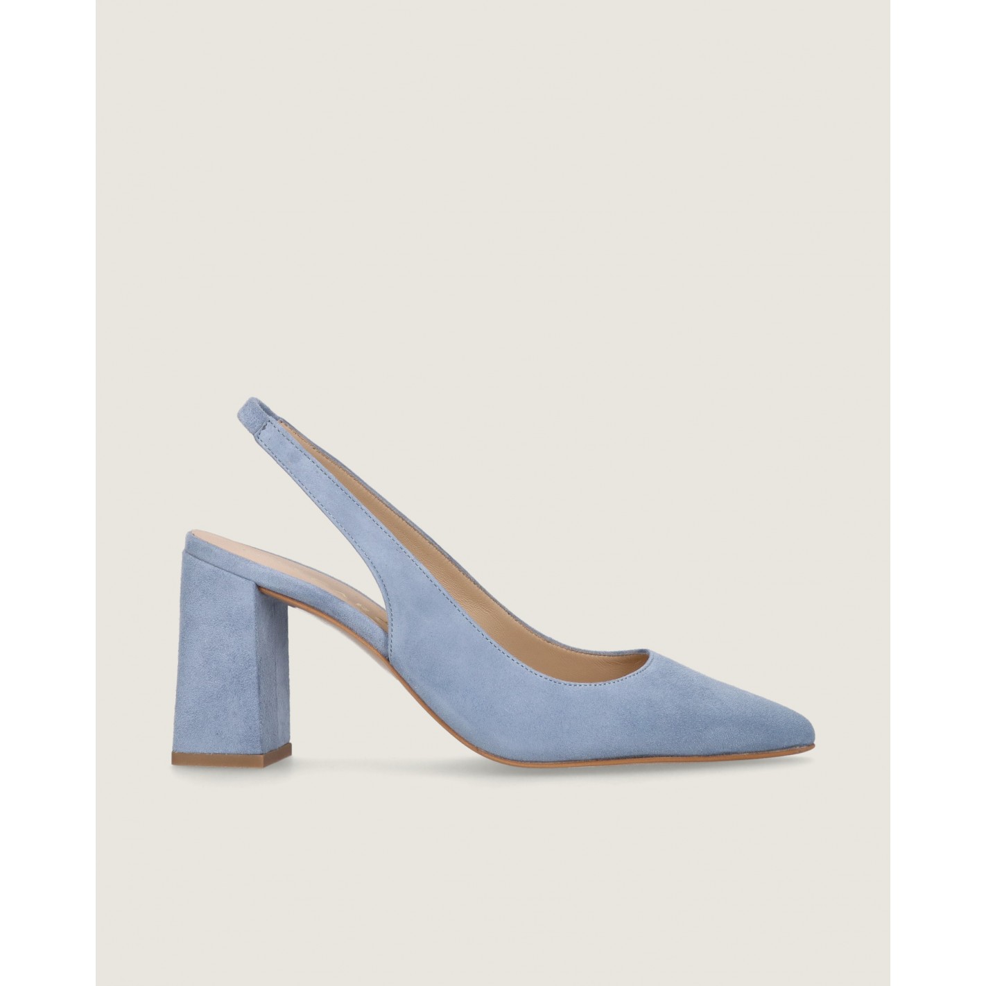 Slingback-Pumps Renata mit spitz zulaufender Kappe und 8 cm hohem Absatz aus weichem Denim-Blau Wildleder mit Gummisohle, Lederinnensohle und -futter.