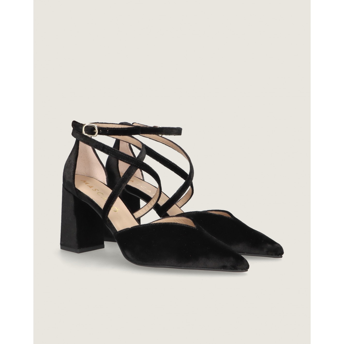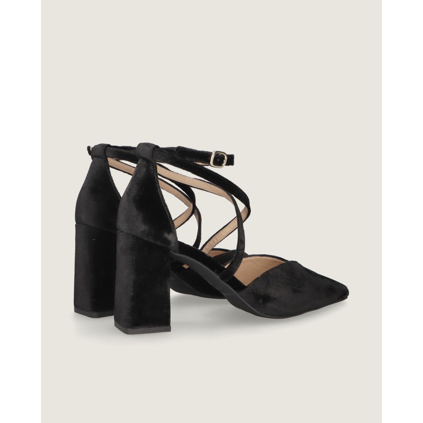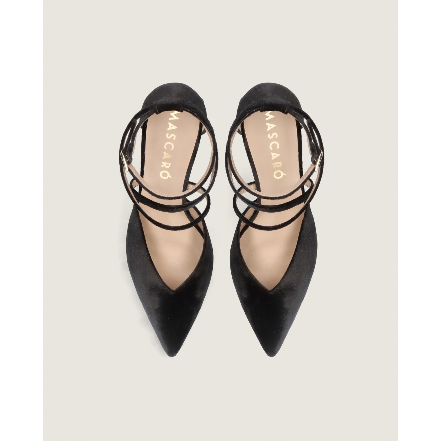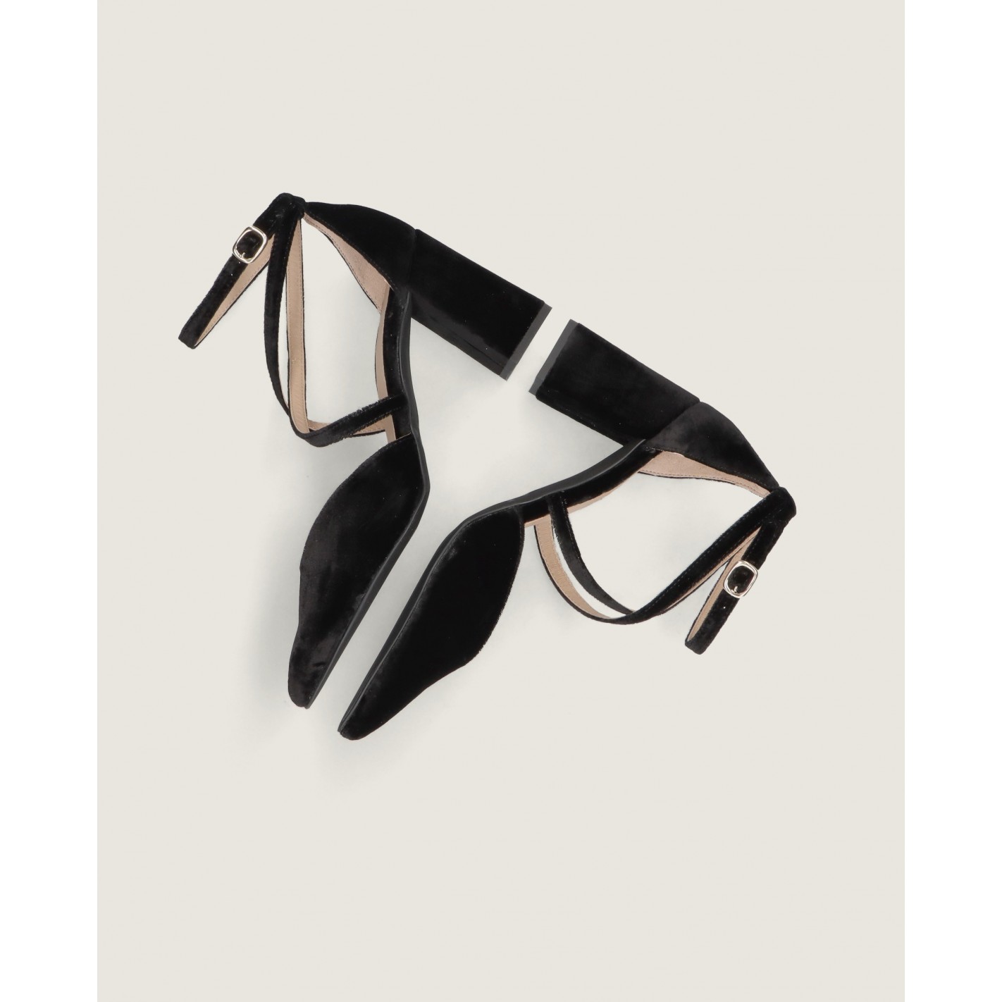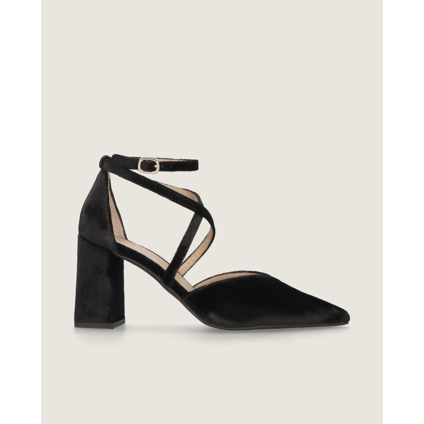 Salón destalonado de punta fina modelo Renata en terciopelo negro con tacón de 8cm, suela de goma, plantilla y forro de piel.