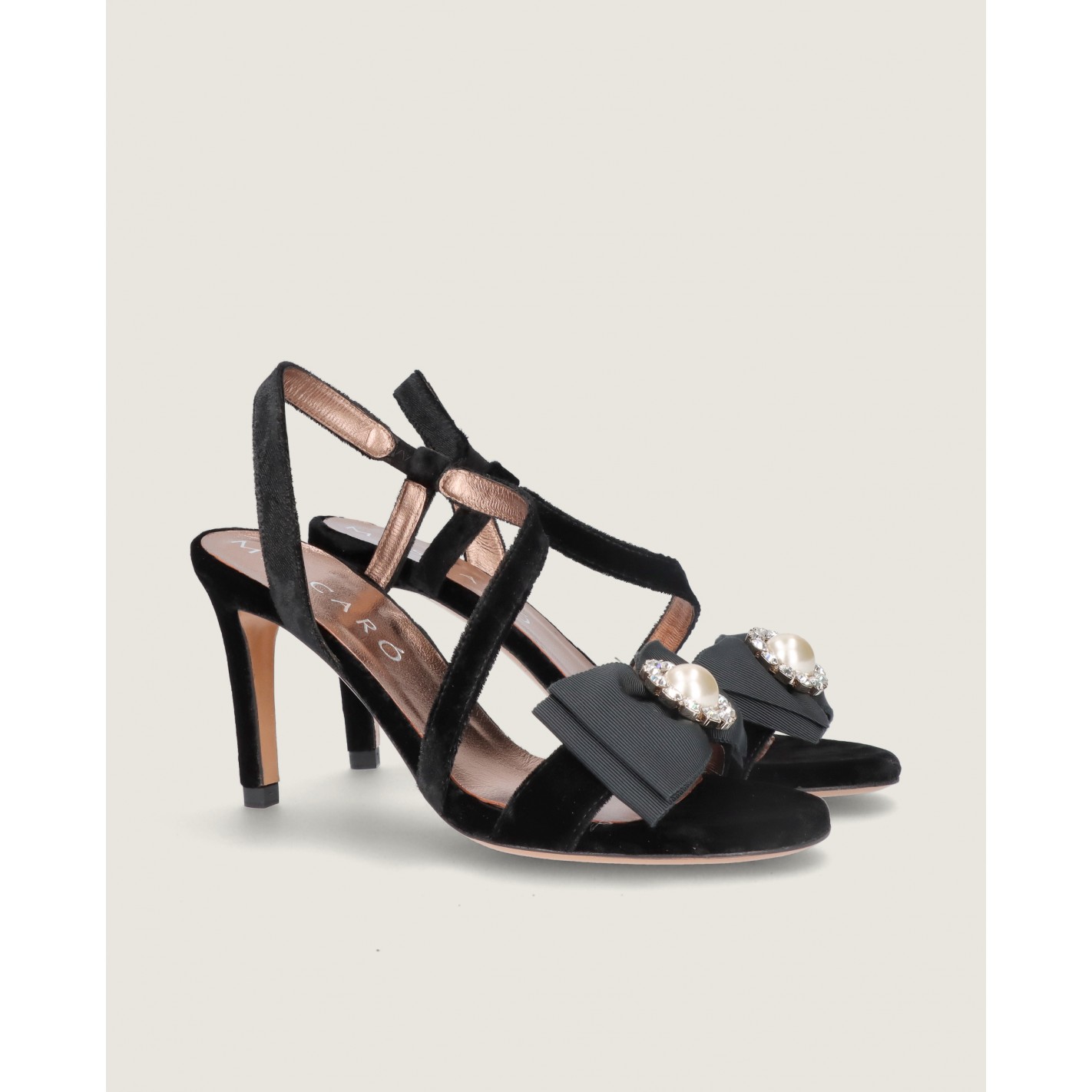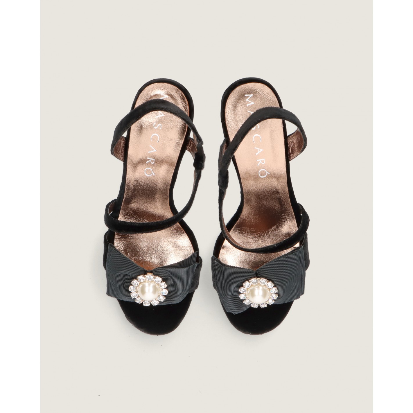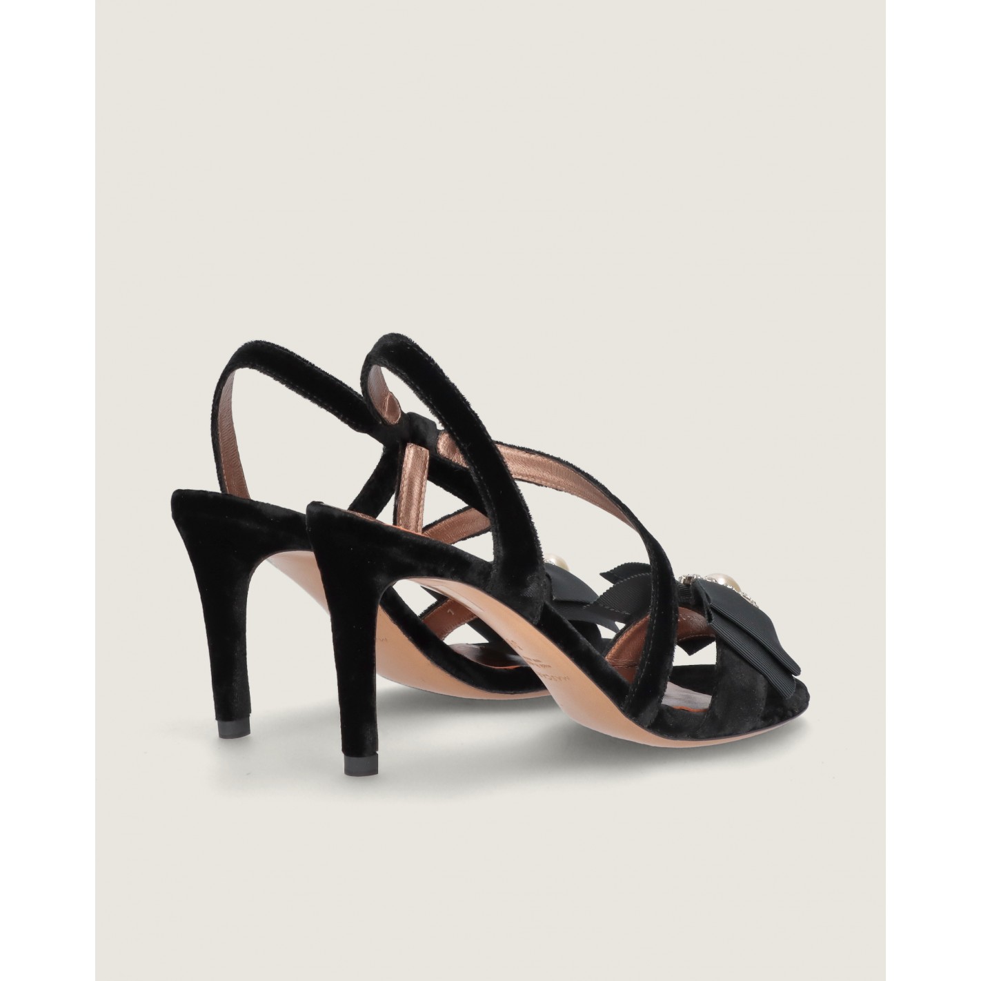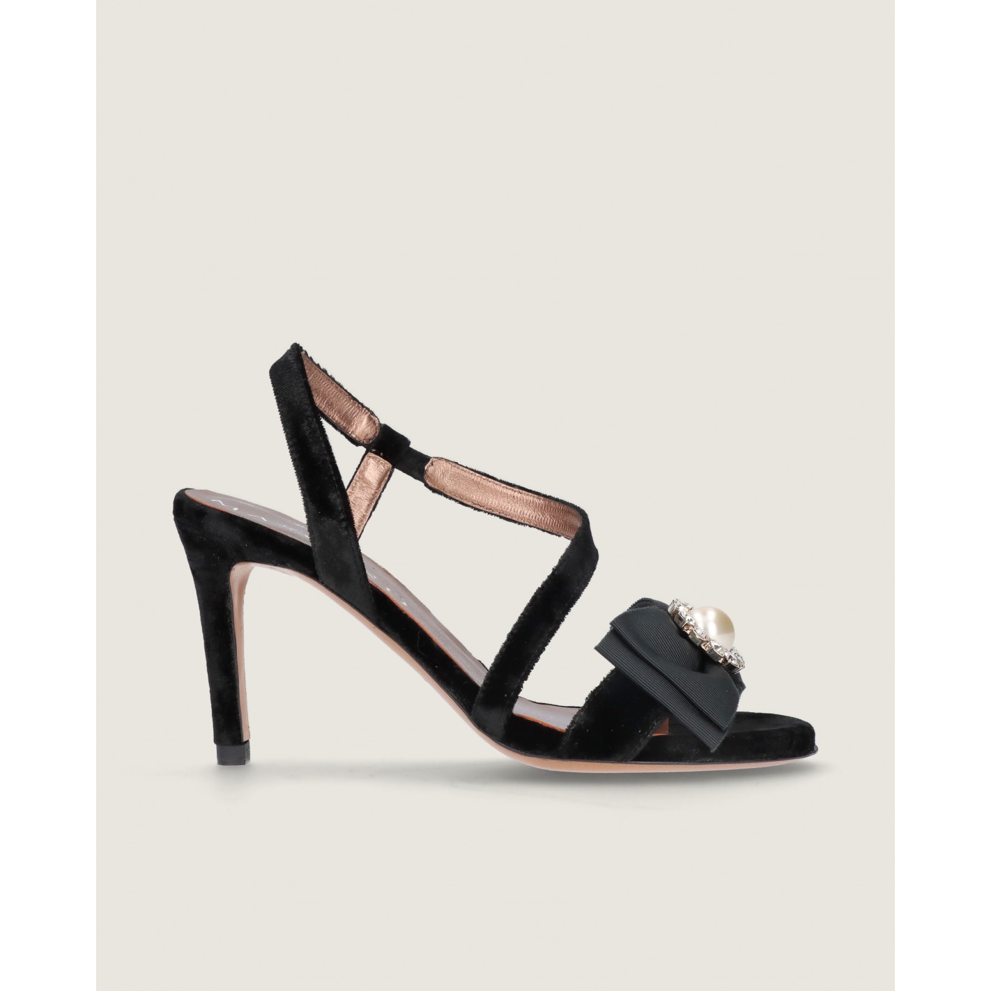 Black velvet women's sandals, topped with a large bow and crystal and pearl brooch. The 10cm heel adds height without losing comfort or elegance.