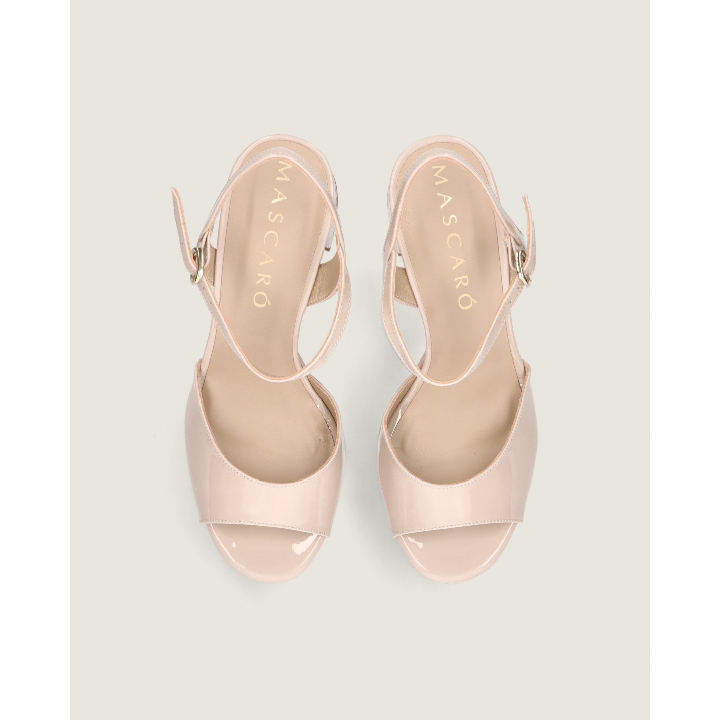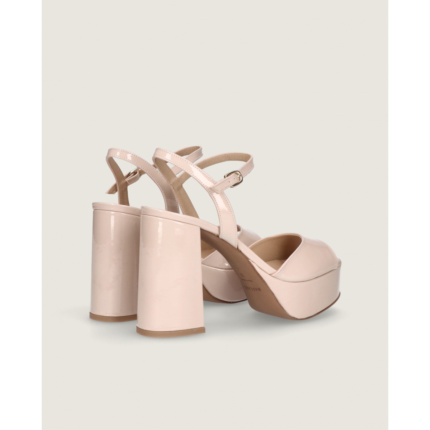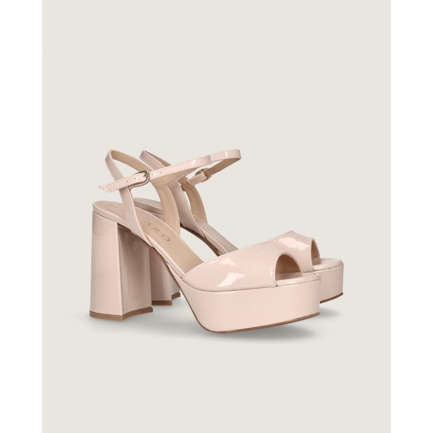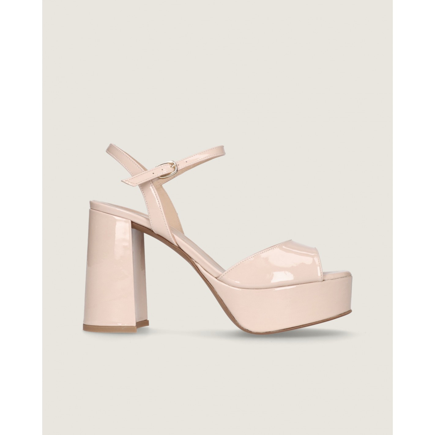 Sandal Ruth with a 10.5cm heel and ankle strap in makeup pink patent leather with rubber sole, leather insole and lining.