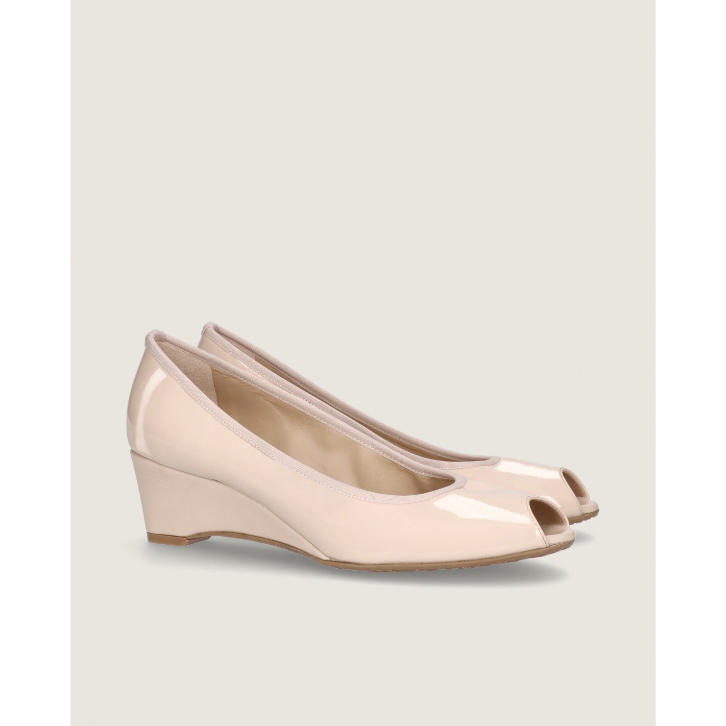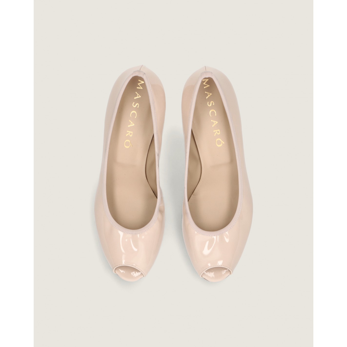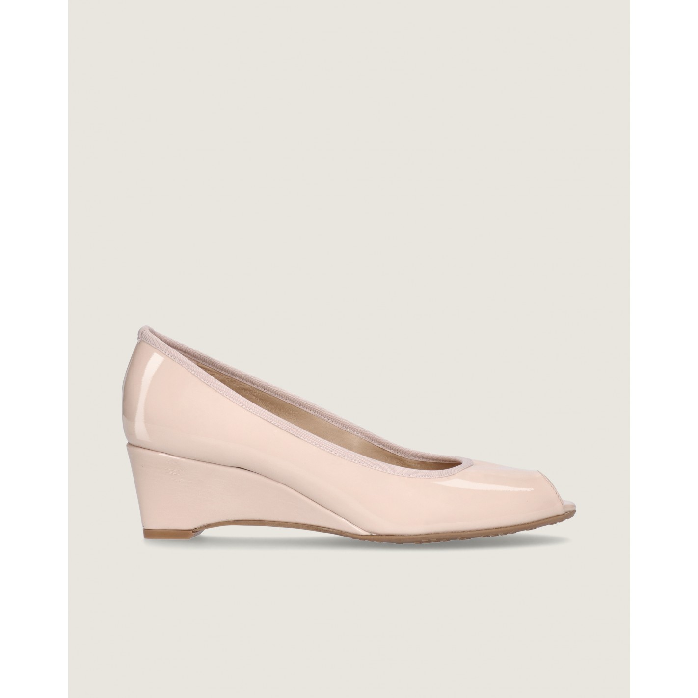 Peep toe Rose with a 5cm heel in makeup pink patent leather with rubber sole, leather insole and lining.