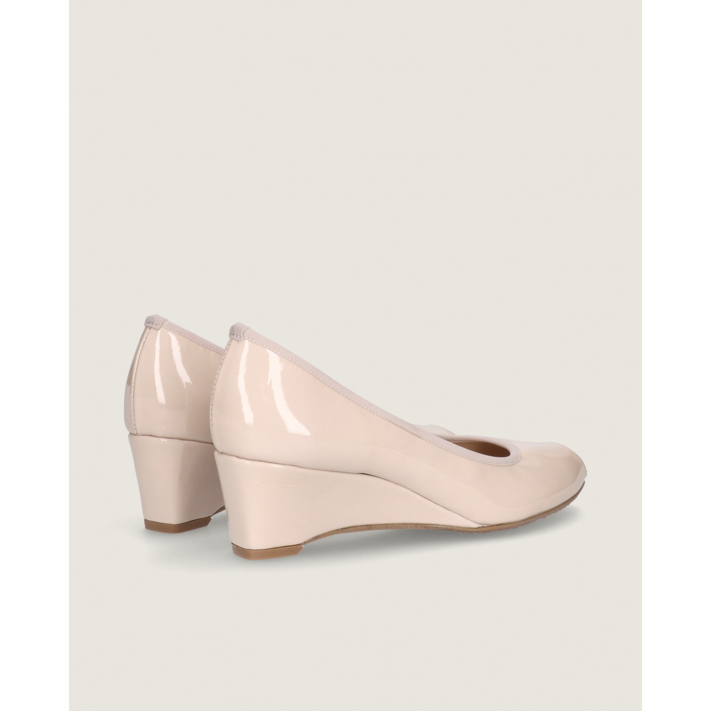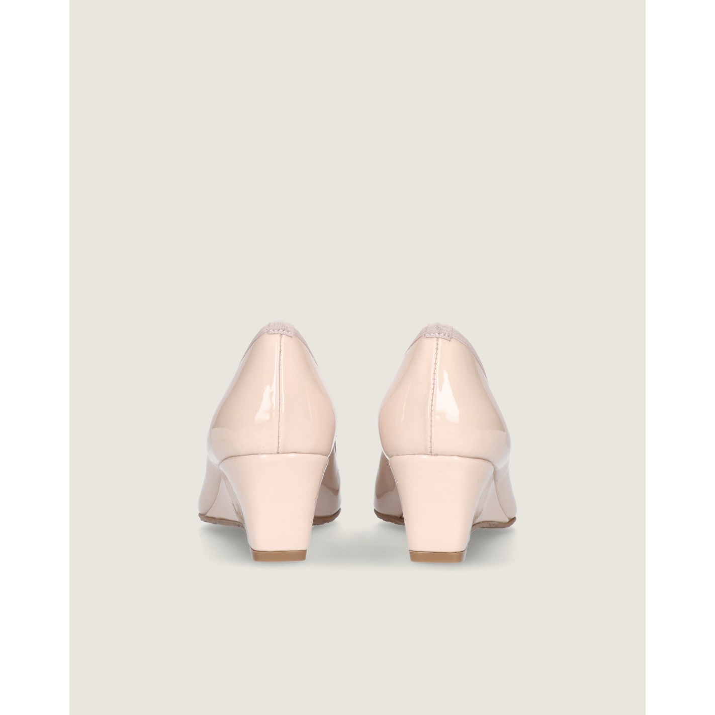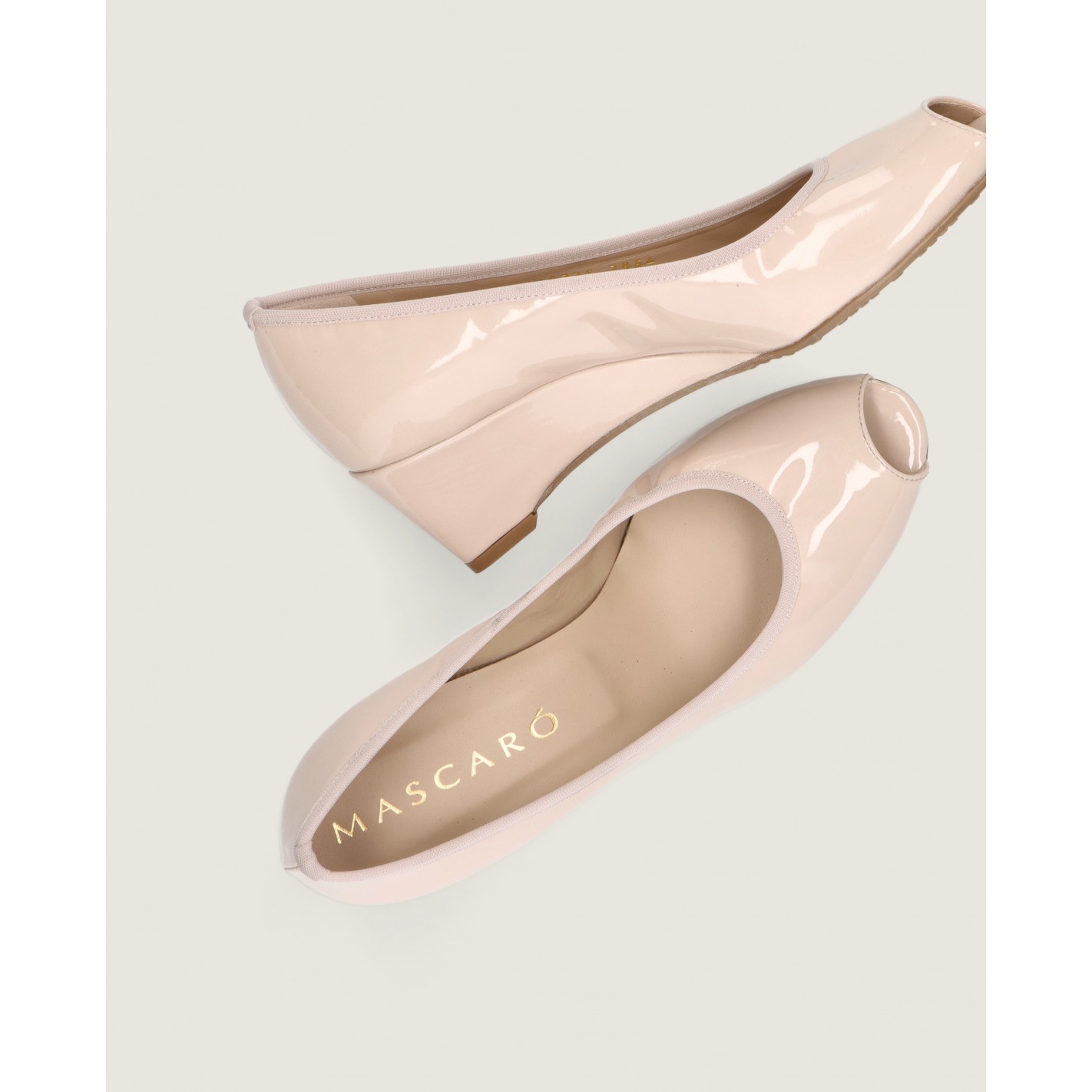Peep toe Rose with a 5cm heel in makeup pink patent leather with rubber sole, leather insole and lining.