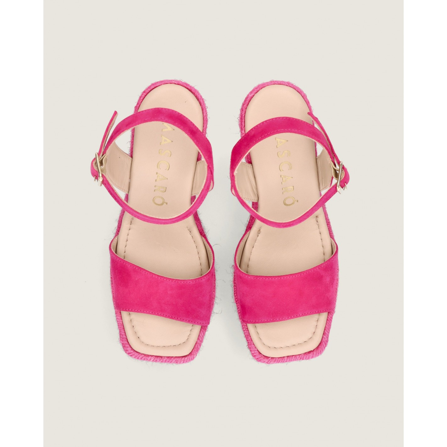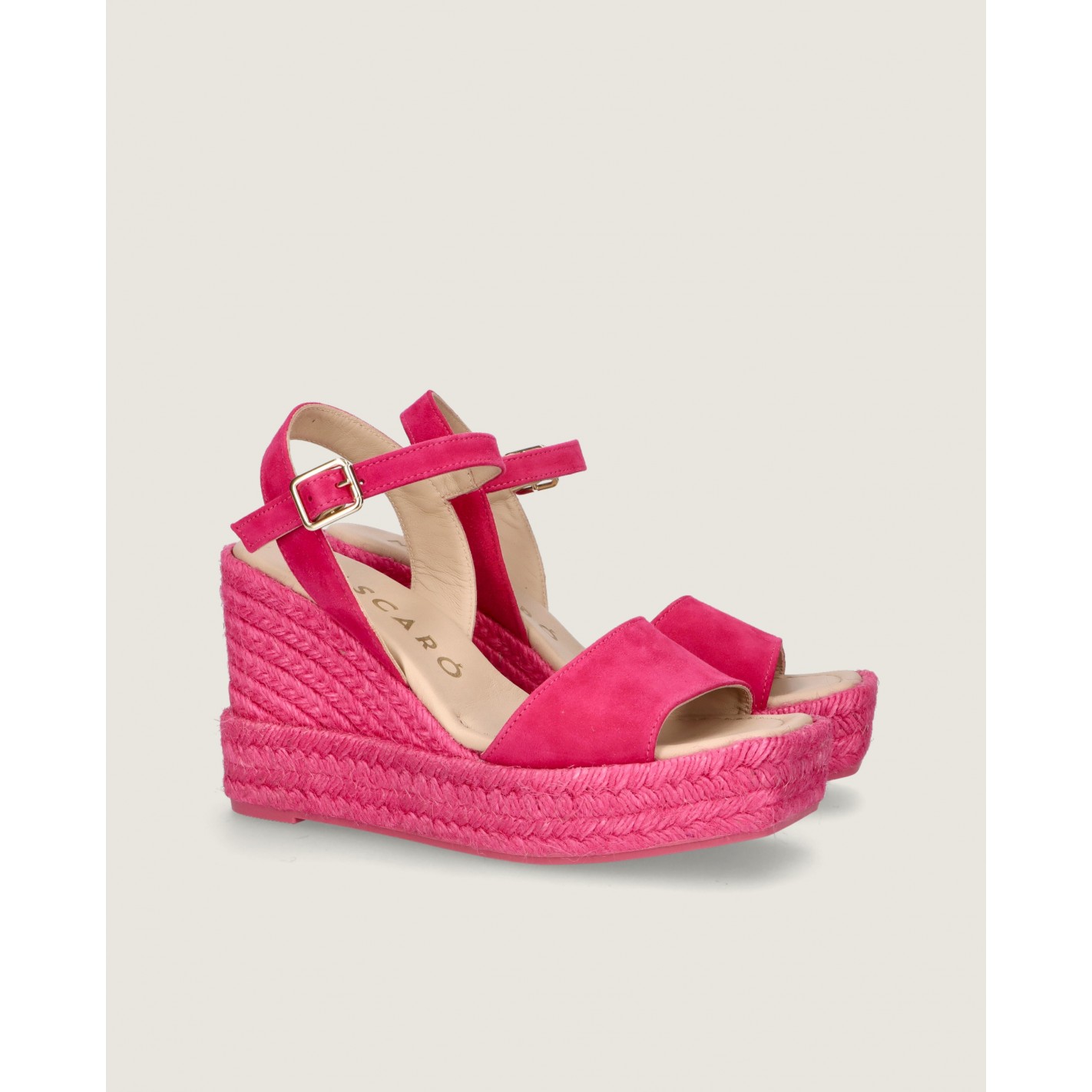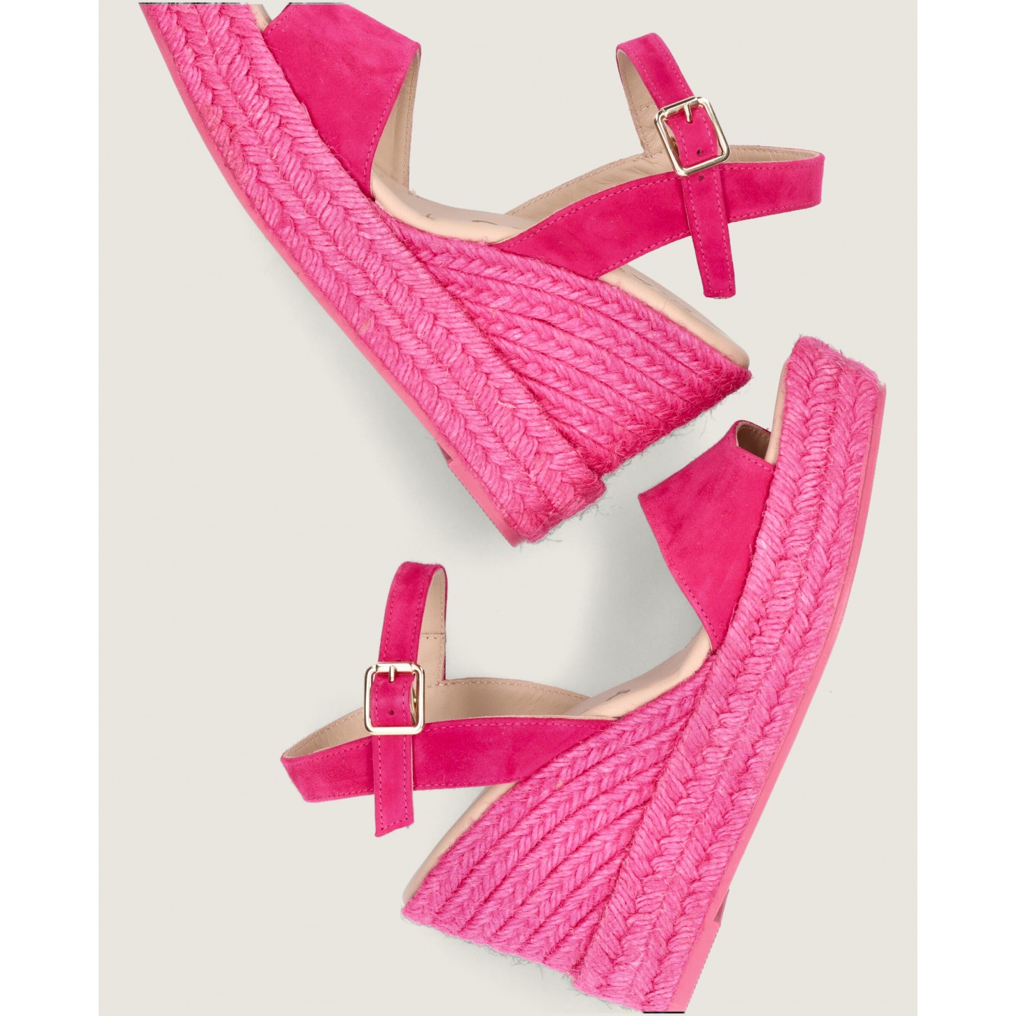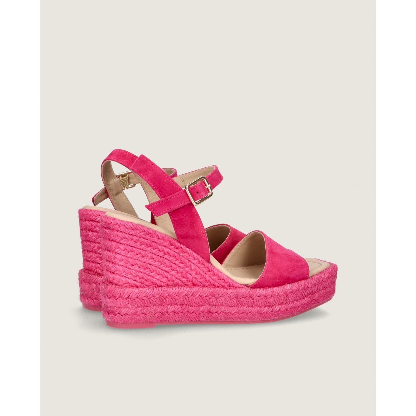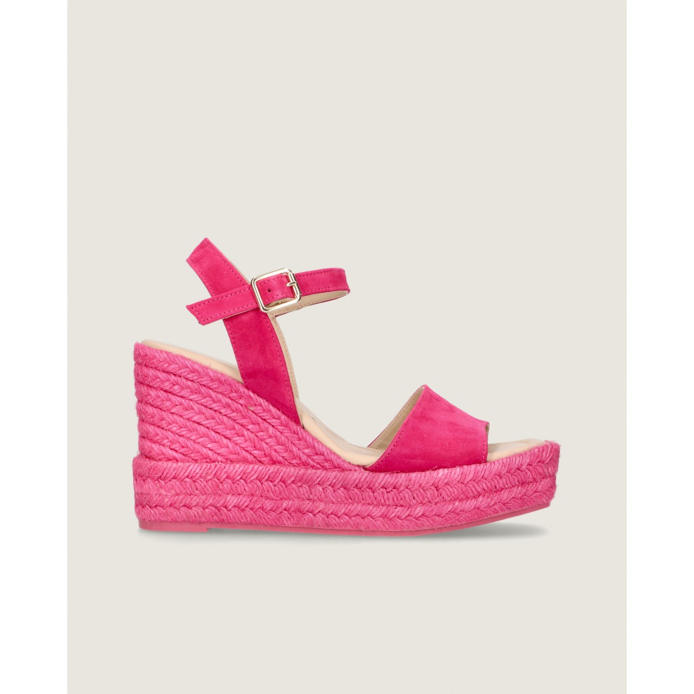 Espadrille Gloria with ankle strap and 10cm heel in soft fuchsia suede with rubber sole, leather insole and lining.