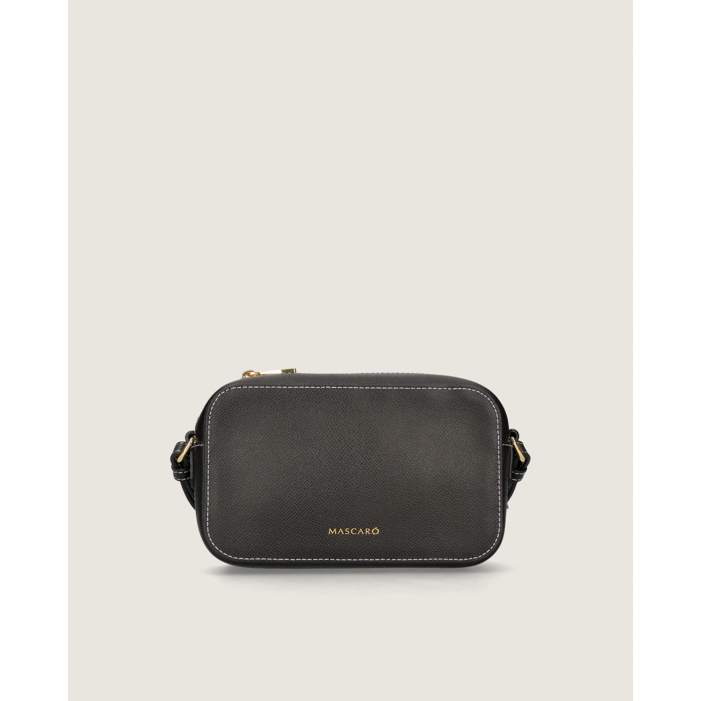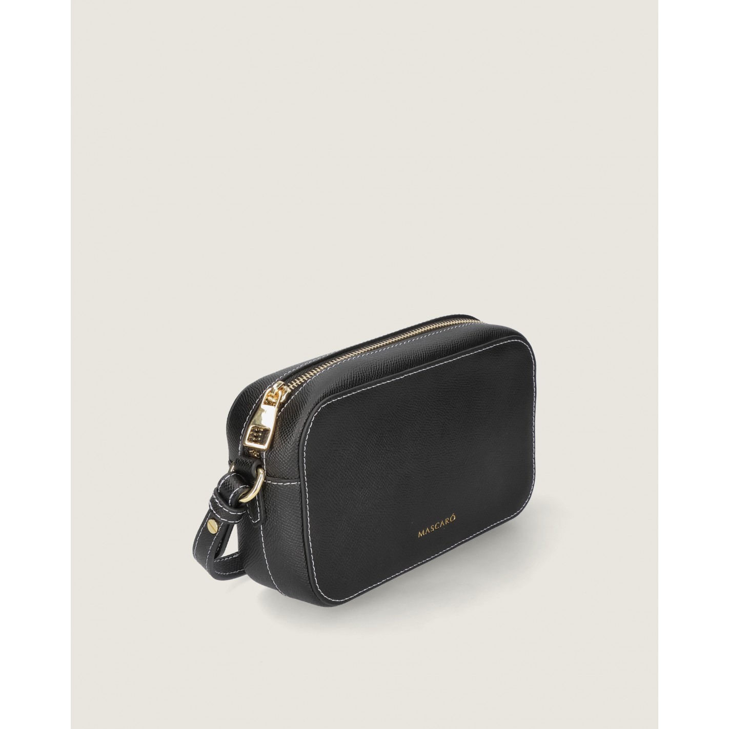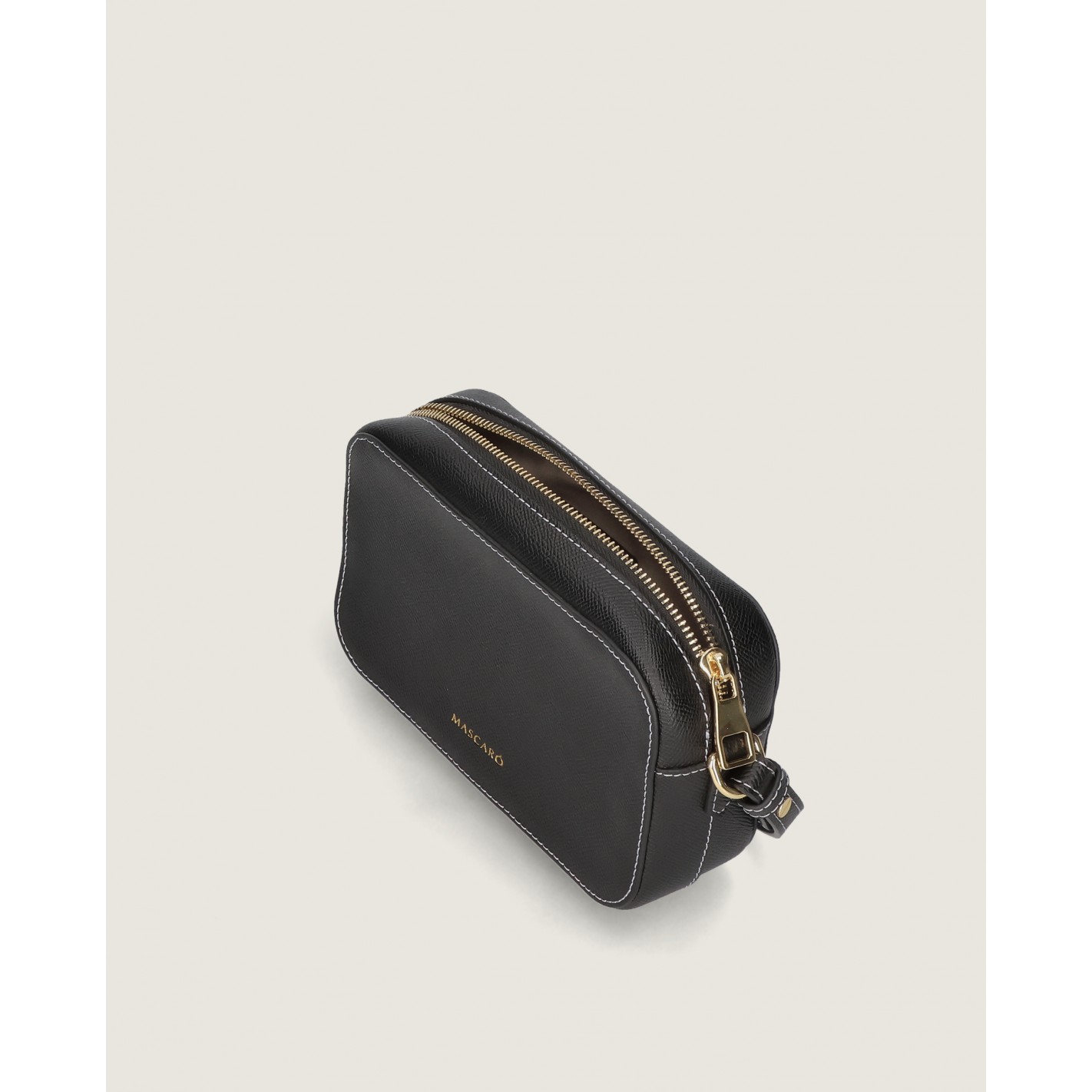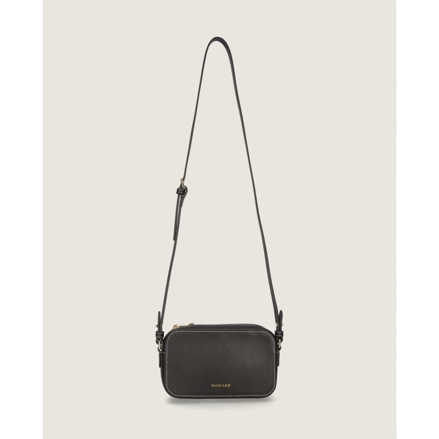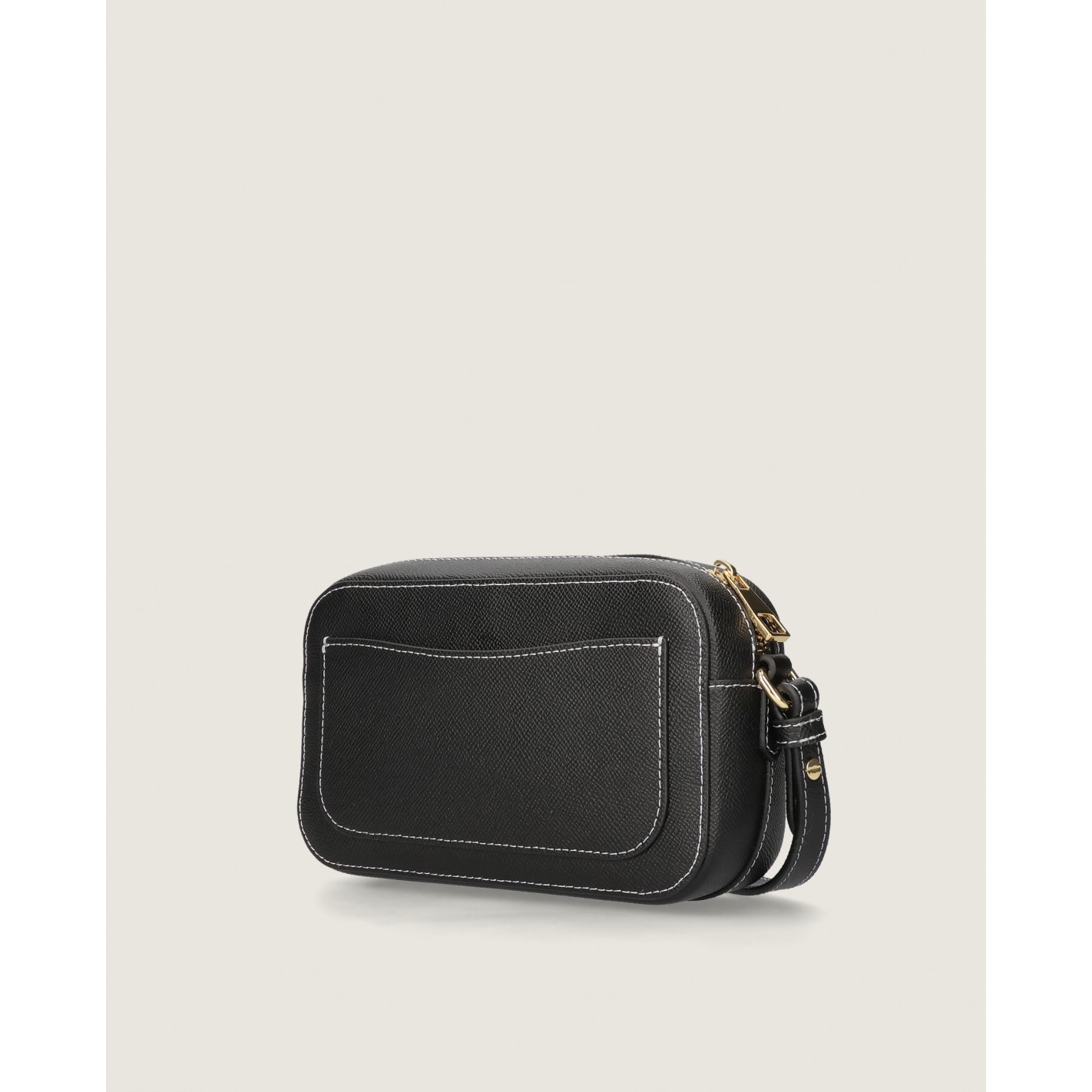 Mini bag Illa in black leather with essential and elegant lines. Its structured and versatile design allows it to be carried with the crossbody strap, it is completed with a zipper closure and the golden logo decoration on the front. On the back it is characterized by a small easy-access pocket for small objects. 12cm x 20cm x 5.5cm (Height x Length x Width).
