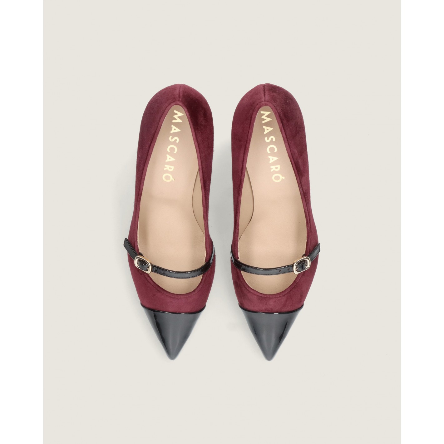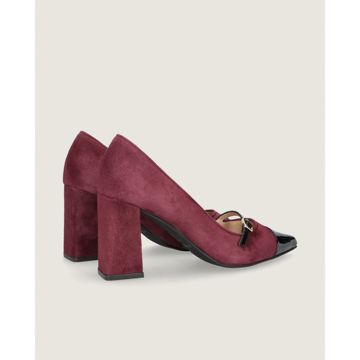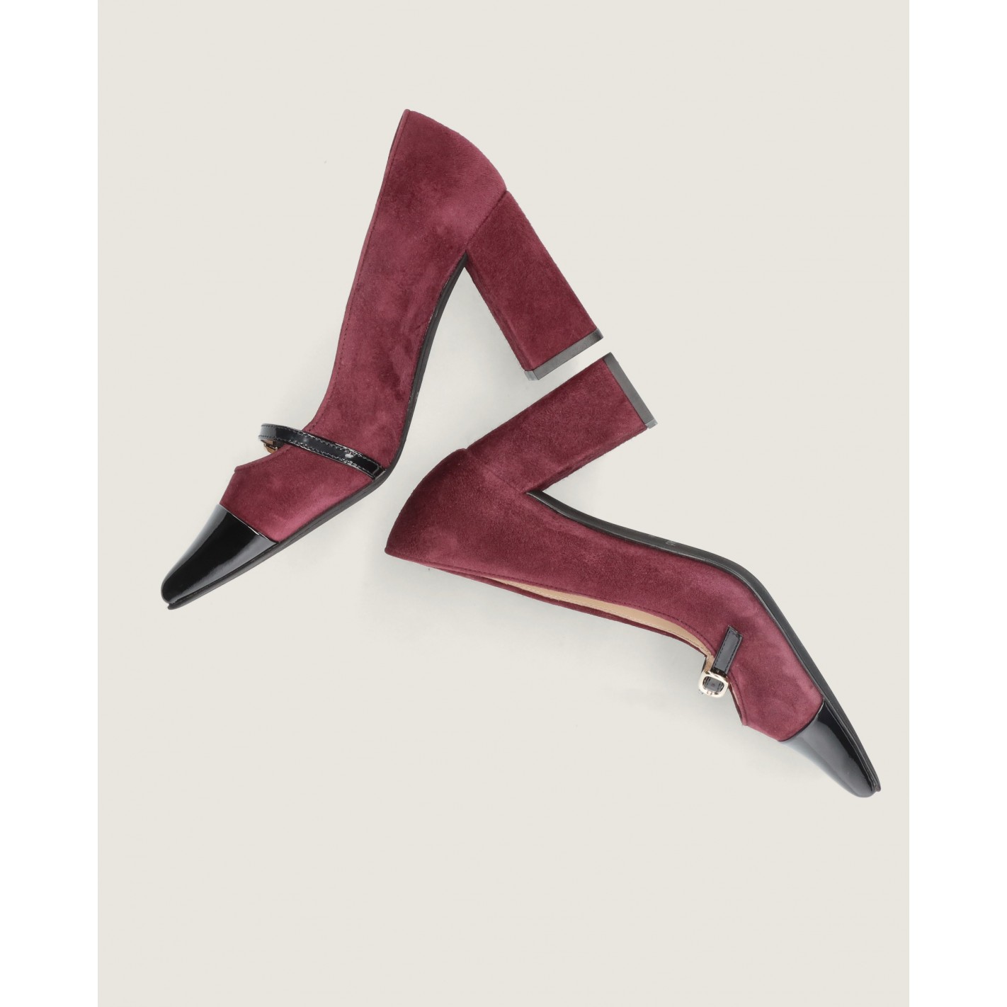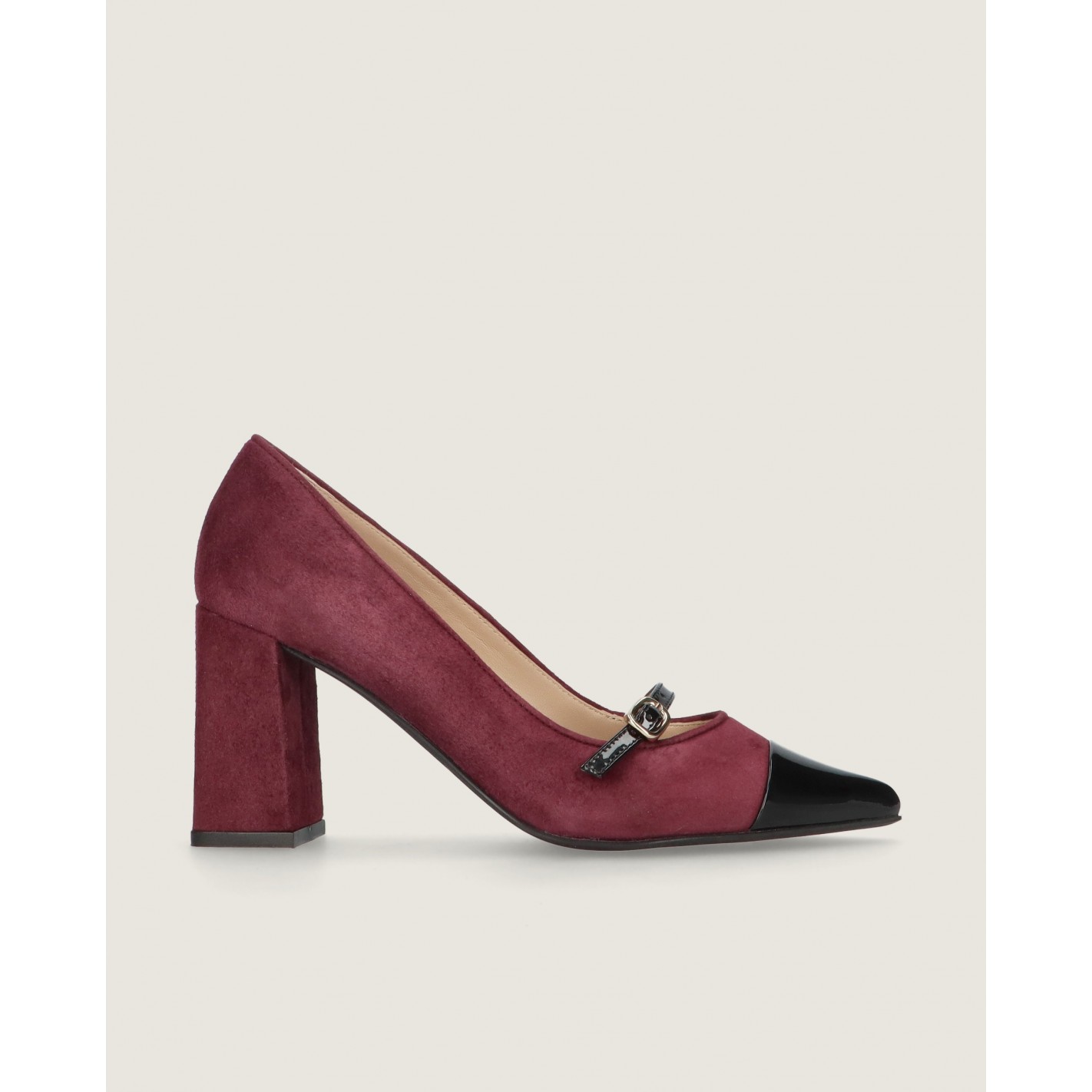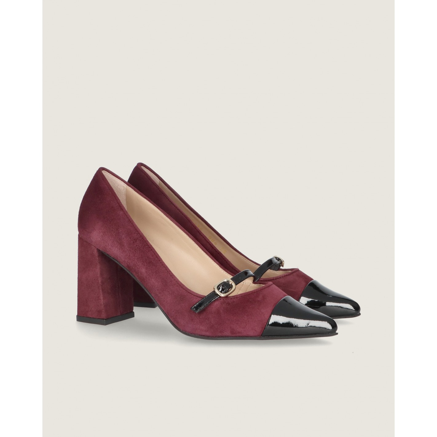 Renata pointed-toe pumps in soft dark red suede with black patent leather toecap and instep strap, 8cm heel, rubber sole, leather insole and lining.