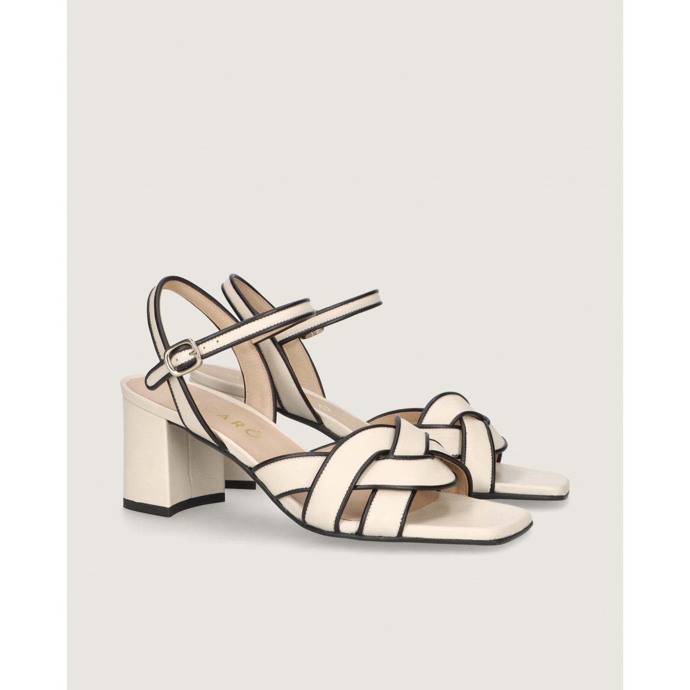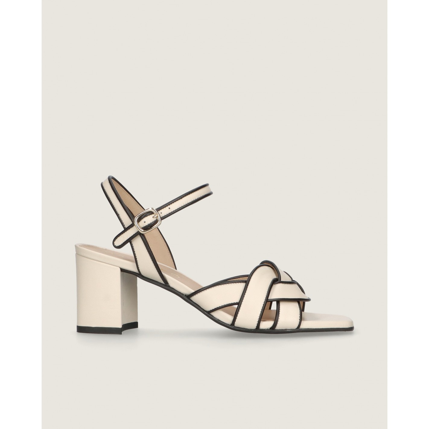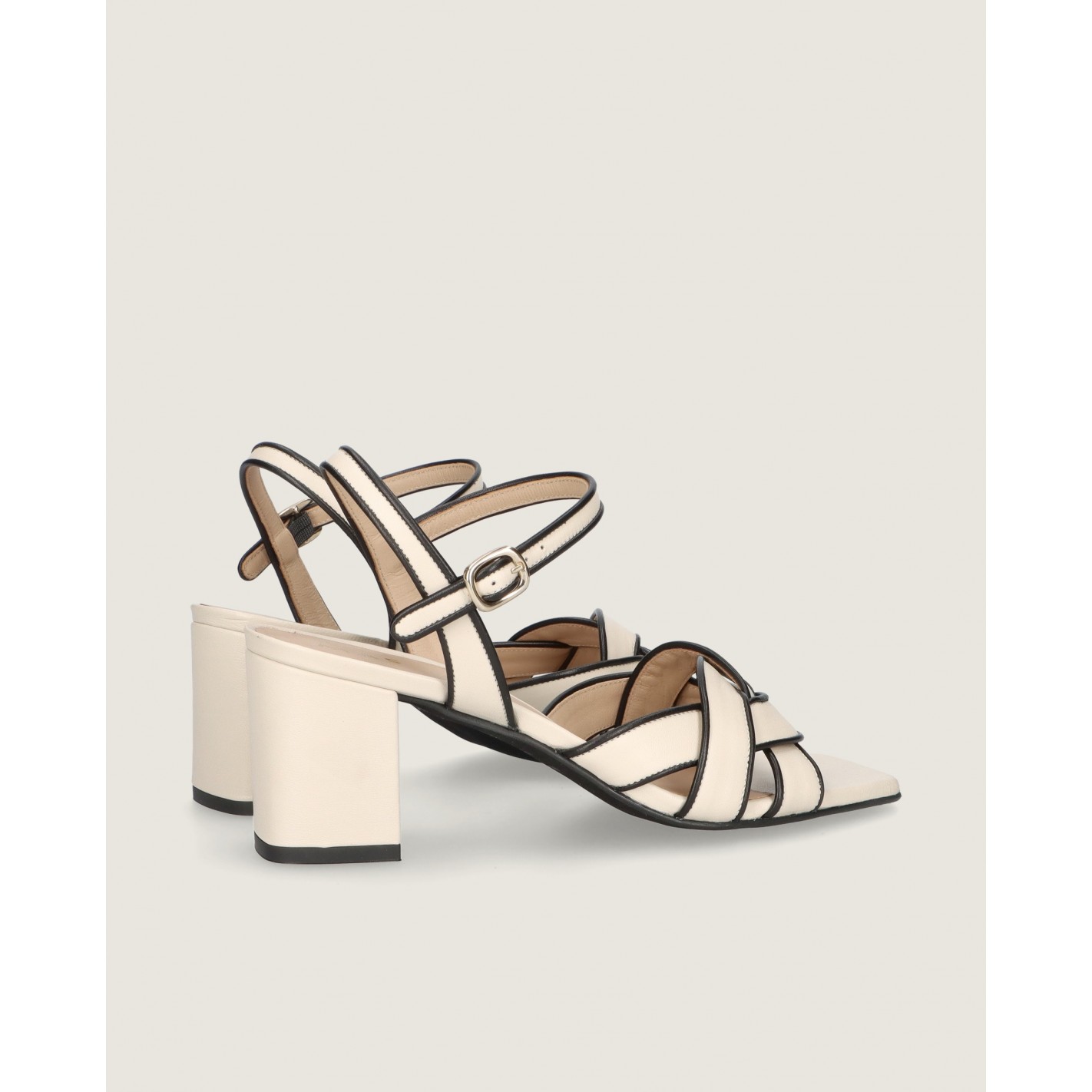 Sandal Annie with a square toe and 6.5cm heel in soft ivory leather featuring black leather trim, rubber sole, leather insole and lining.