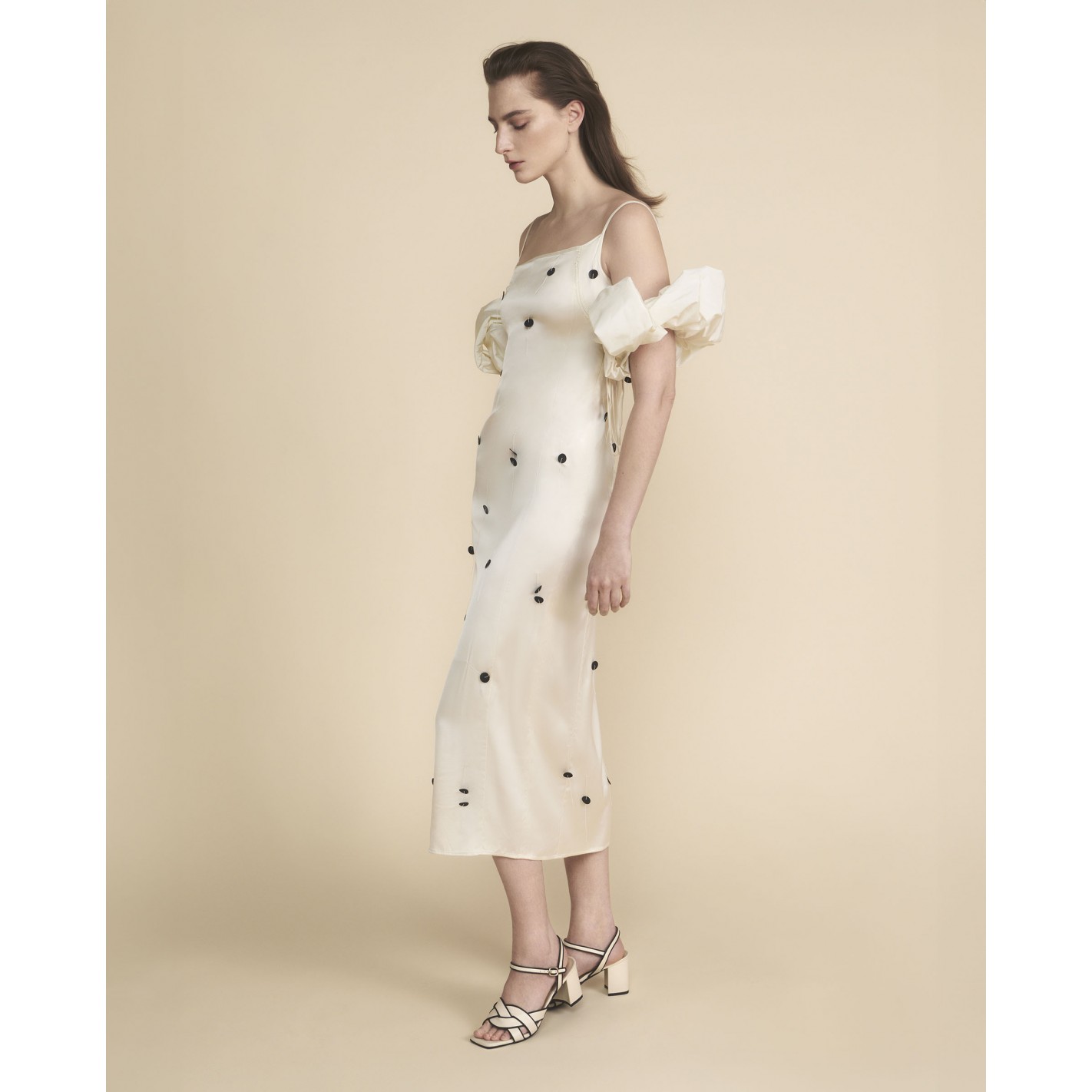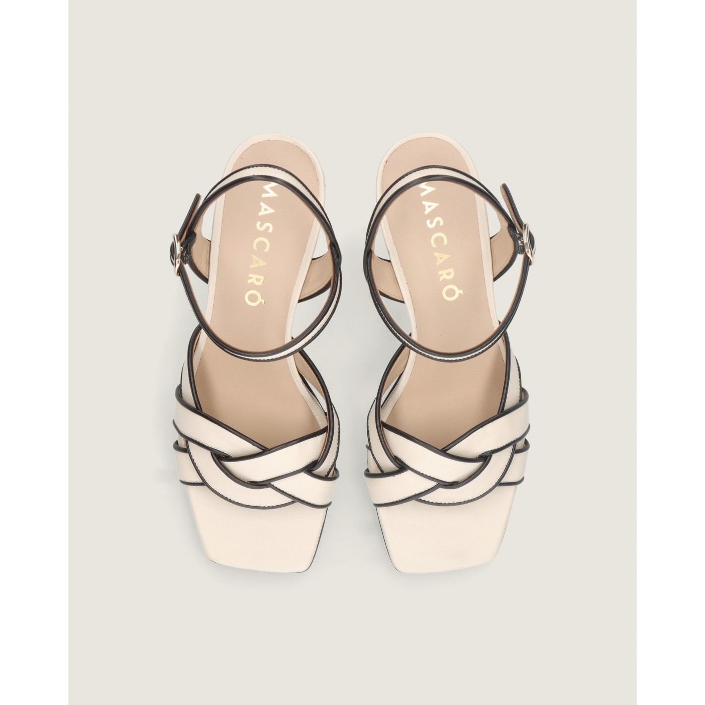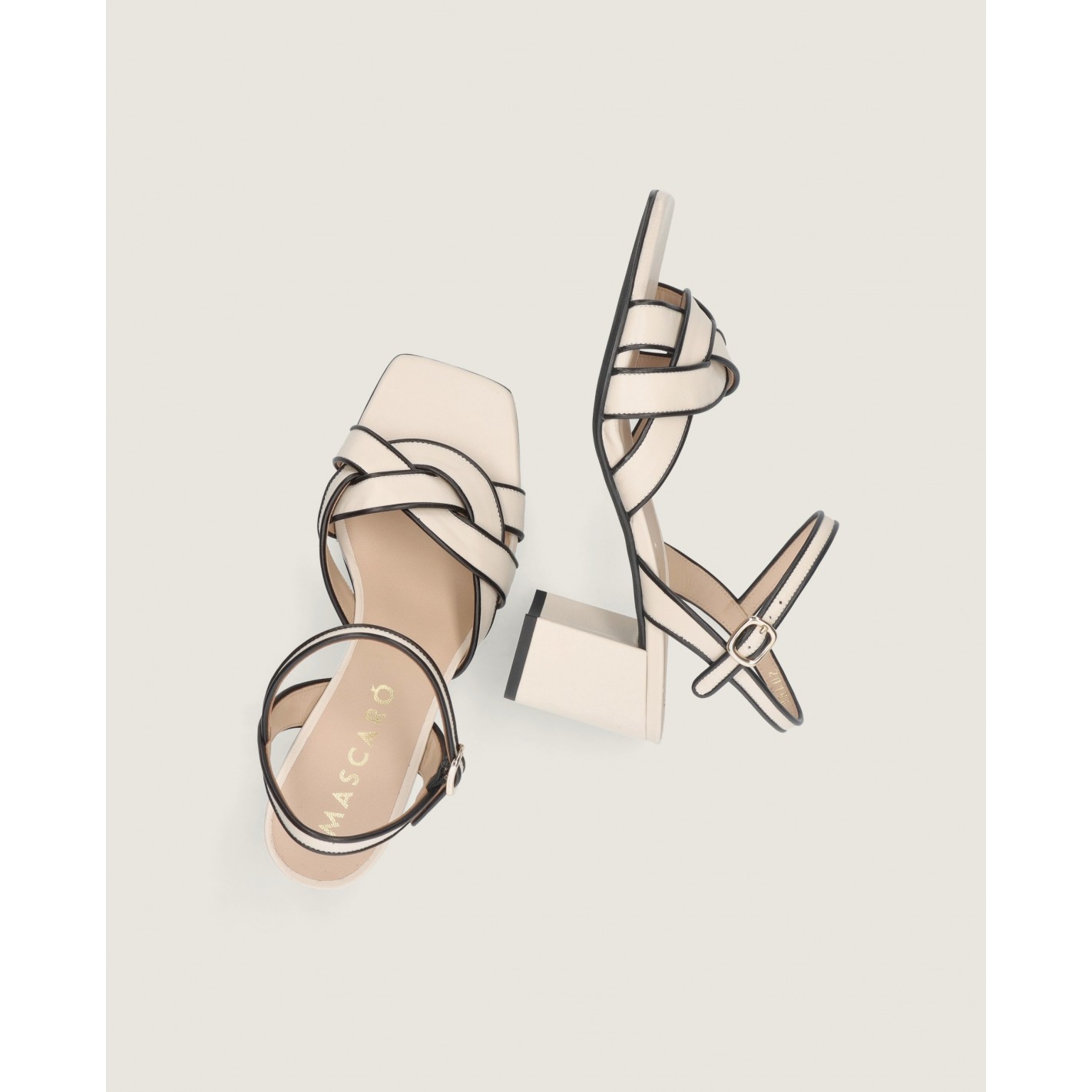 Sandal Annie with a square toe and 6.5cm heel in soft ivory leather featuring black leather trim, rubber sole, leather insole and lining.
