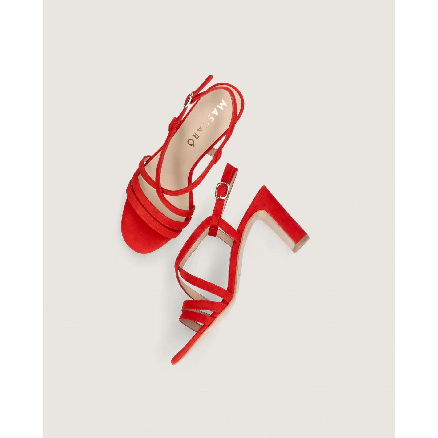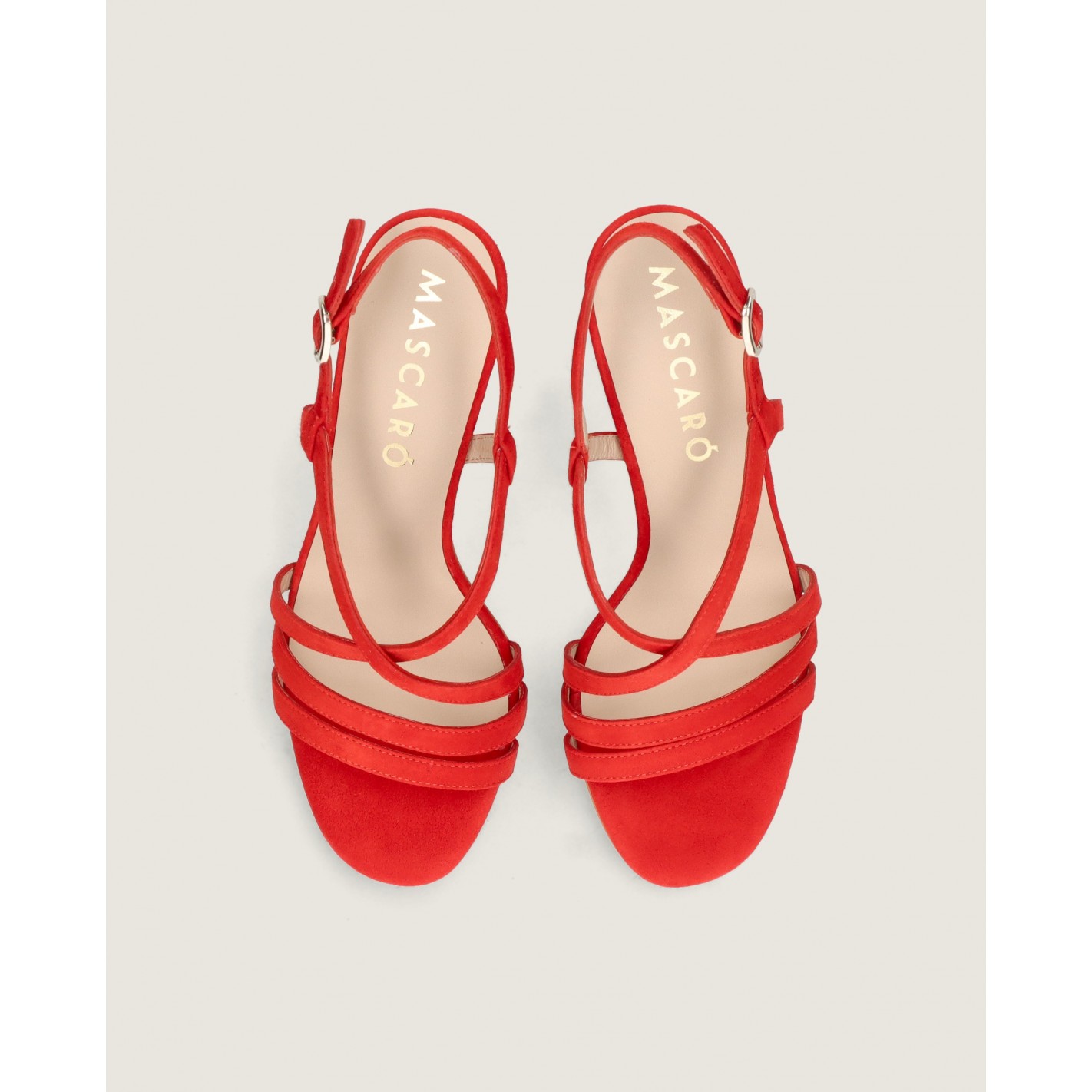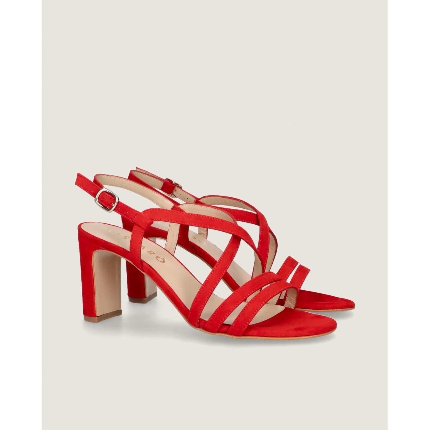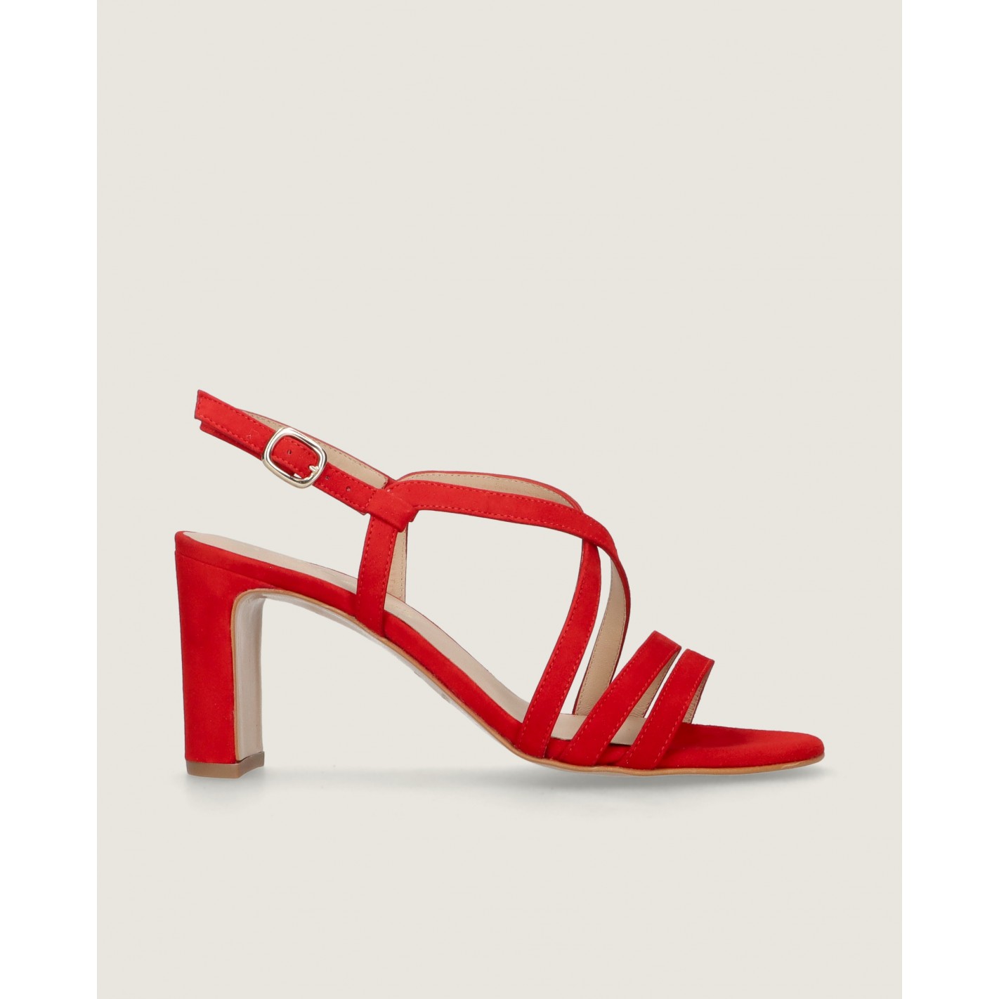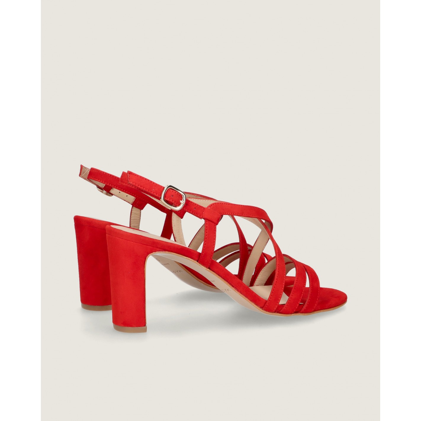 Sandal Maria with ankle strap and 8cm heel in soft red suede with rubber sole, leather insole and lining.