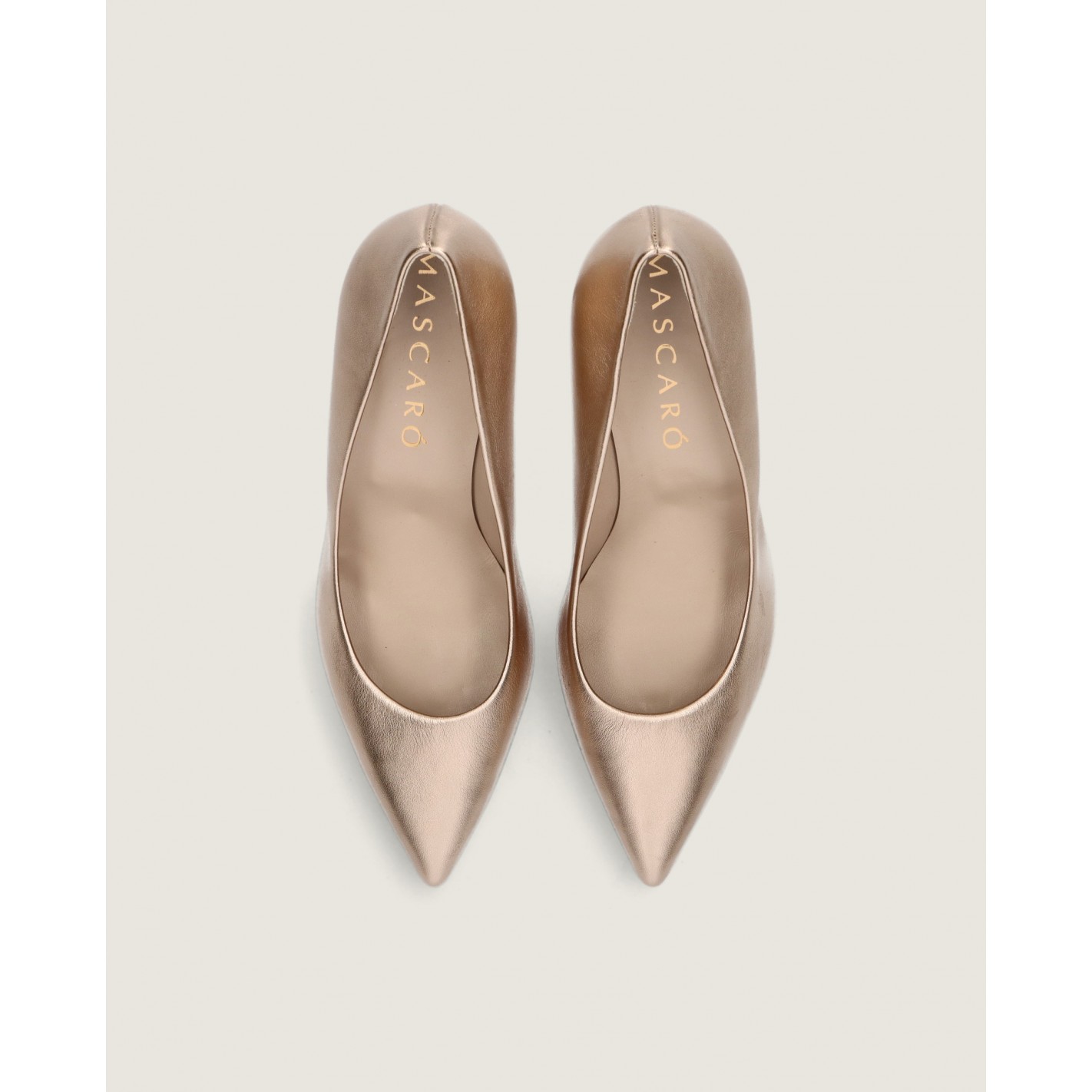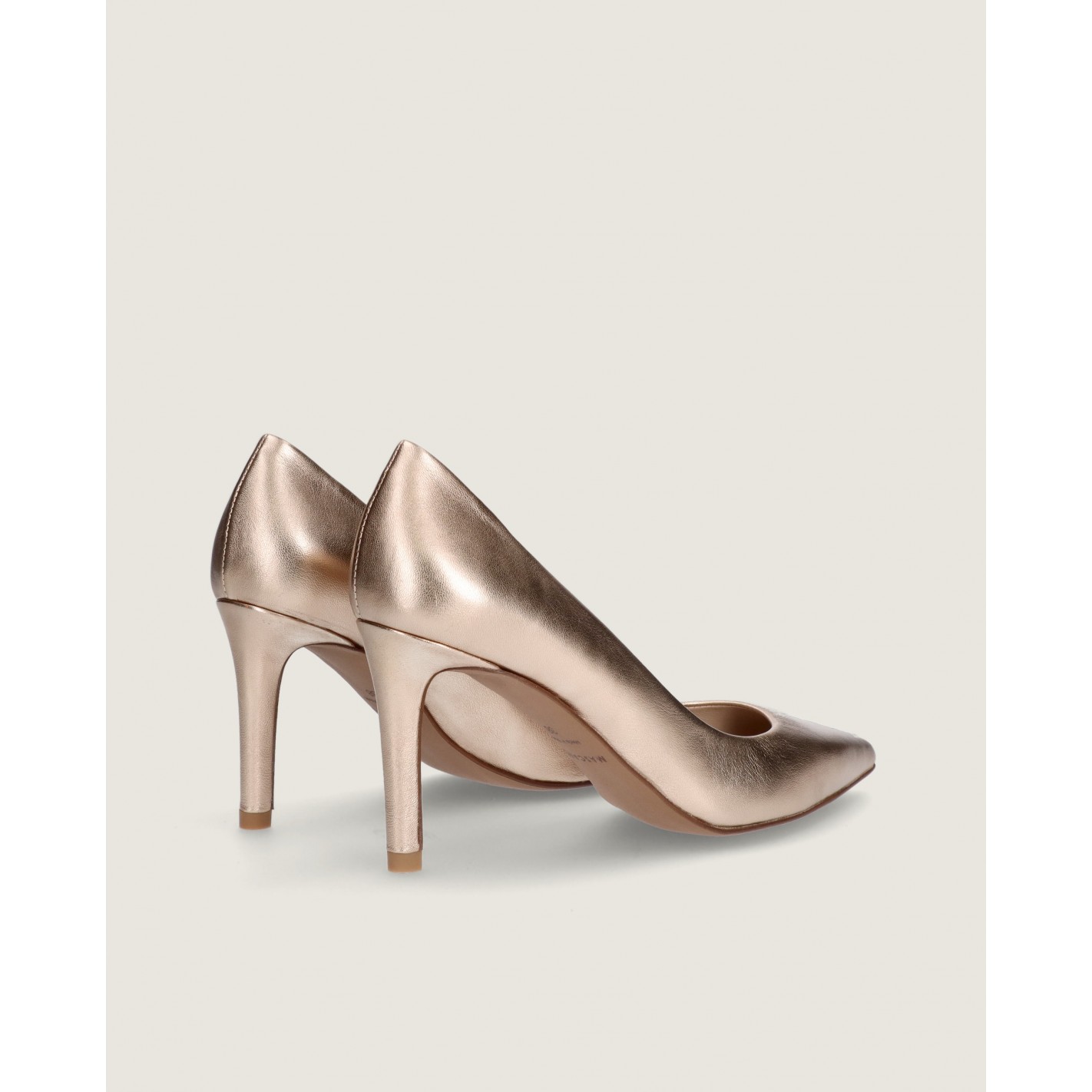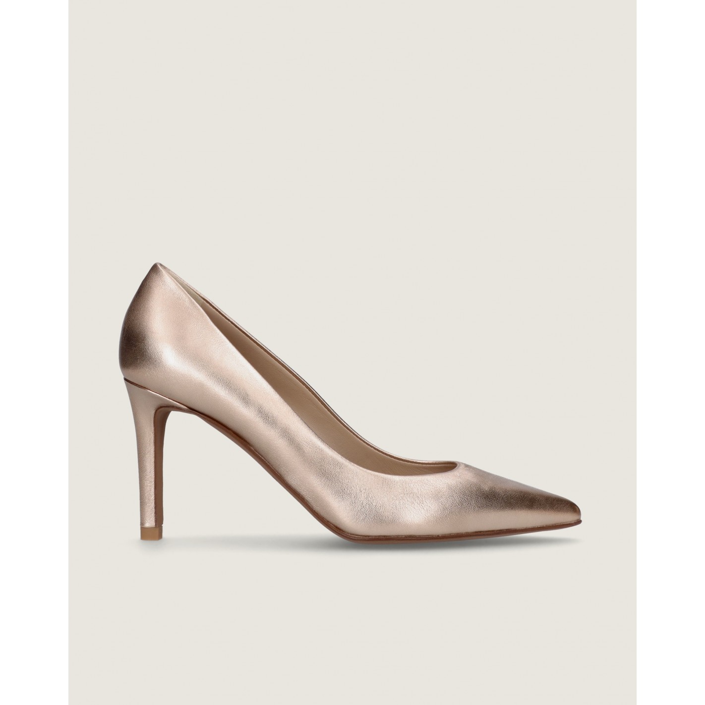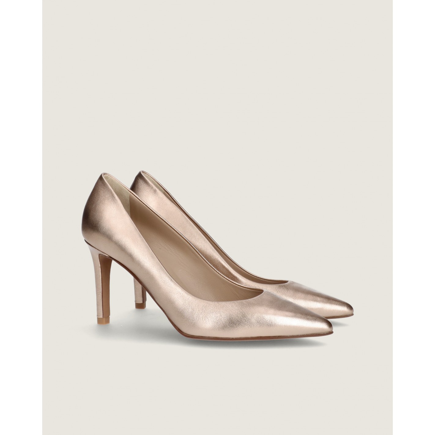 Salón de punta fina modelo Renata en napa nude metalizada con tacón de 8cm, suela de goma, plantilla y forro de piel