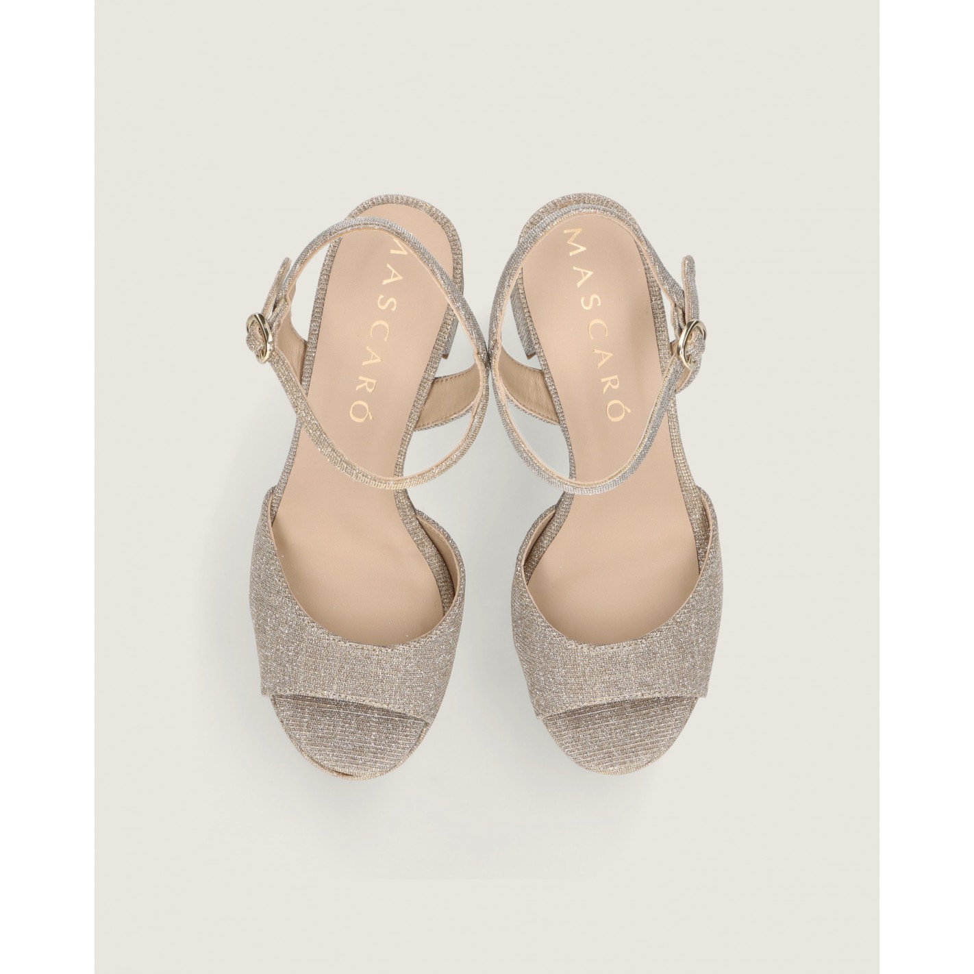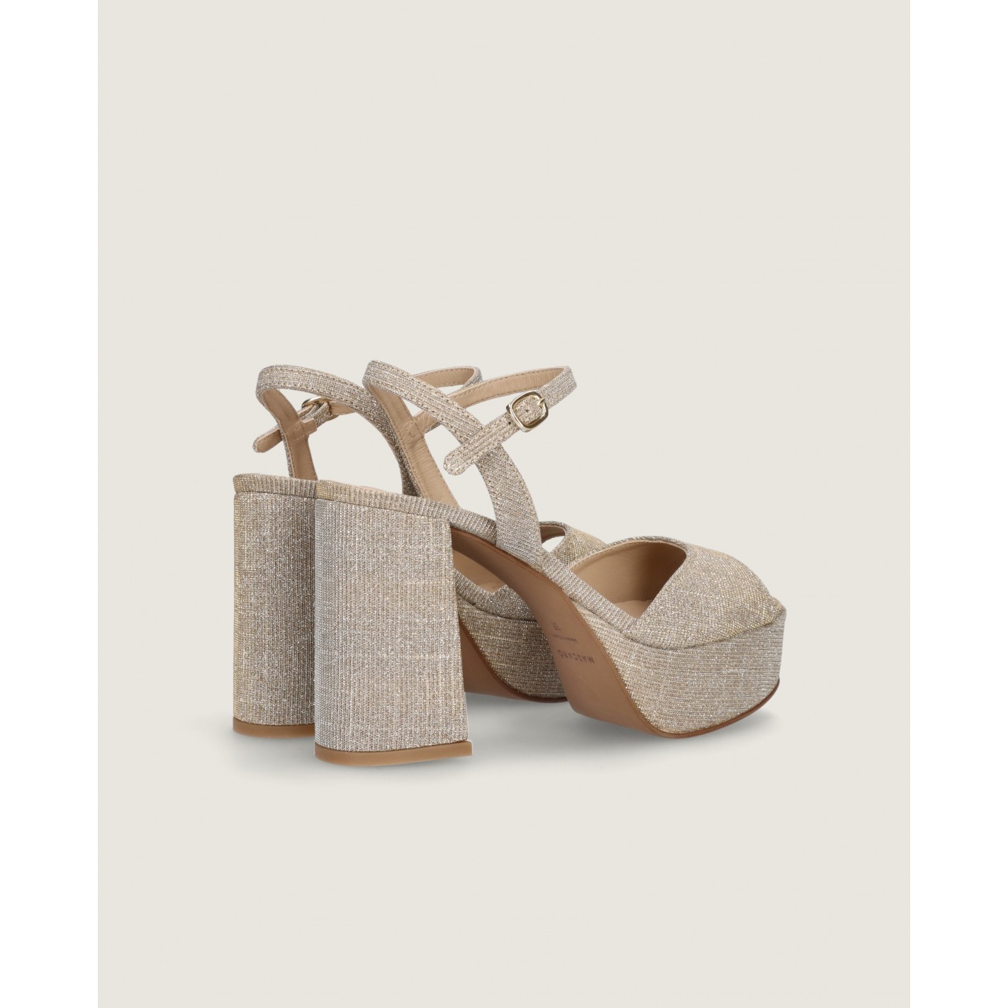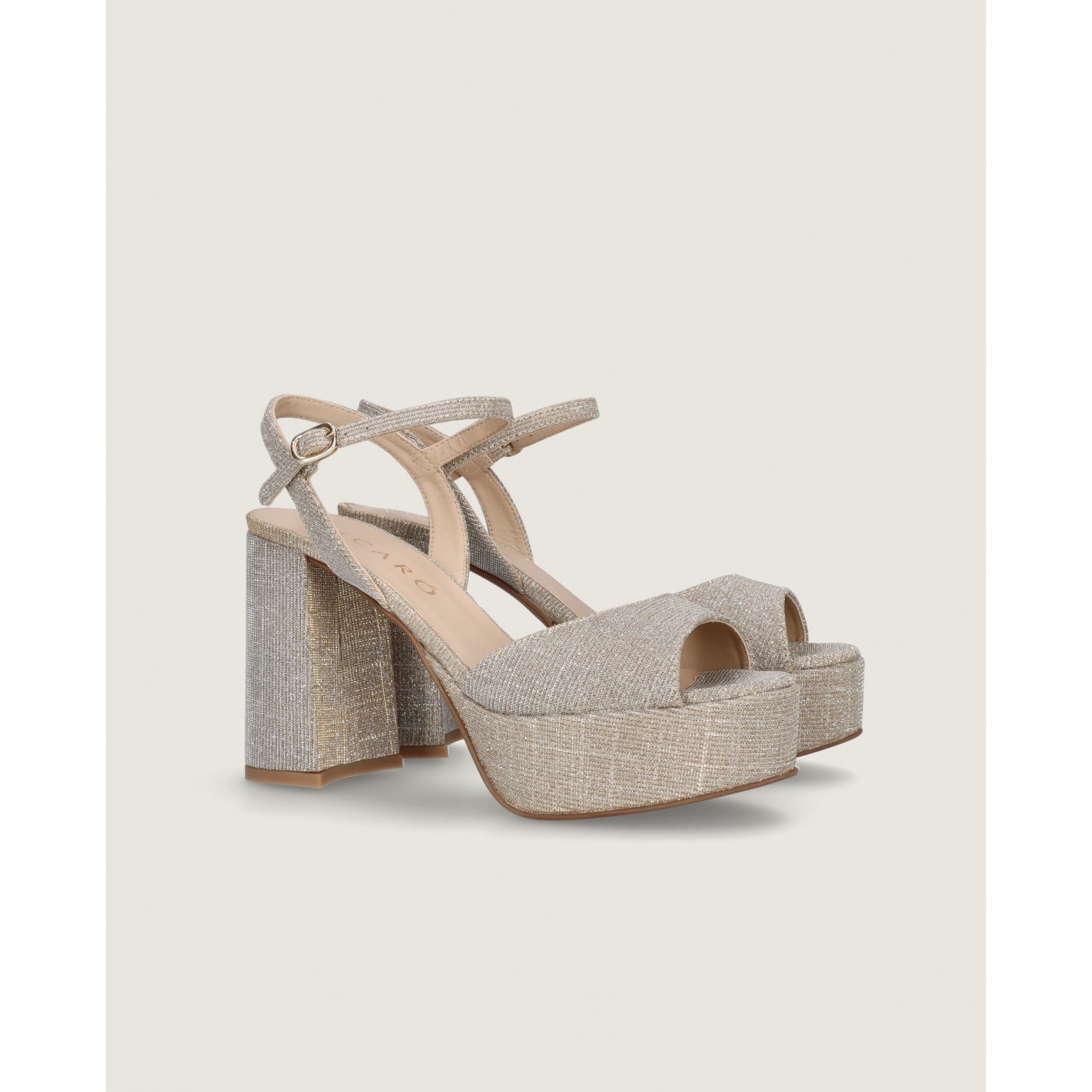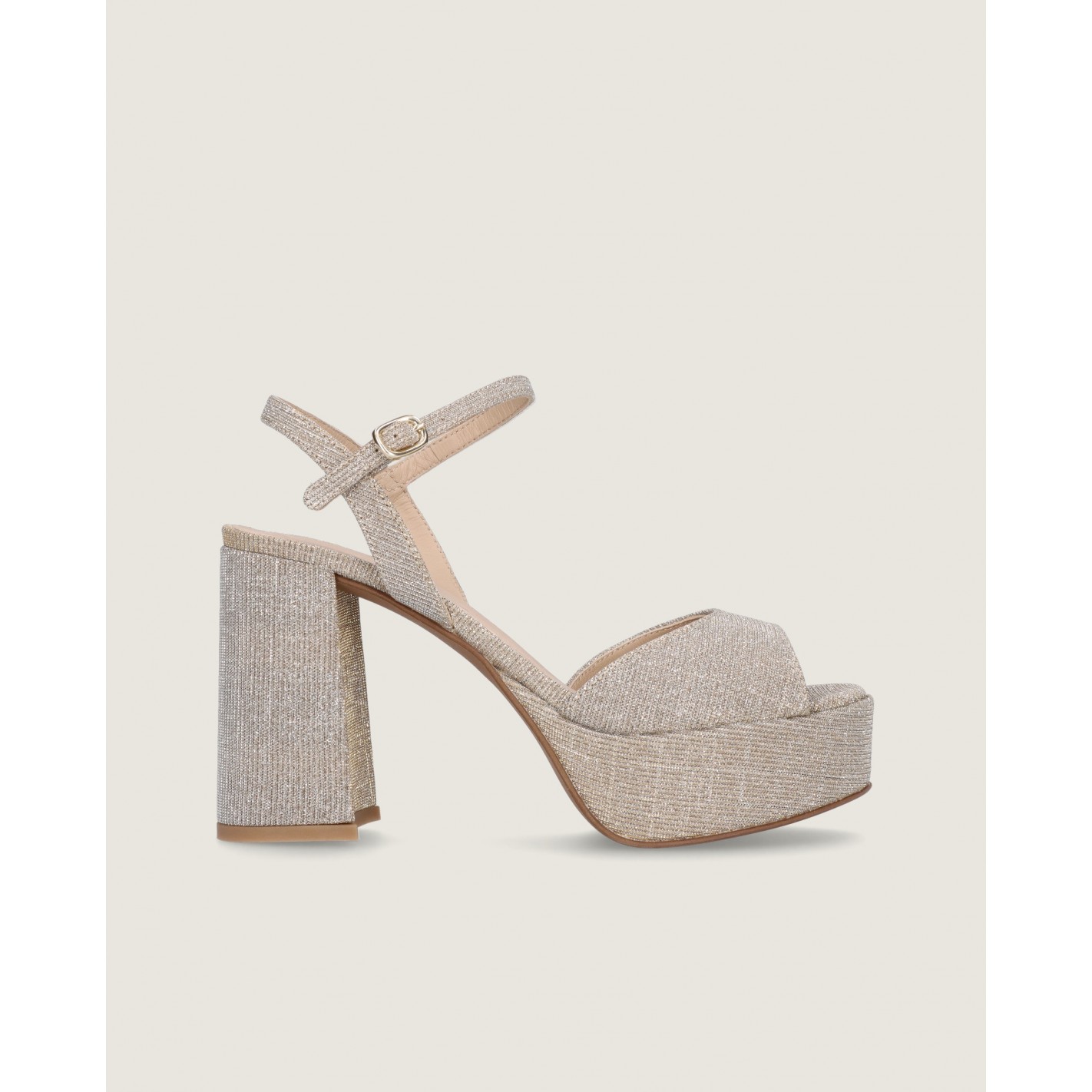 Sandalia con pulsera en el tobillo modelo Ruth en tela brillante color oro champán con tacón de 10.5cm, suela de goma, plantilla y forro de piel.