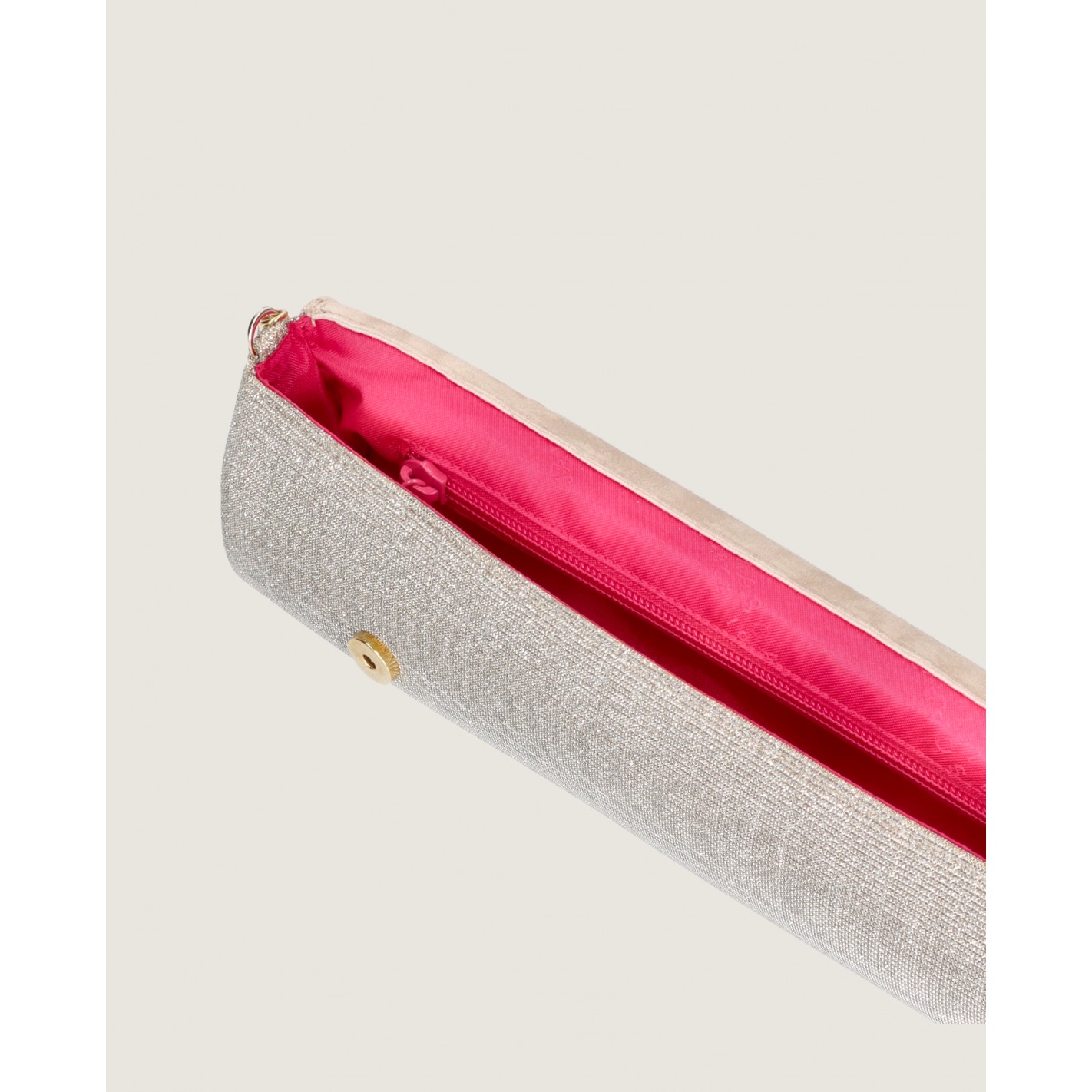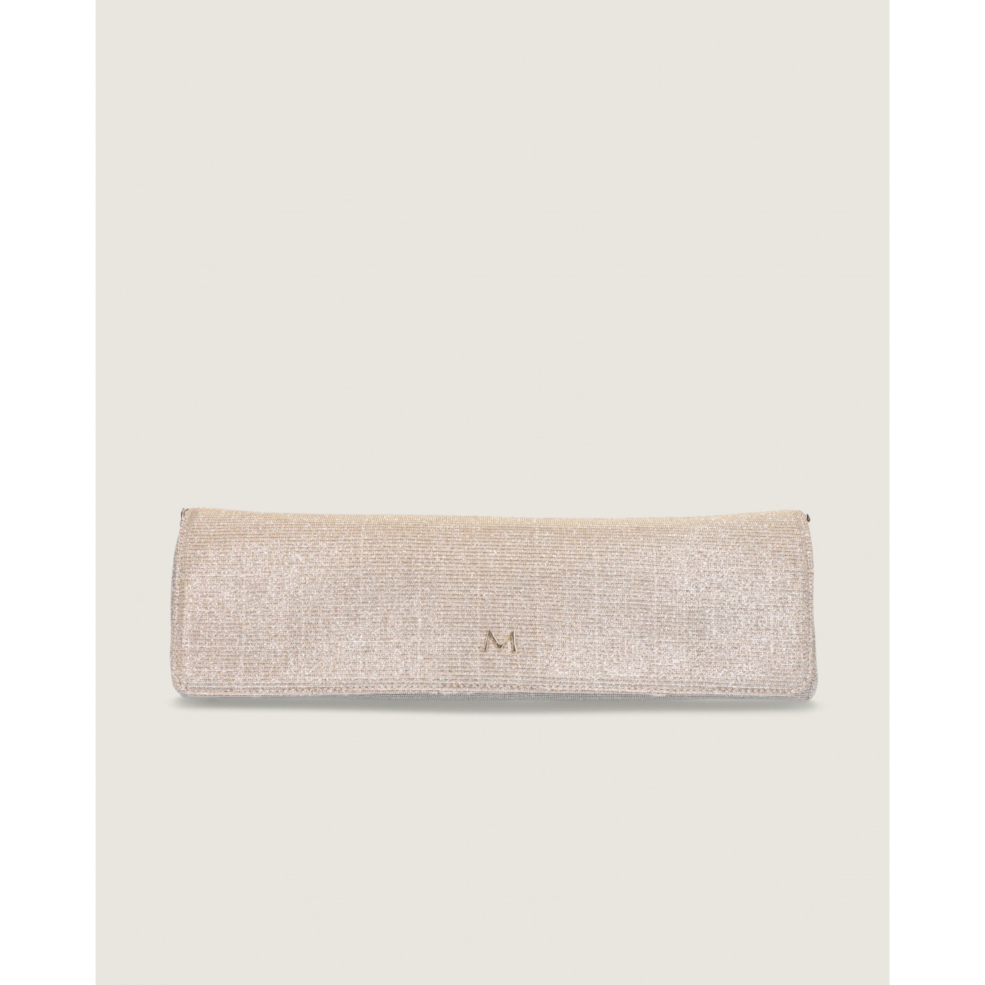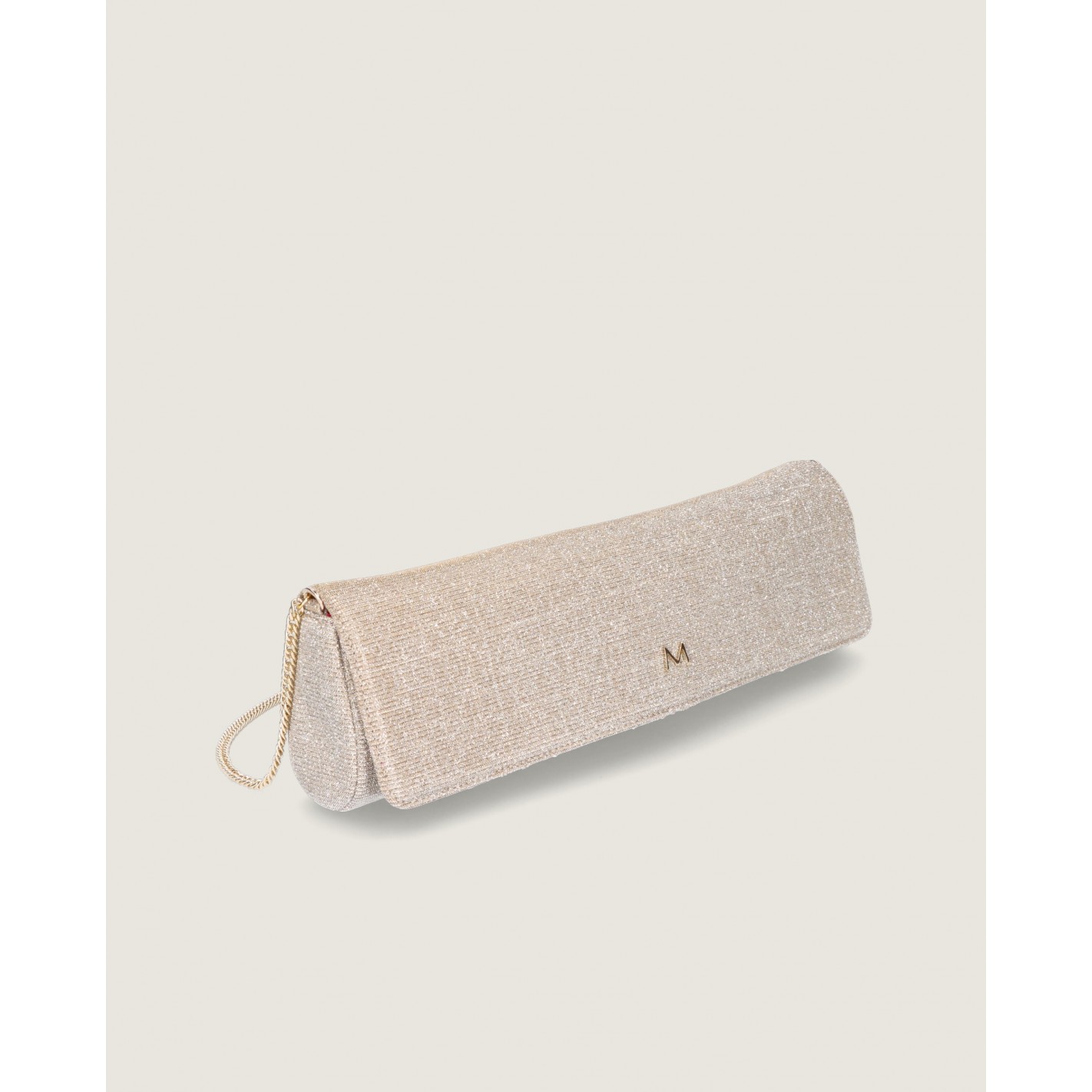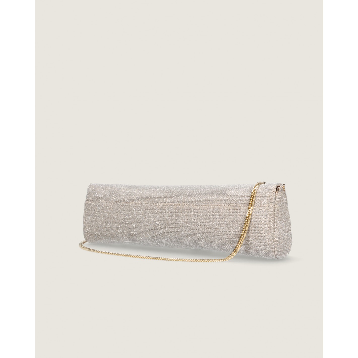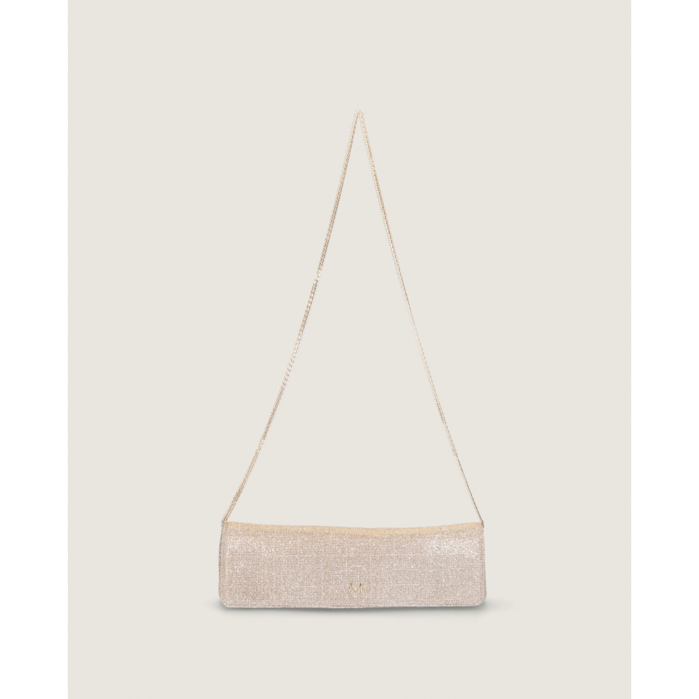 Bolso de mano estilo baguette en tela brillante color oro champán con cadena dorada. Alto 9cm x Ancho 30cm x Fondo 4cm.