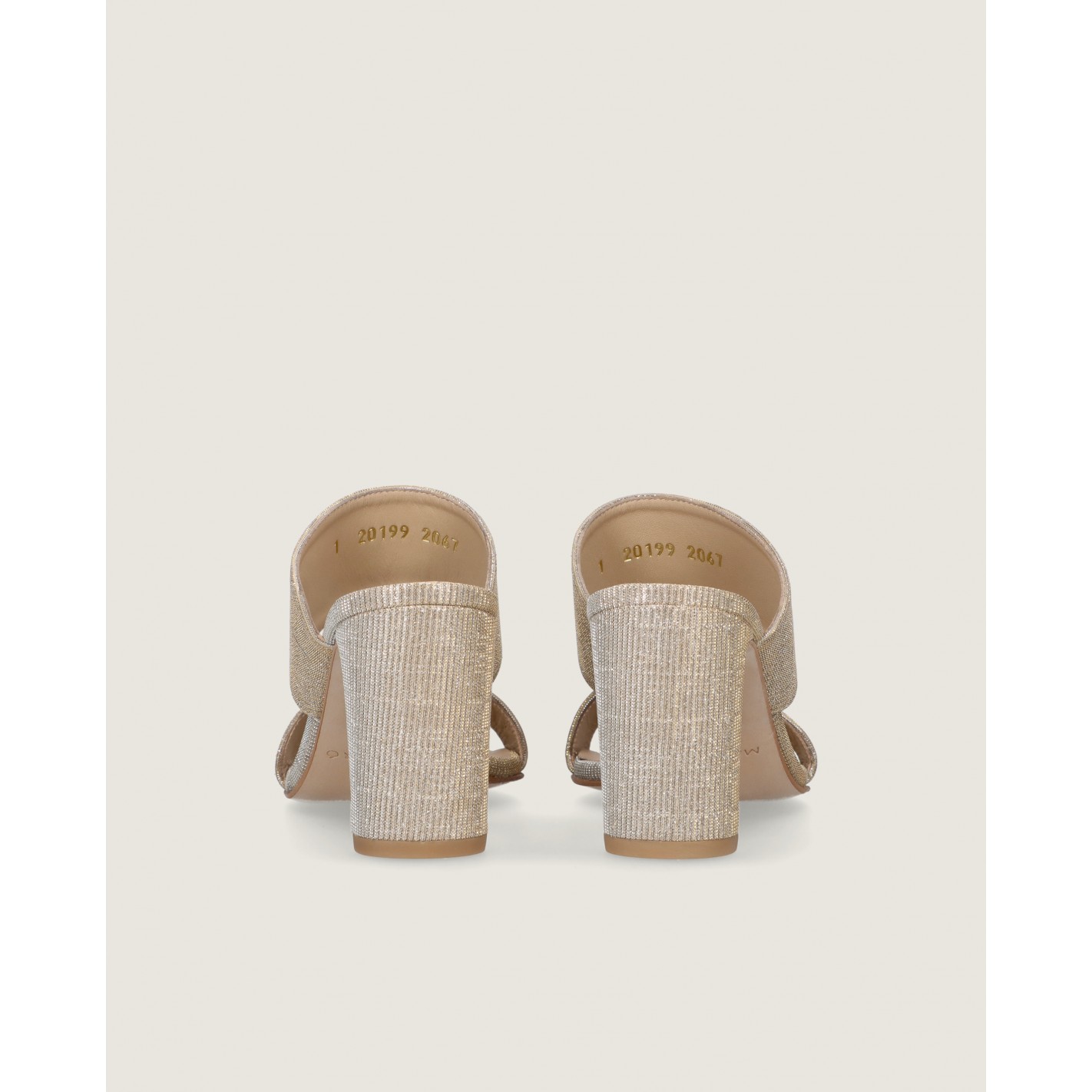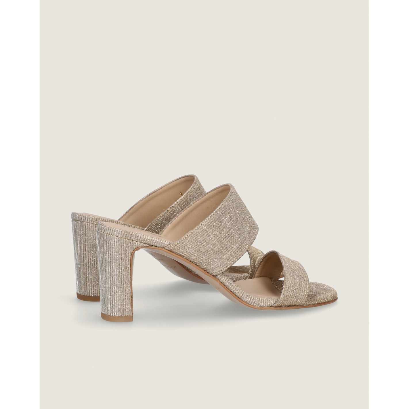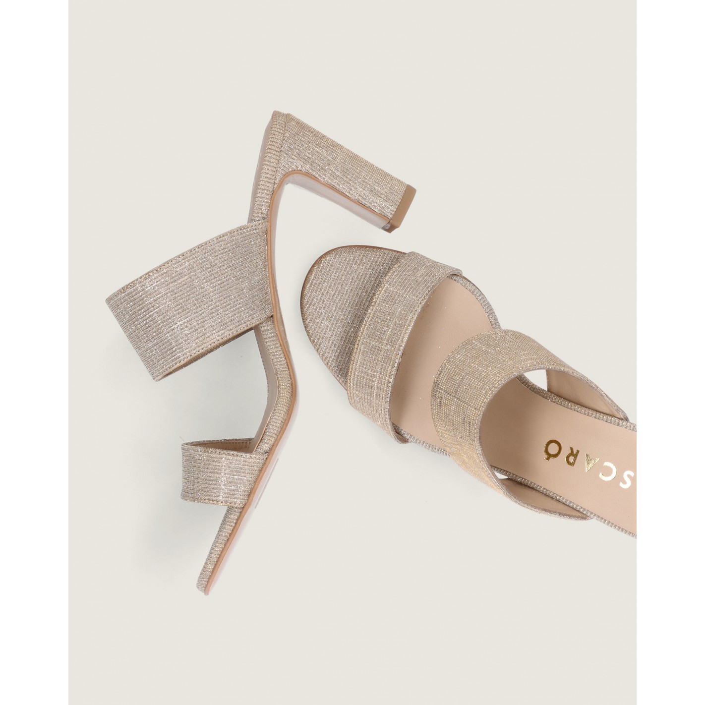 Sandalia modelo Maria en tela brillante color oro champán con tacón de 8cm, suela de goma y plantilla de piel.