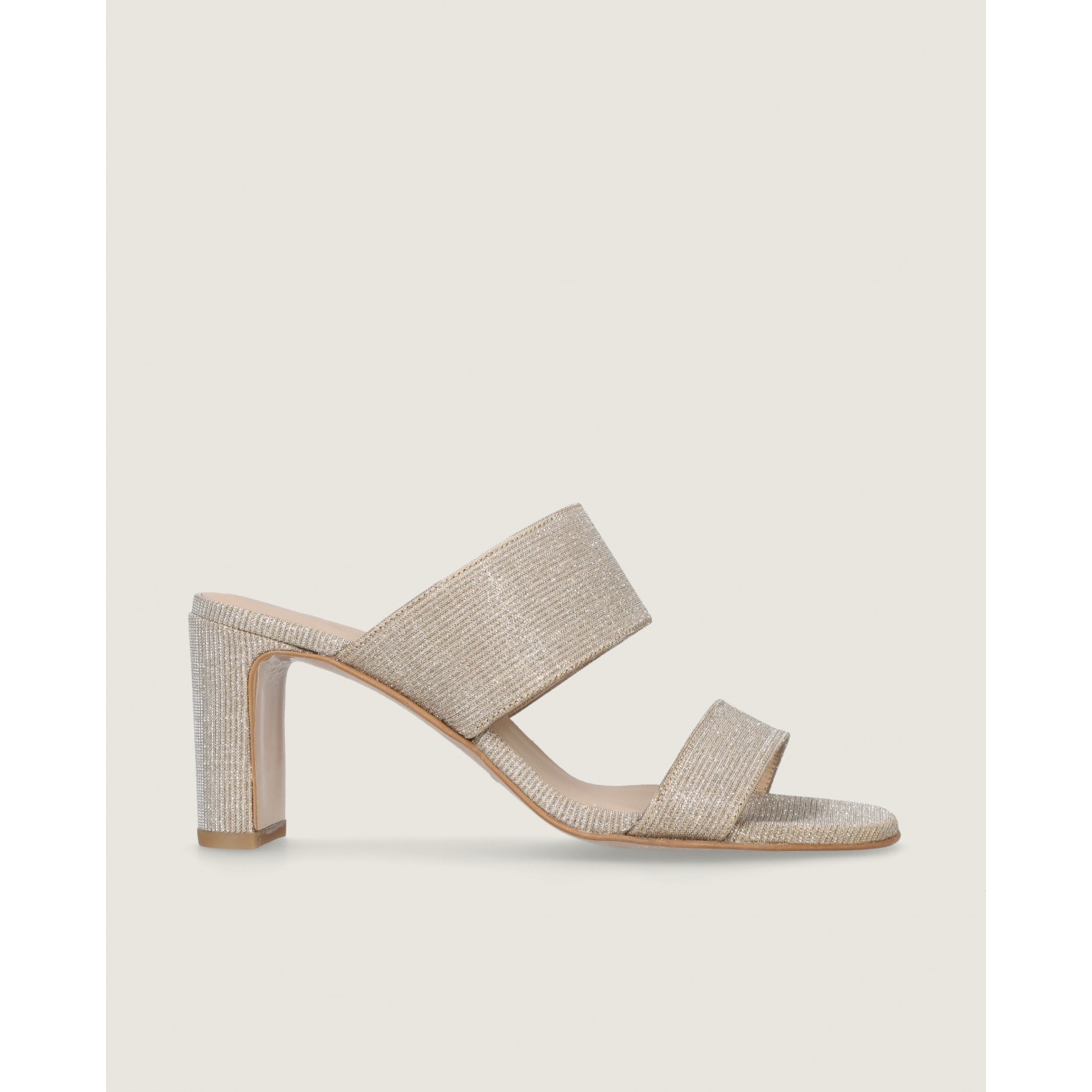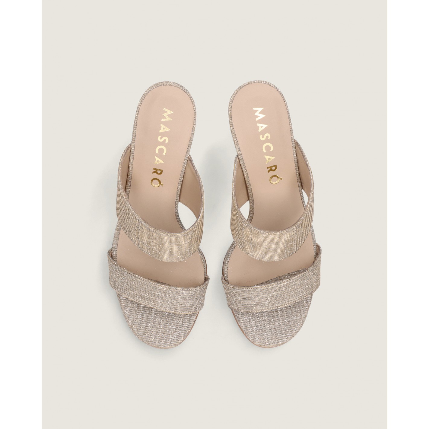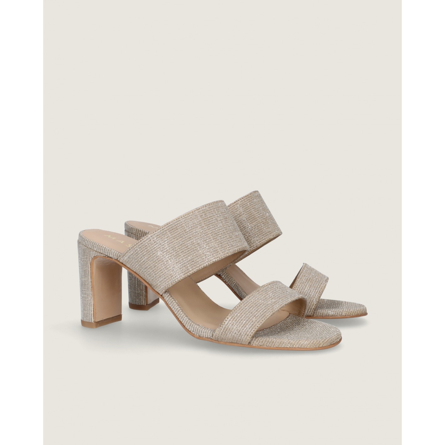Sandalia modelo Maria en tela brillante color oro champán con tacón de 8cm, suela de goma y plantilla de piel.