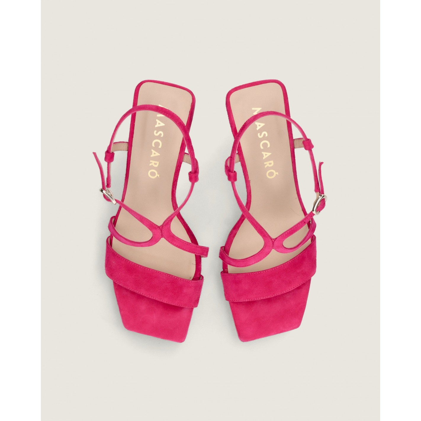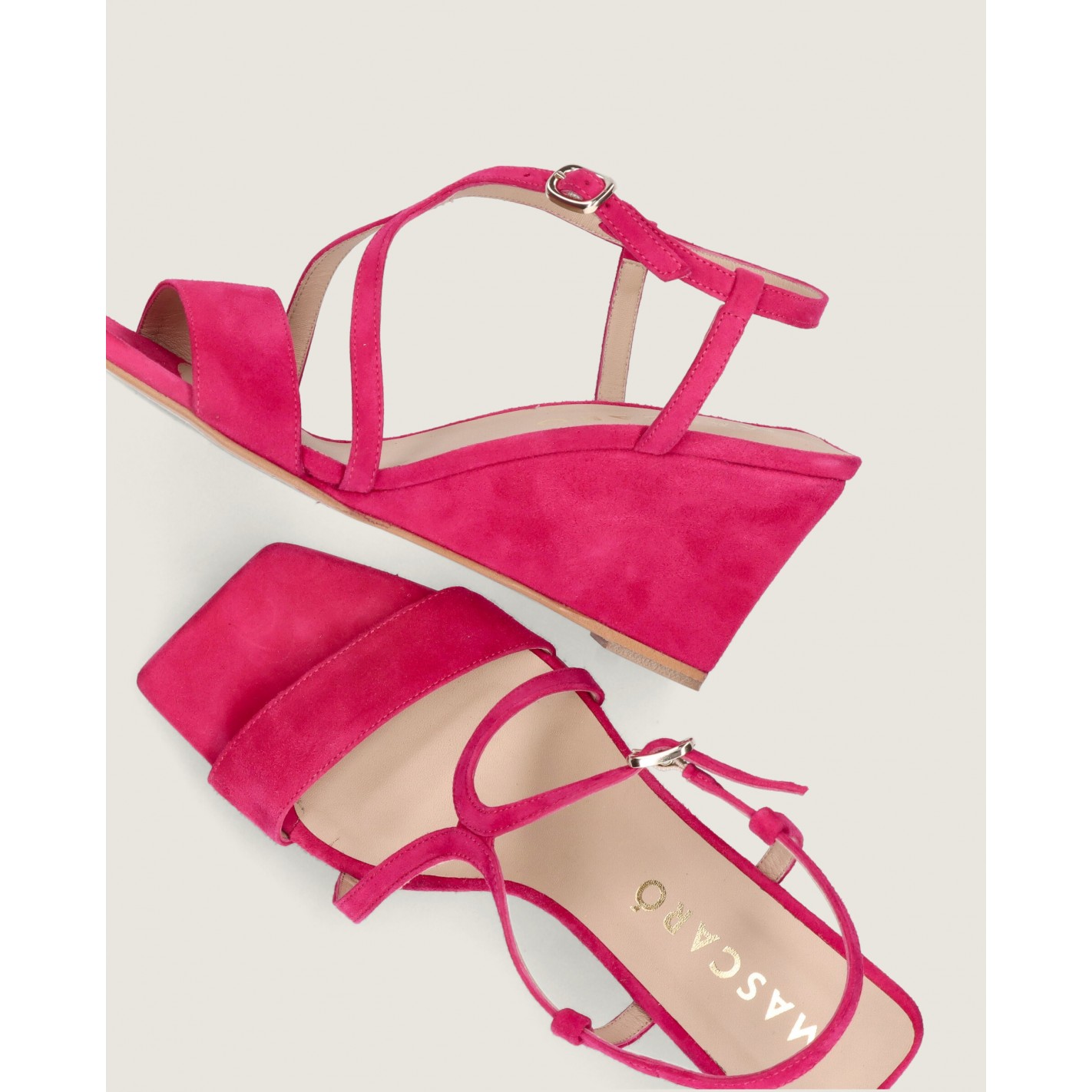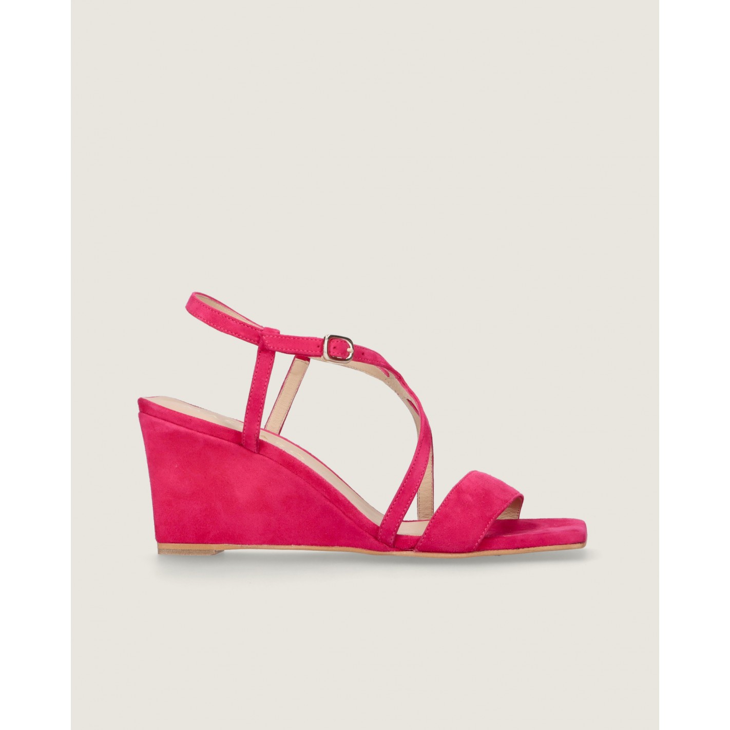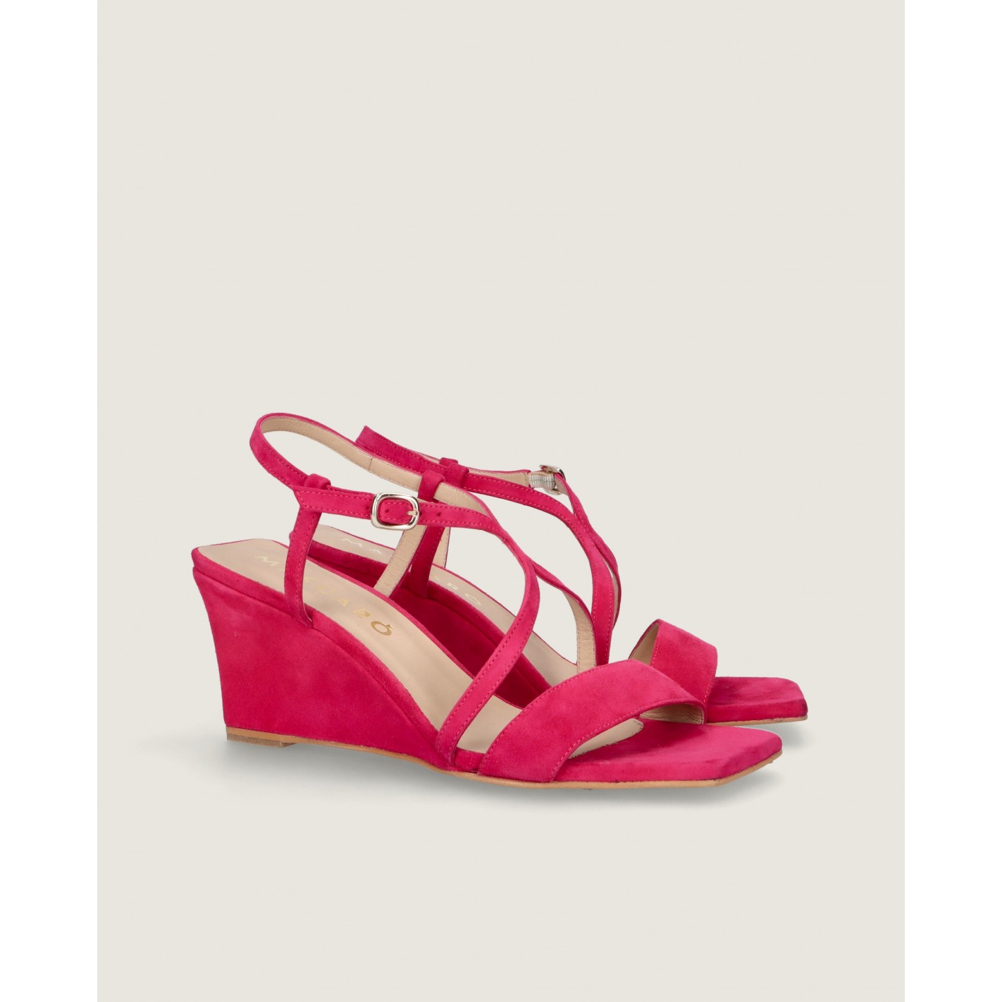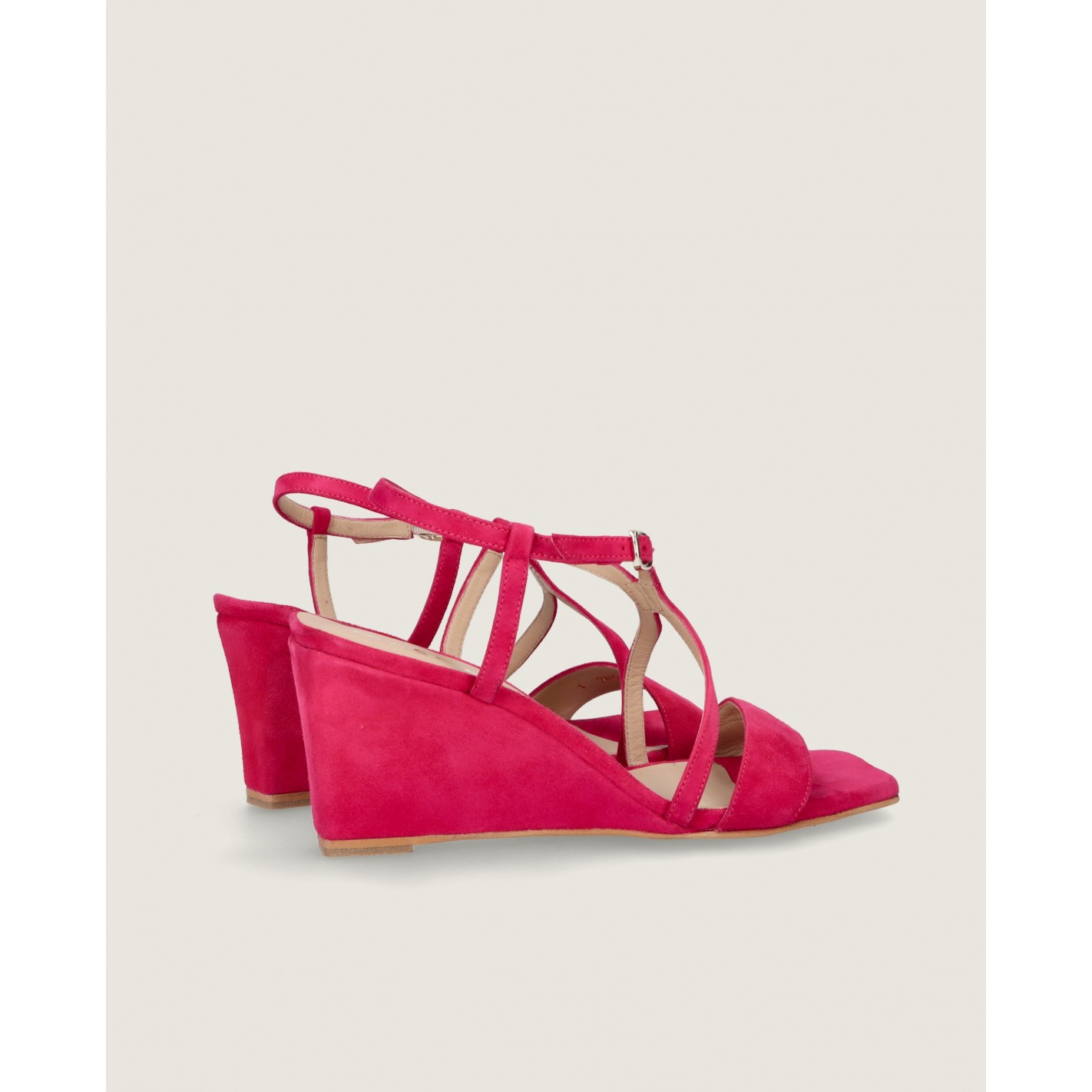 Sandalia modelo Stella con pulsera en el tobillo en ante suave color fucsia con cuña de 7cm, suela de goma y plantilla de piel.