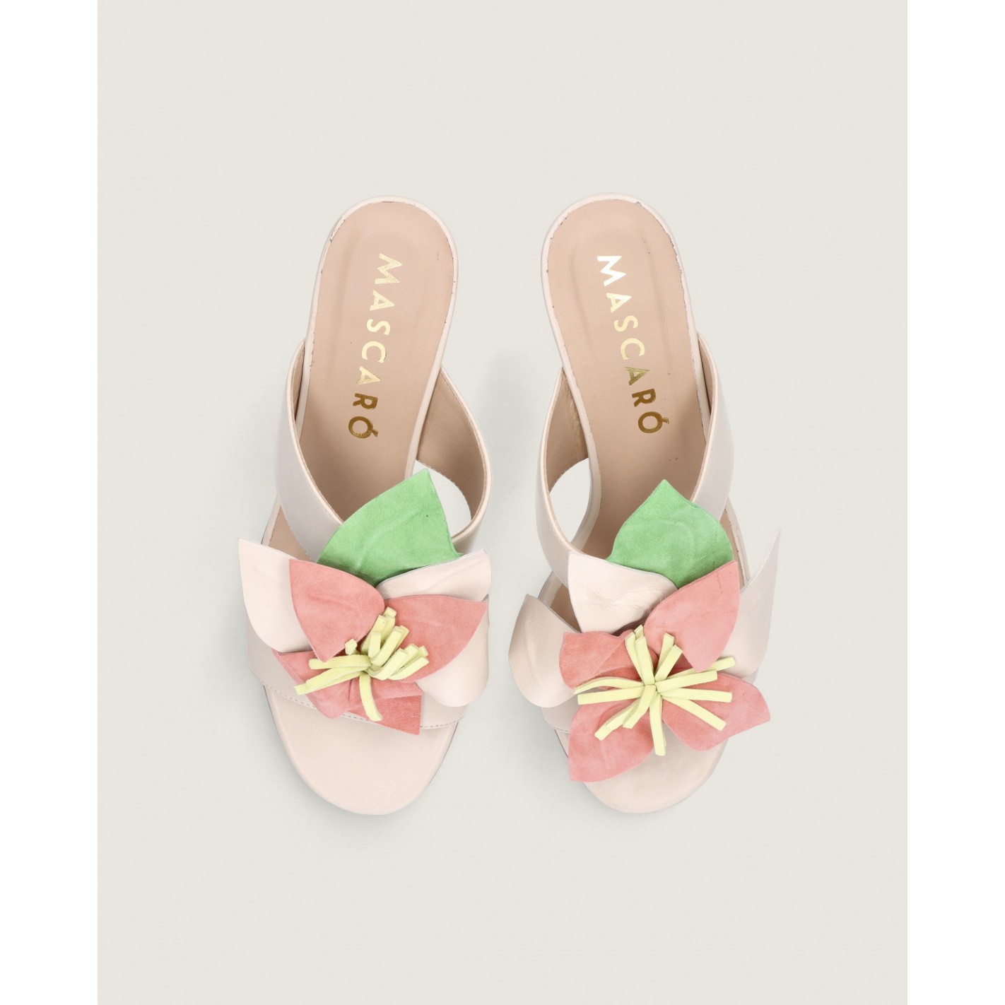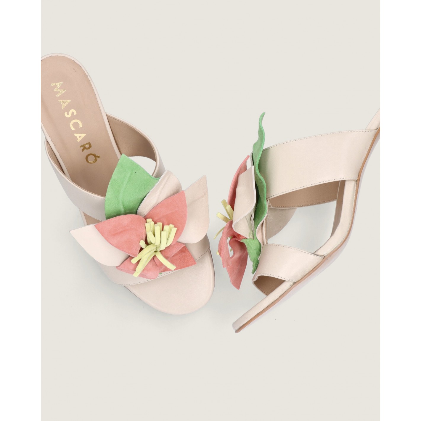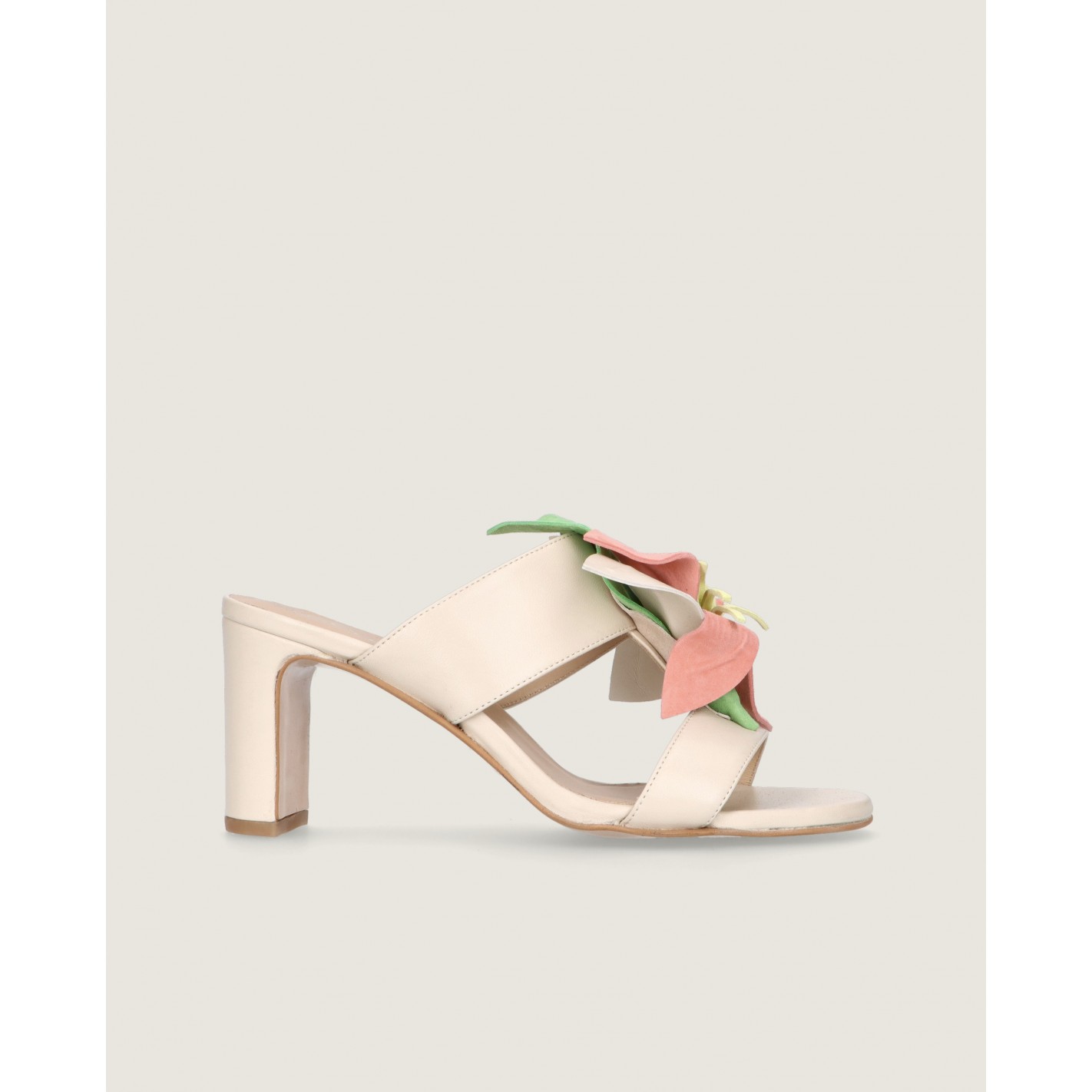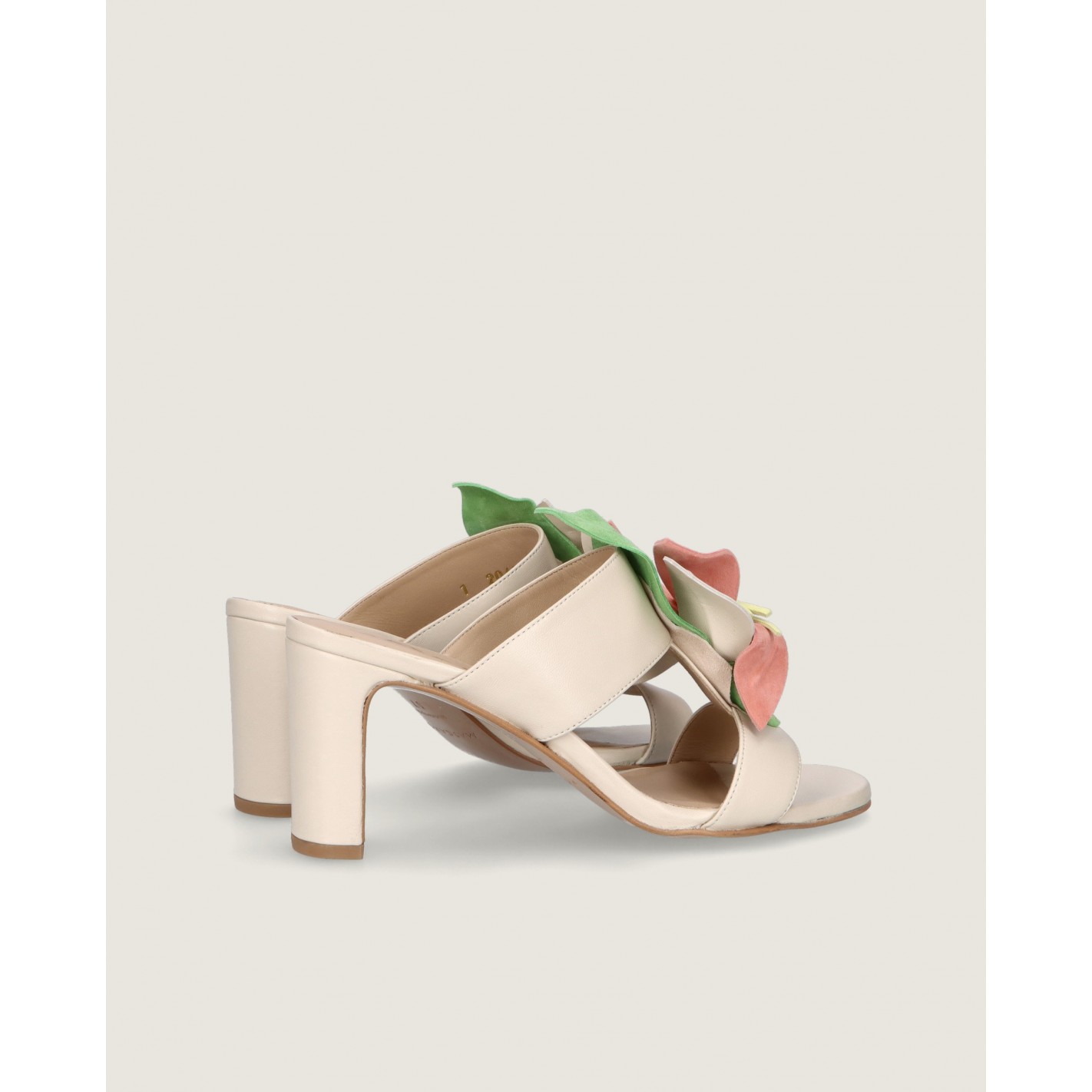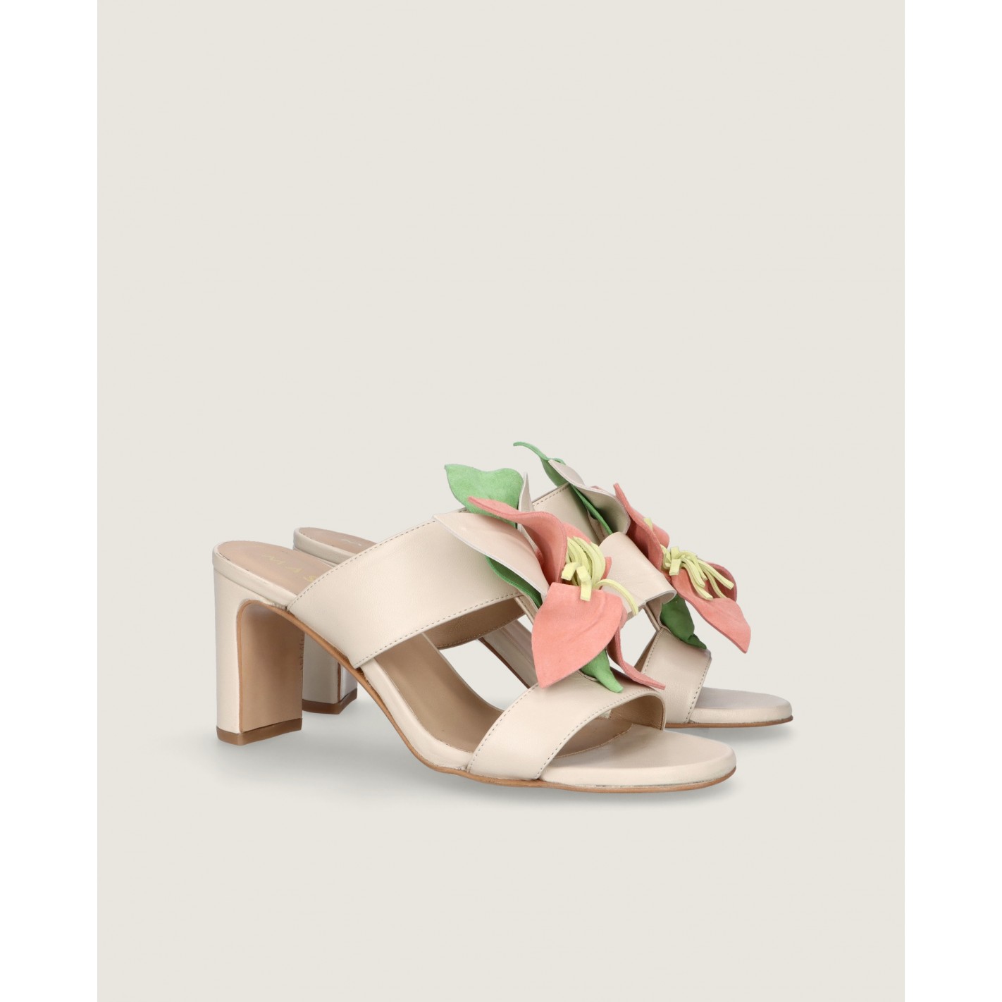 Sandalia modelo Maria en napa suave color marfil con flor de ante XL hecha a mano, tacón de 8cm, suela de goma y plantilla de piel.