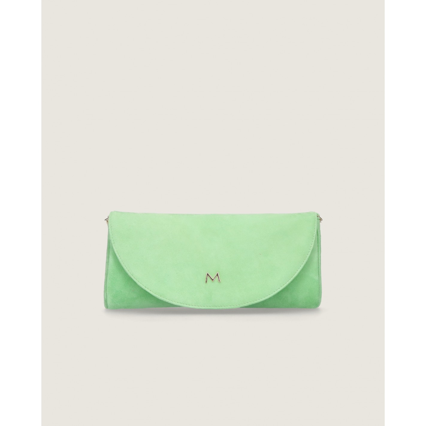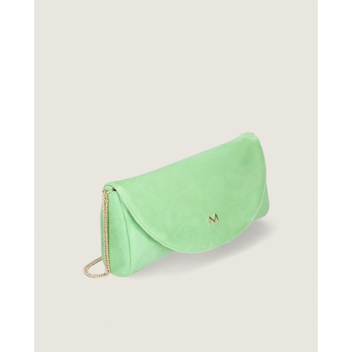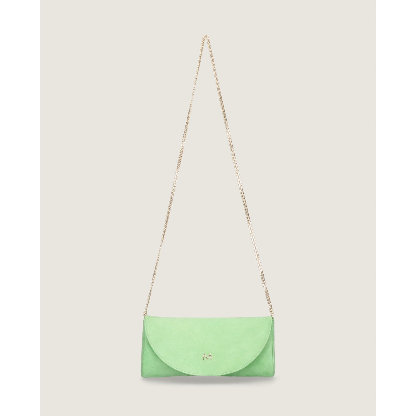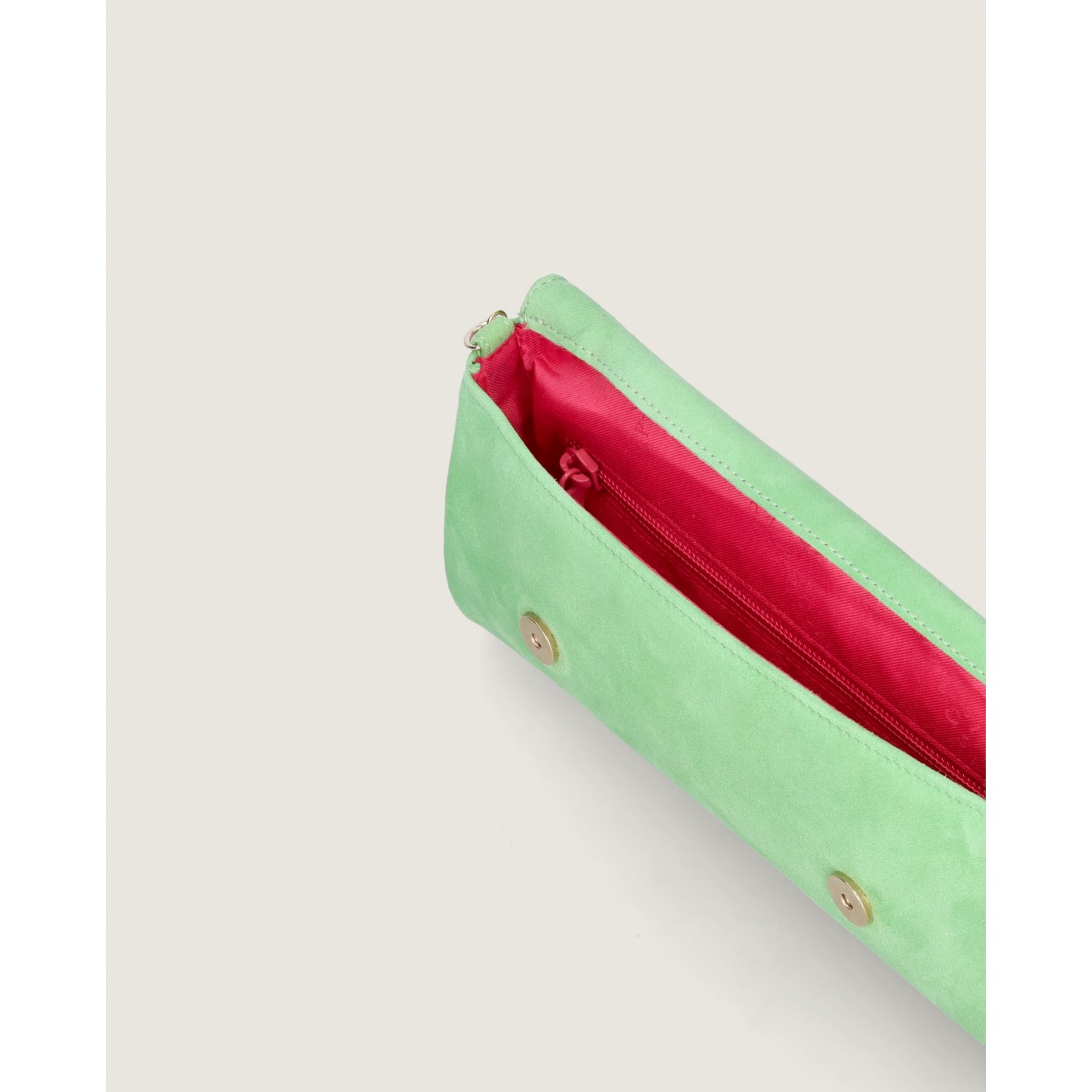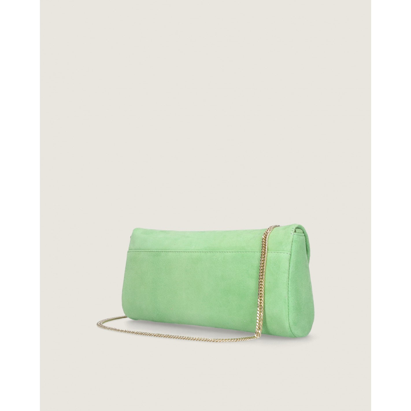 Bolso pequeño en ante suave color verde con cadena dorada. 10.5cm x 22cm x 4cm (Alto x Largo x Ancho)