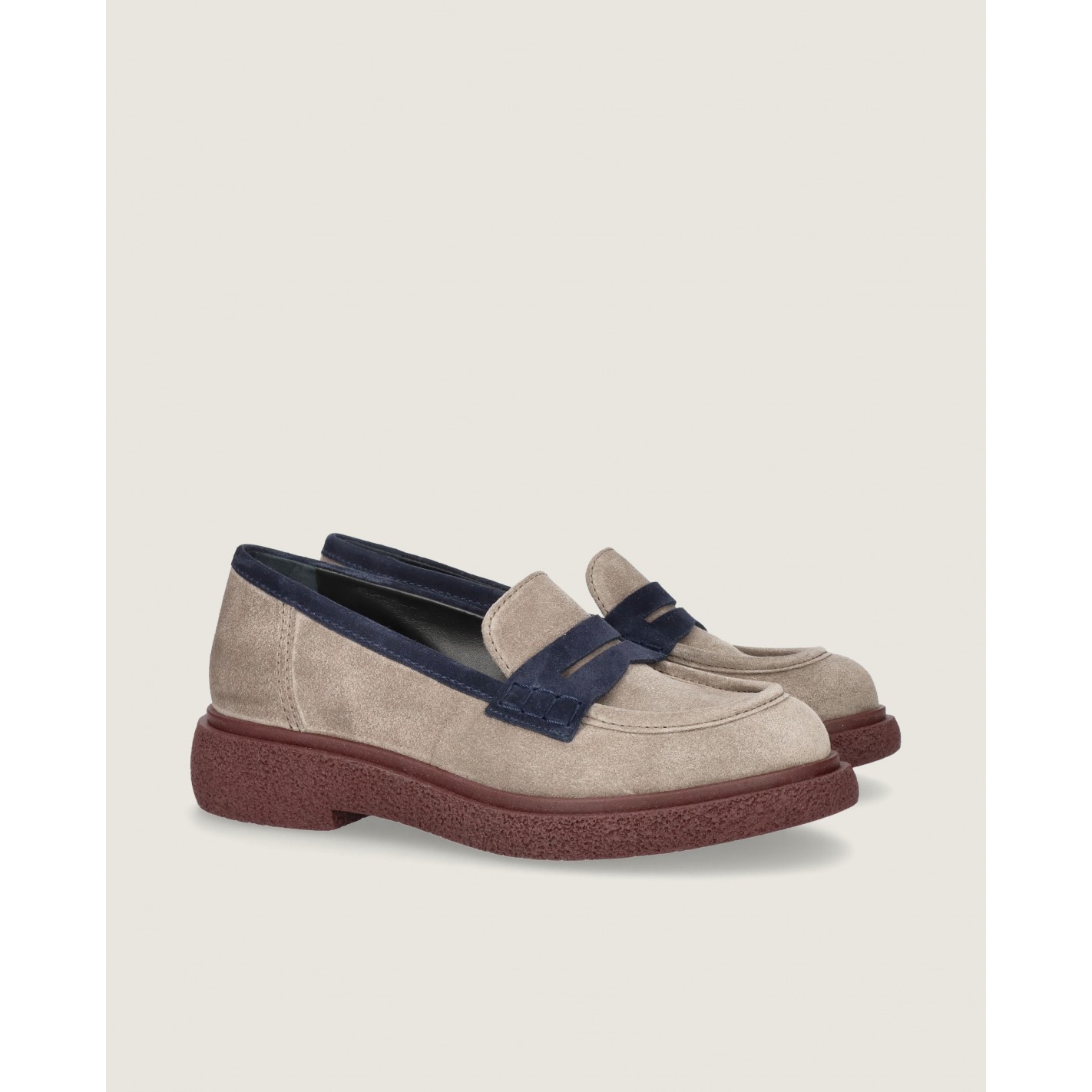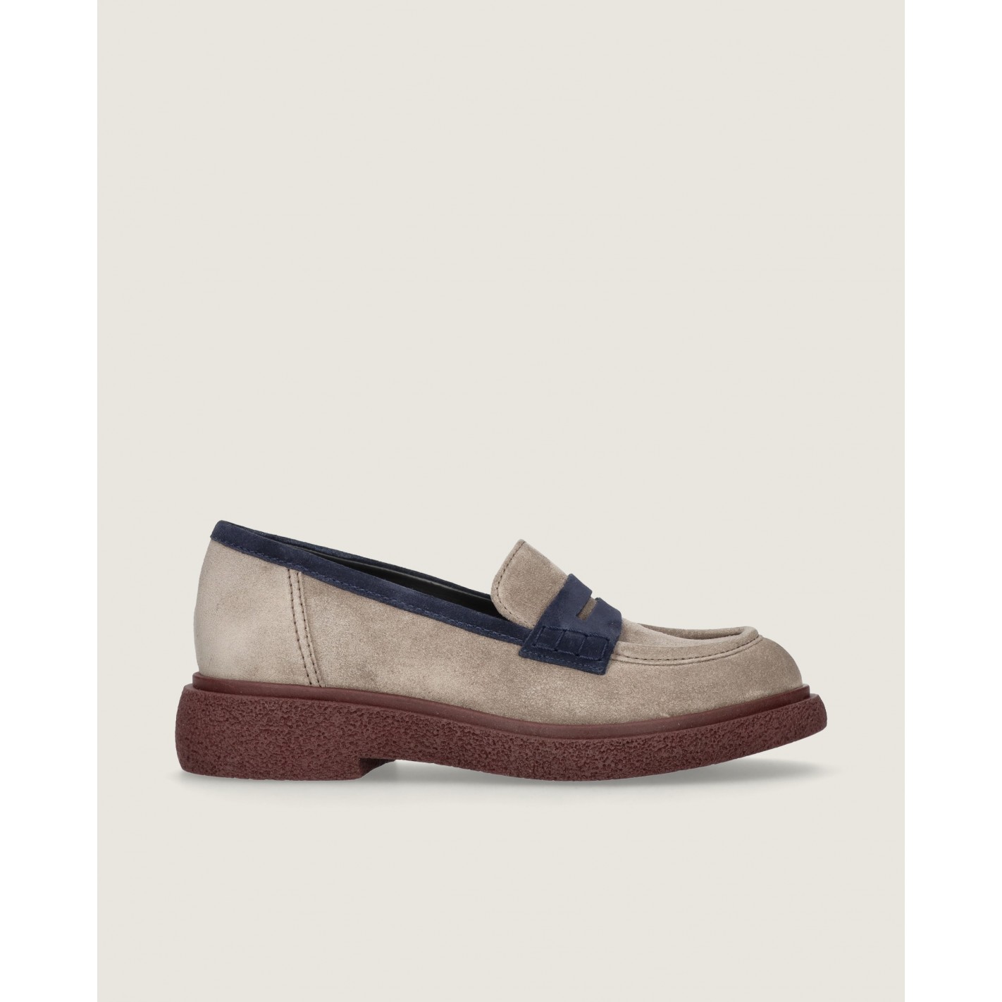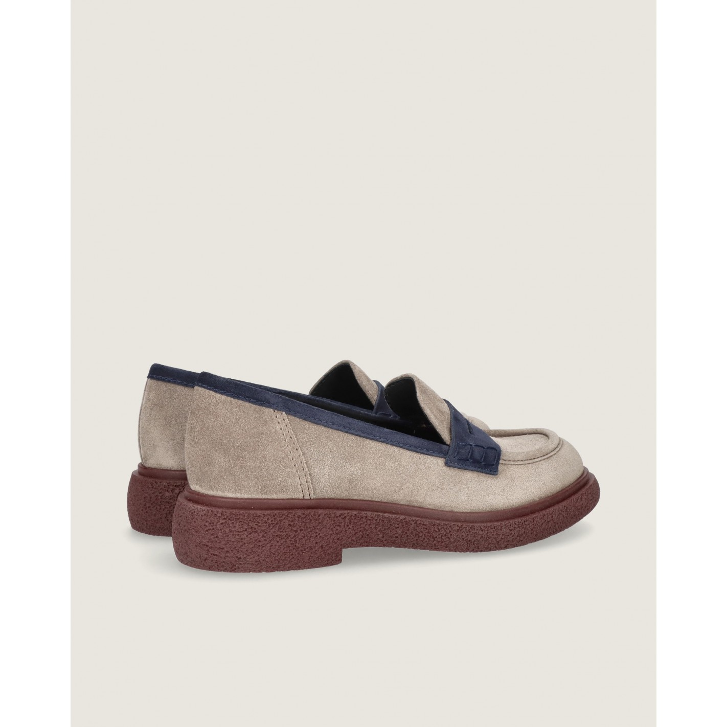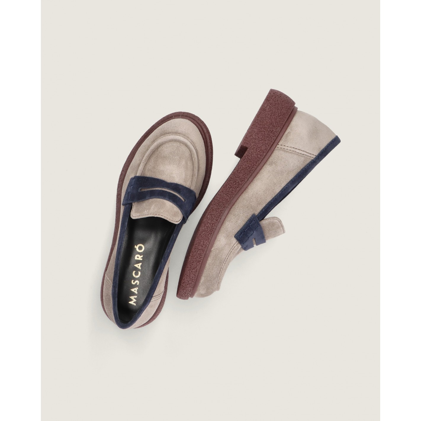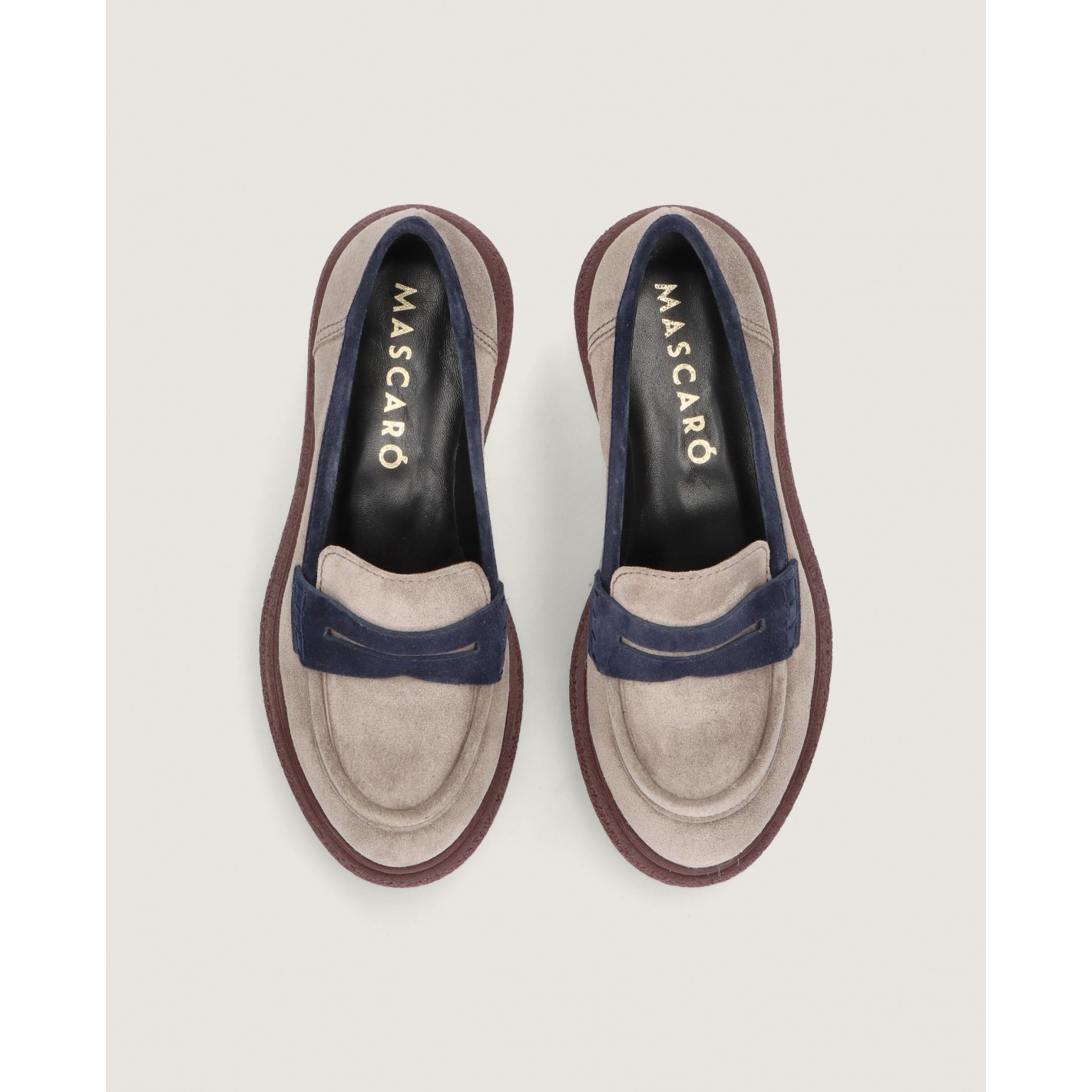 Loafer modelo Alice en ante color gris topo y azul marino, tacón de 3m, suela de goma, plantilla y forro de piel.