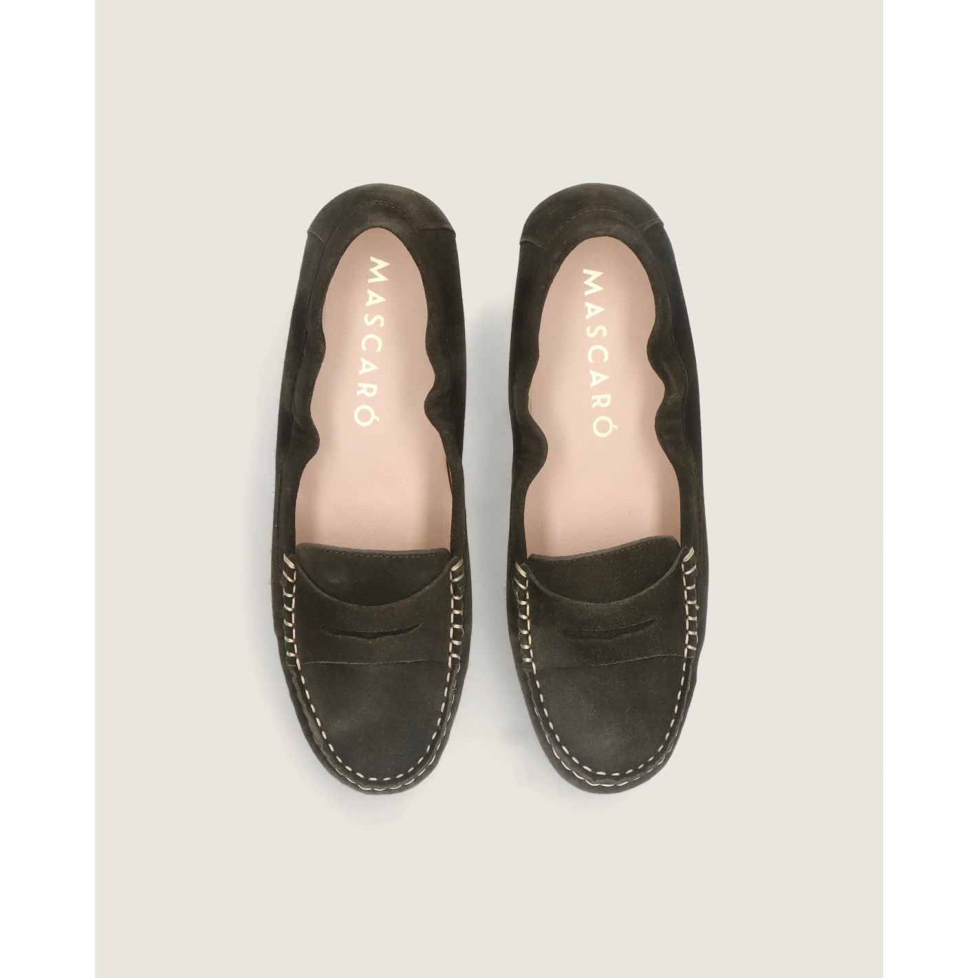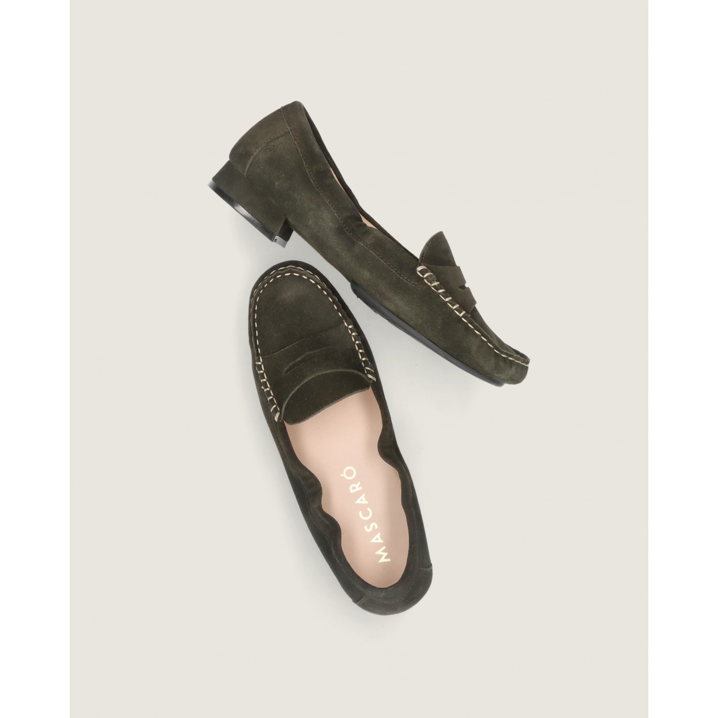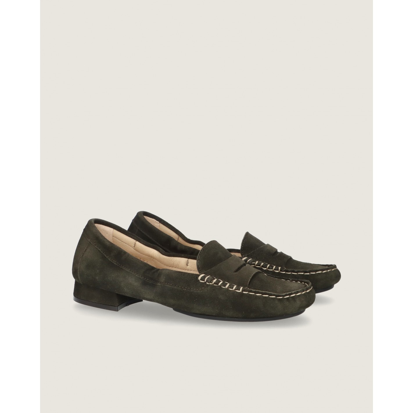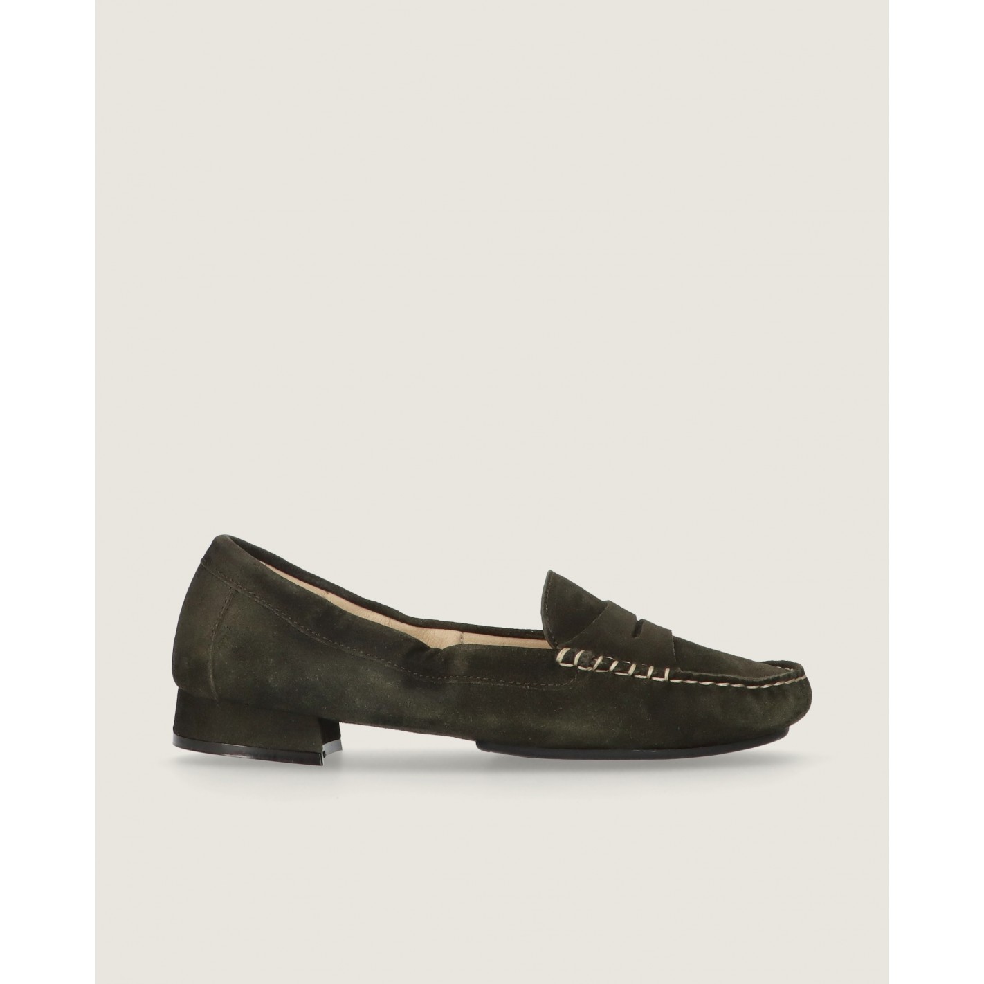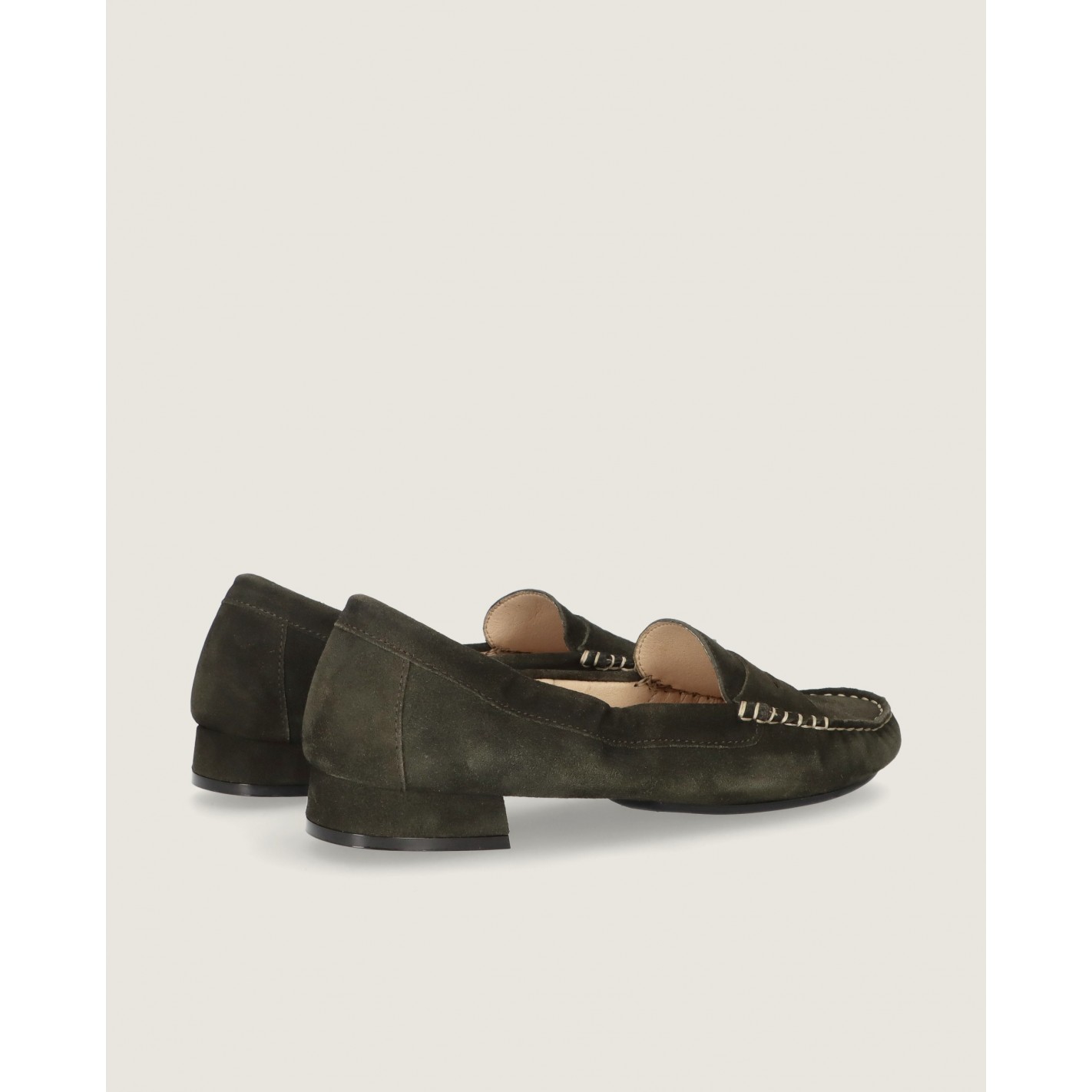 Mocasín modelo Henrietta en ante color verde oscuro con tacón de 2.5cm, suela de goma, plantilla y forro de piel.