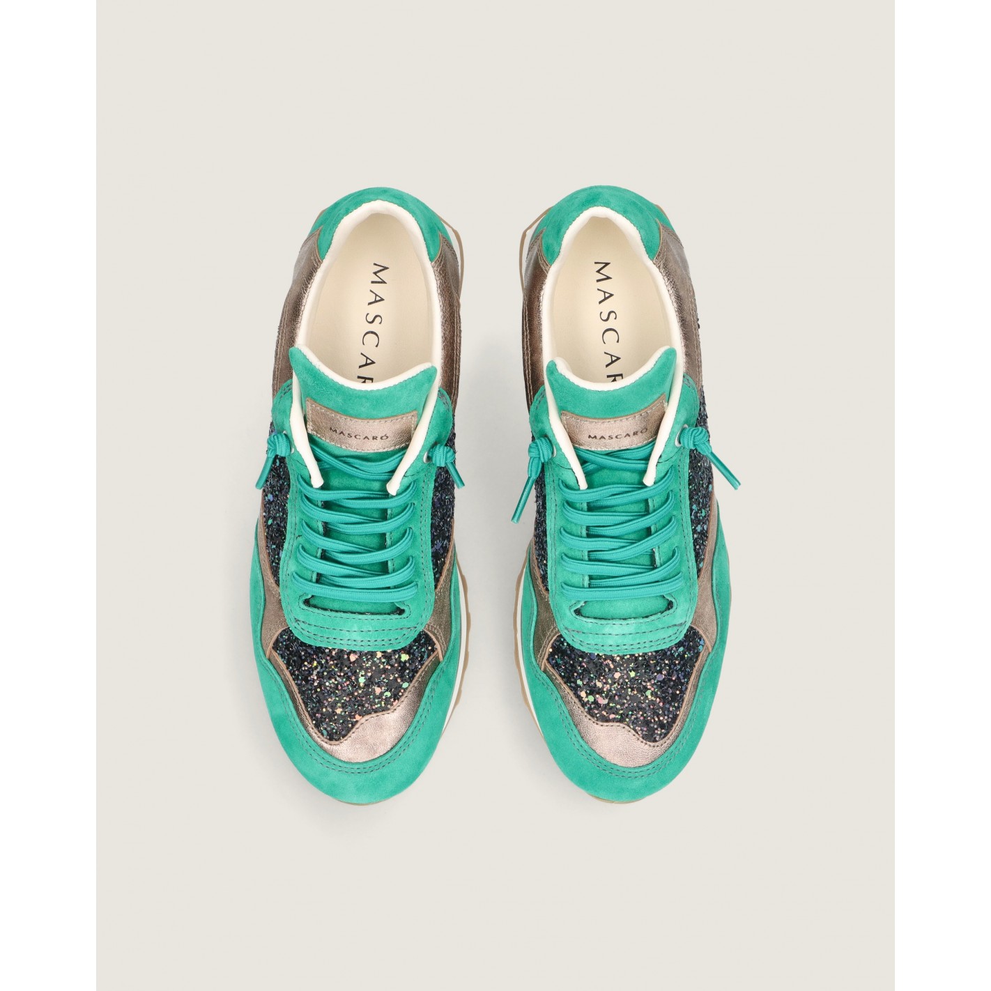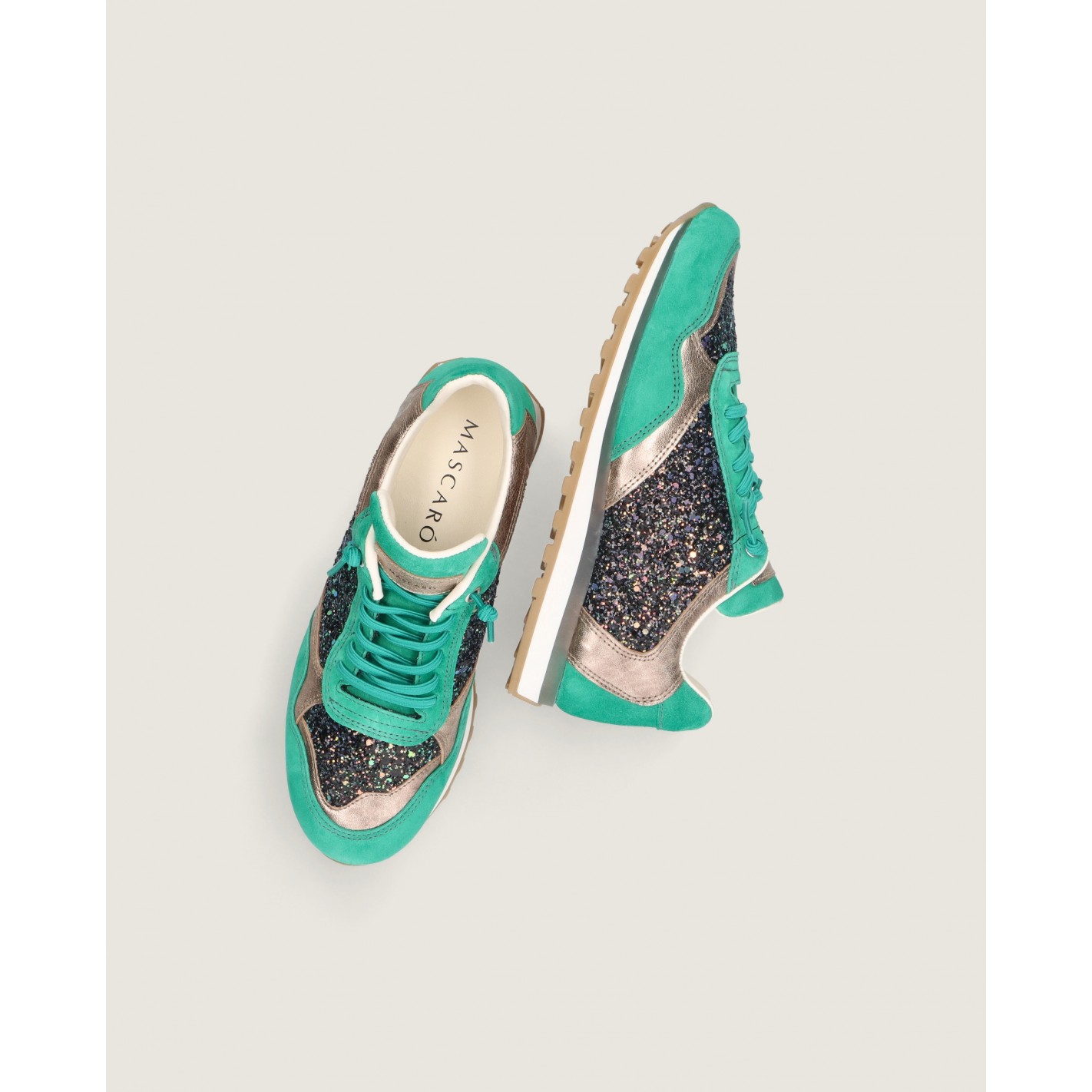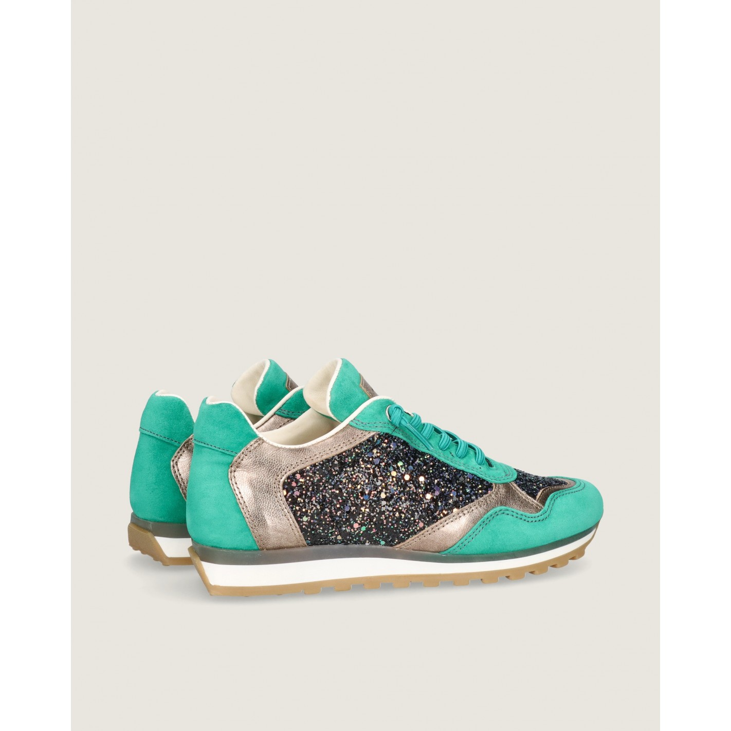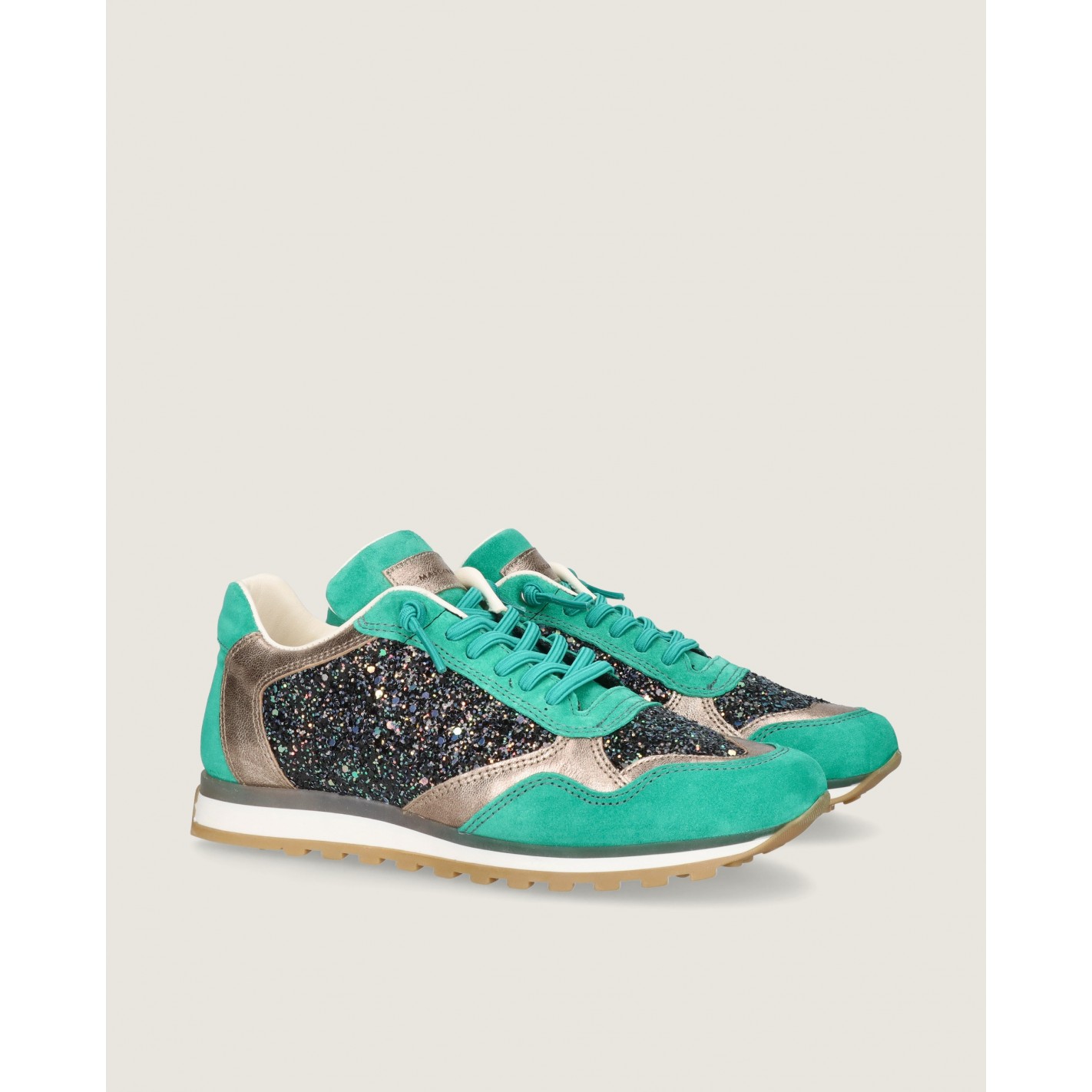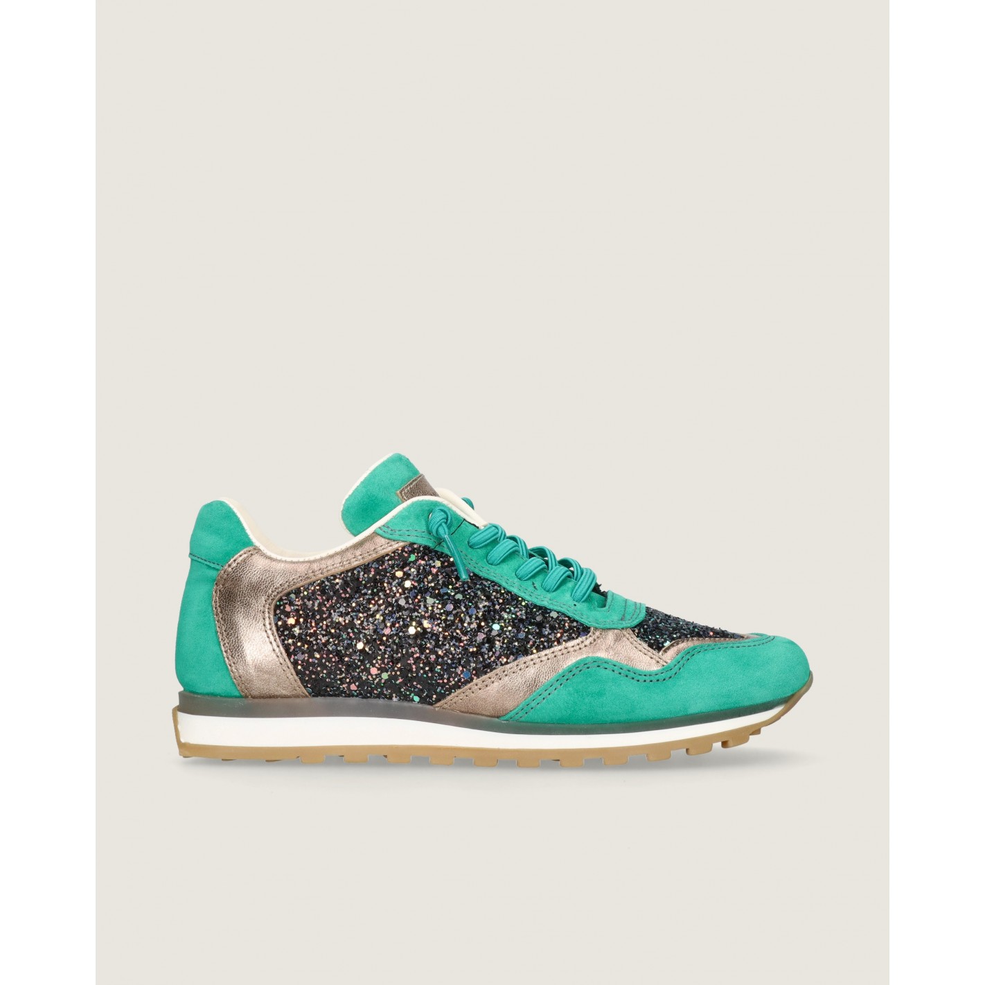 Sneaker modelo Mireya en ante color verde combinada con napa metalizada color oro champagne y tejido glitter. Tiene tacón de 2cm, una plantilla acolchada para mayor confort, cordones elásticos que brindan un ajuste cómodo sin la molestia de tener que atarlos o desatarlos y forro de tela.