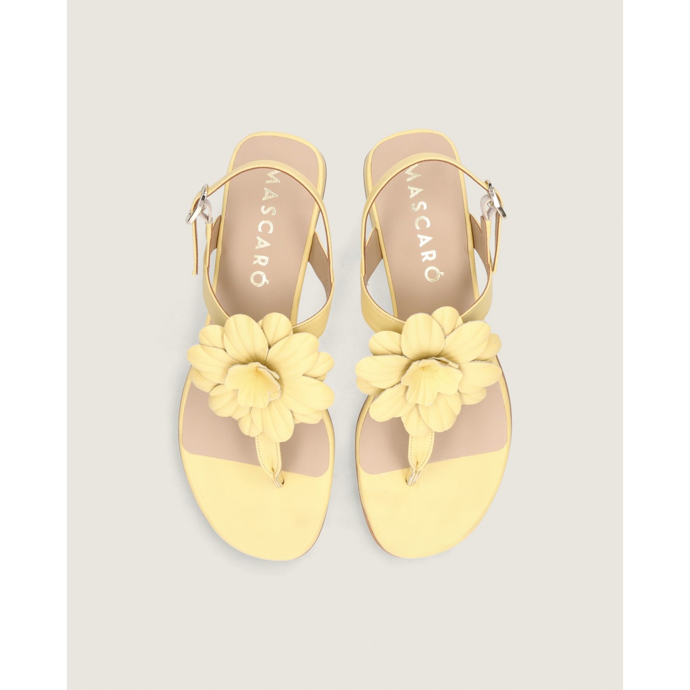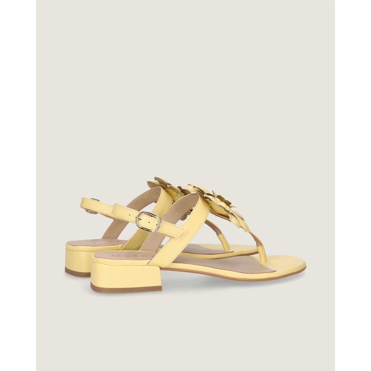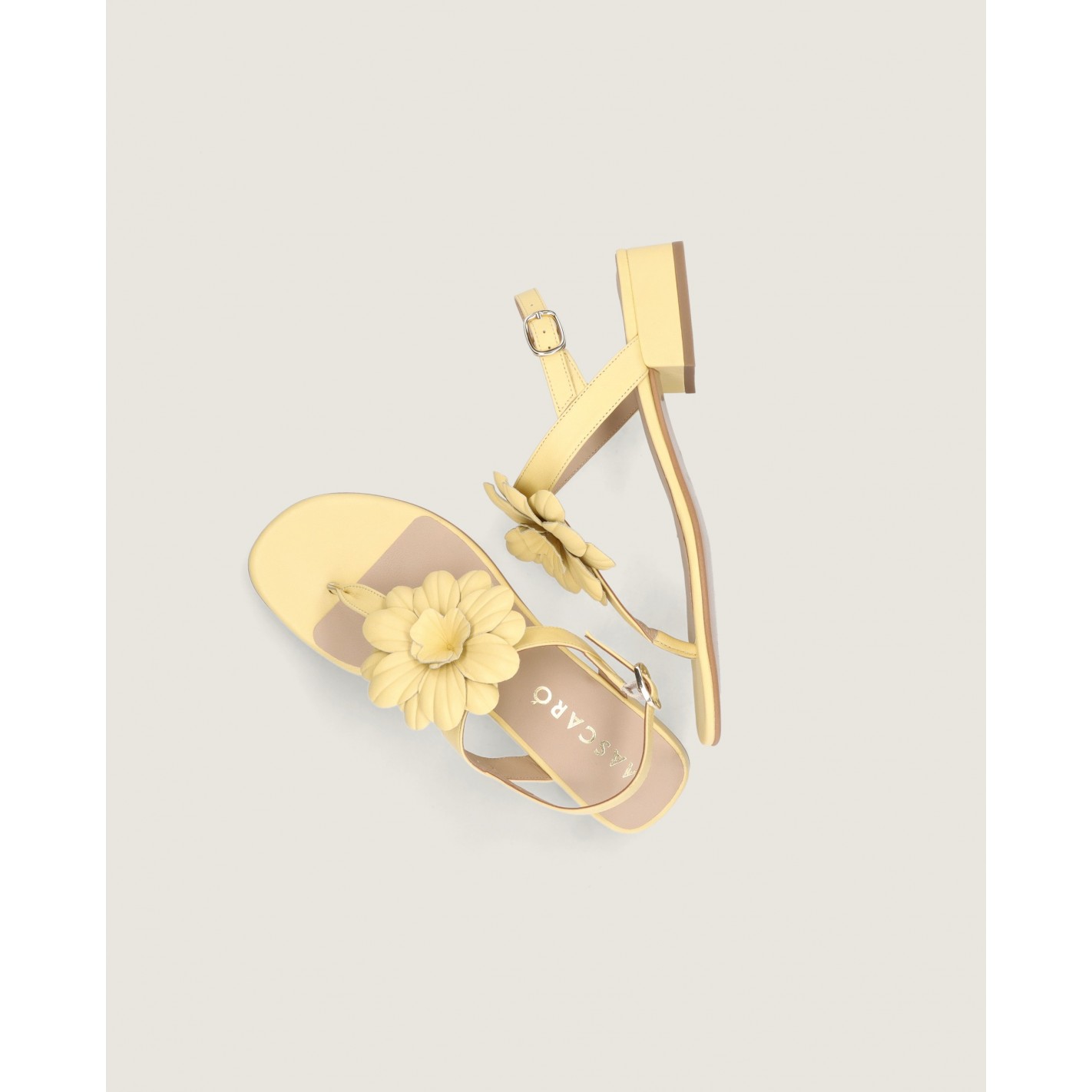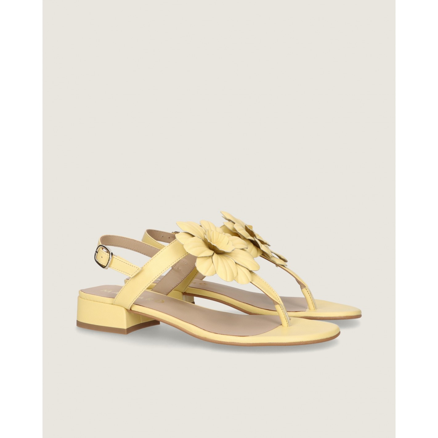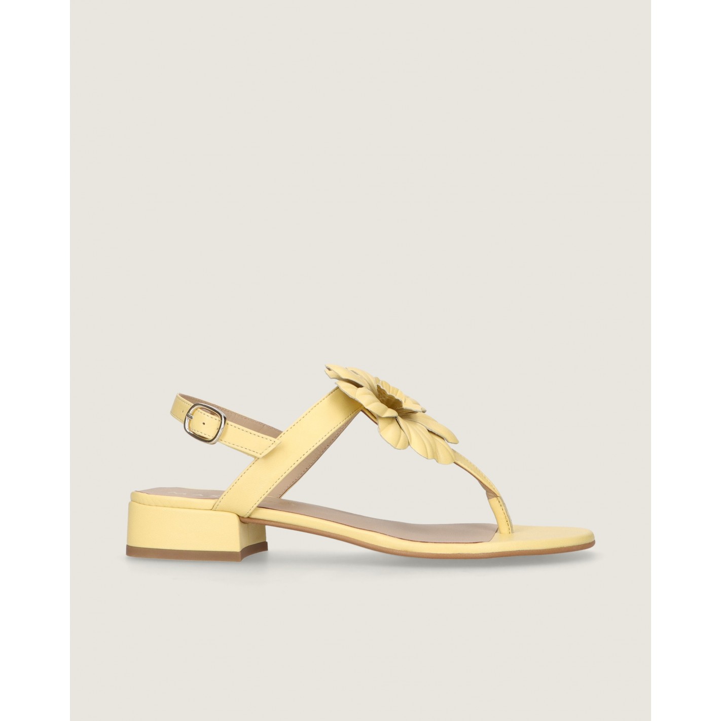 Sandalia modelo Amelie en napa suave color amarillo con flor hecha a mano sobre el empeine, tacón de 2.5cm, suela de goma y plantilla de piel.