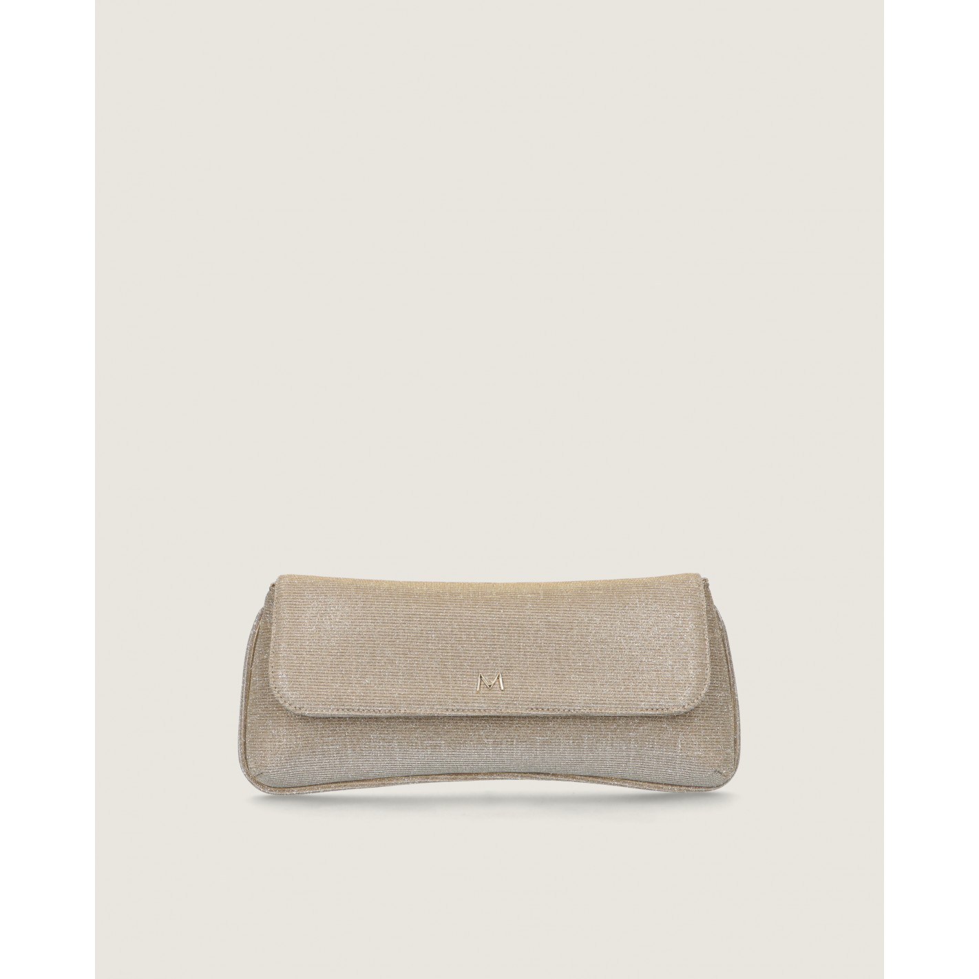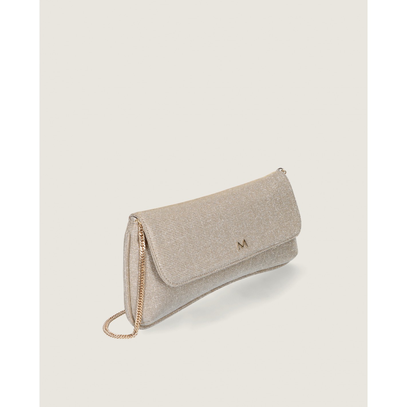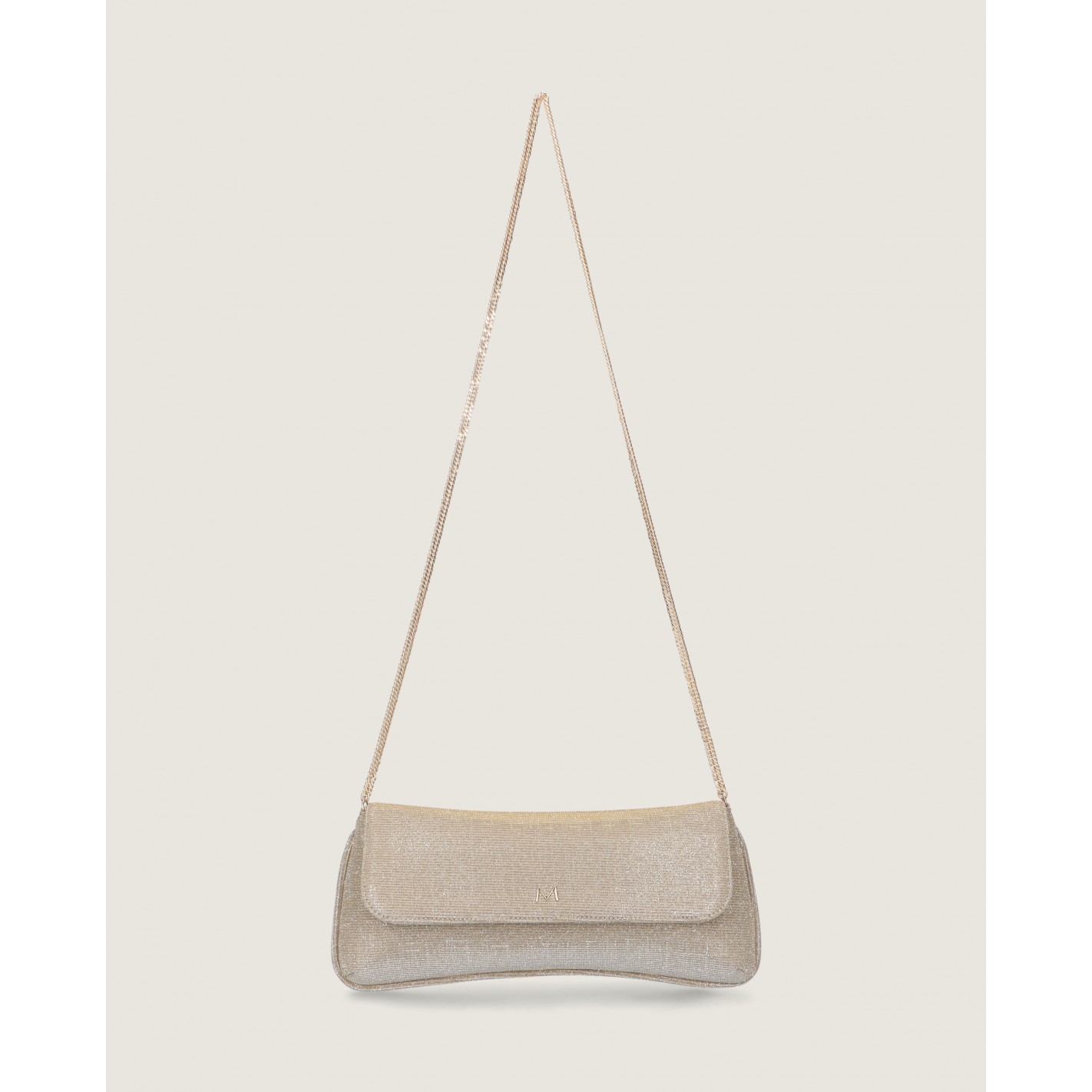 BOLSO ONDA es una cartera de mano con cadena para el hombor en tela color oro champagne brillante con logotipo de letra M dorado. Es una opción ideal para ocasiones especiales.14cm x 29cm x 4cm (height x length x width).