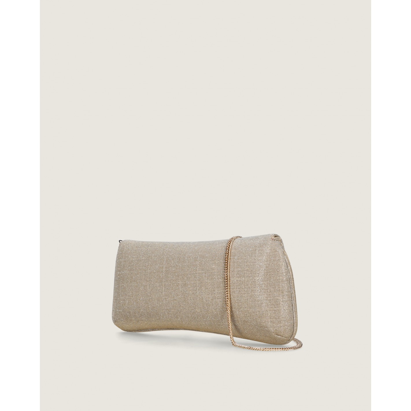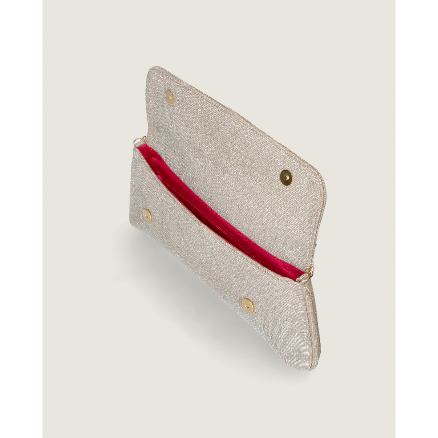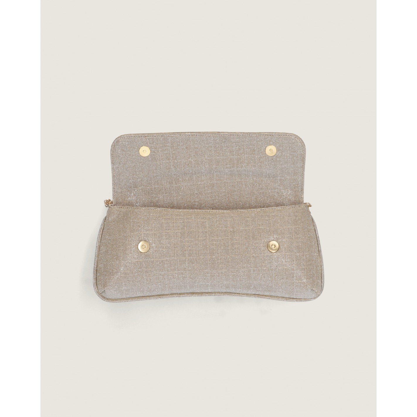 BOLSO ONDA es una cartera de mano con cadena para el hombor en tela color oro champagne brillante con logotipo de letra M dorado. Es una opción ideal para ocasiones especiales.14cm x 29cm x 4cm (height x length x width).