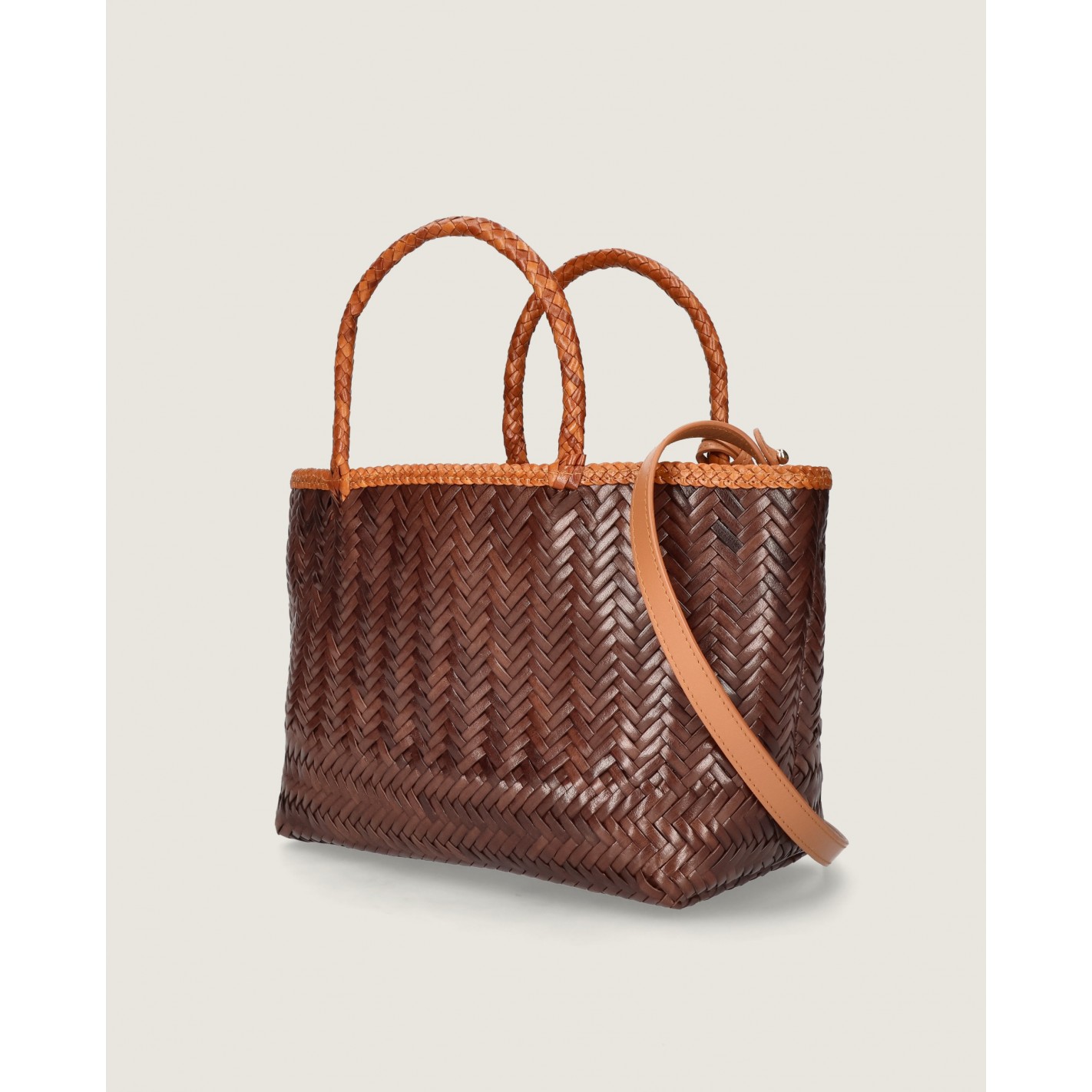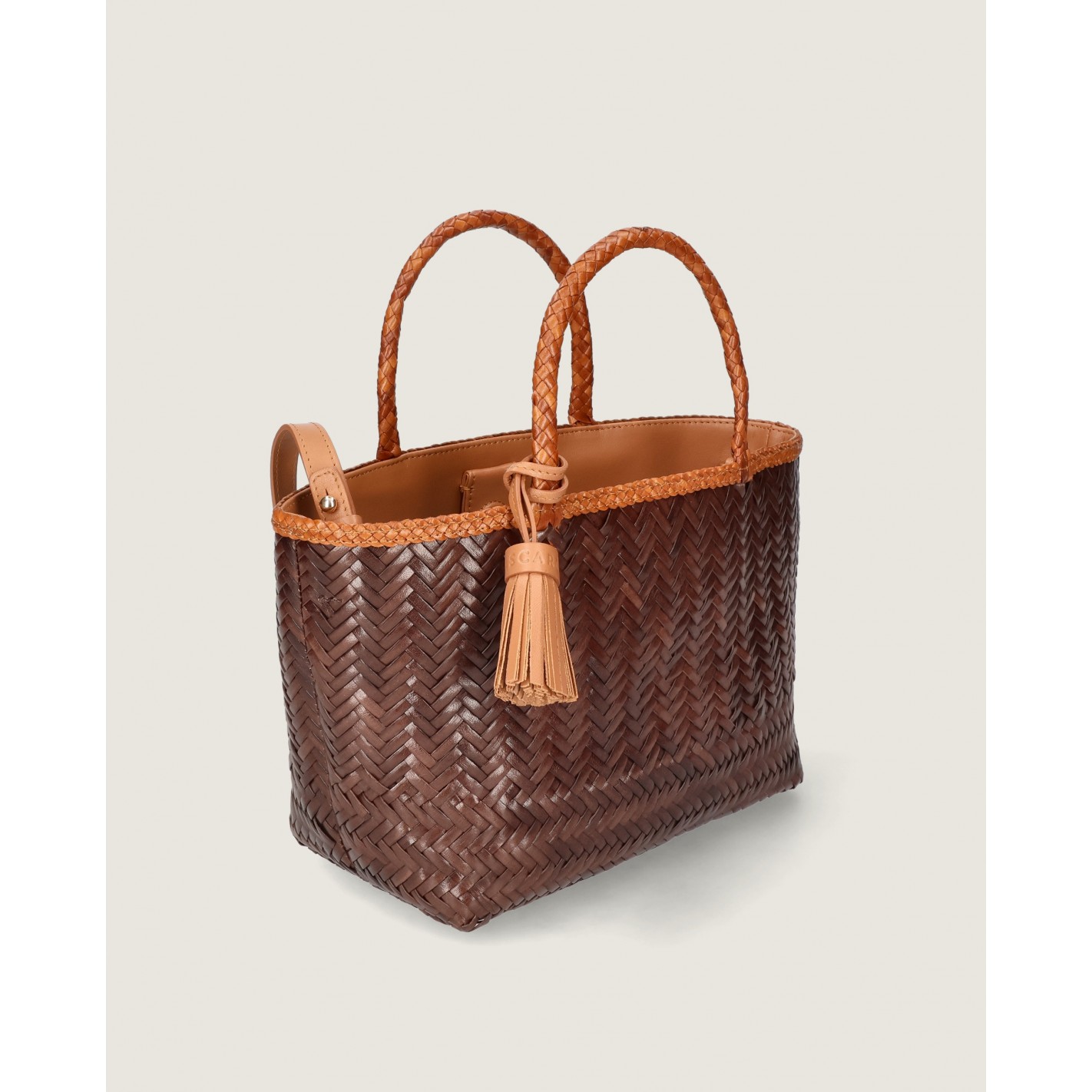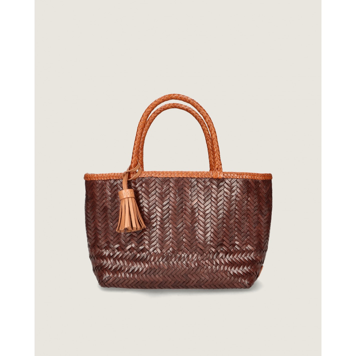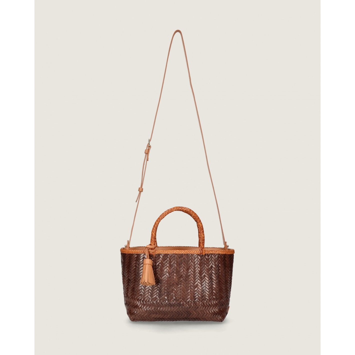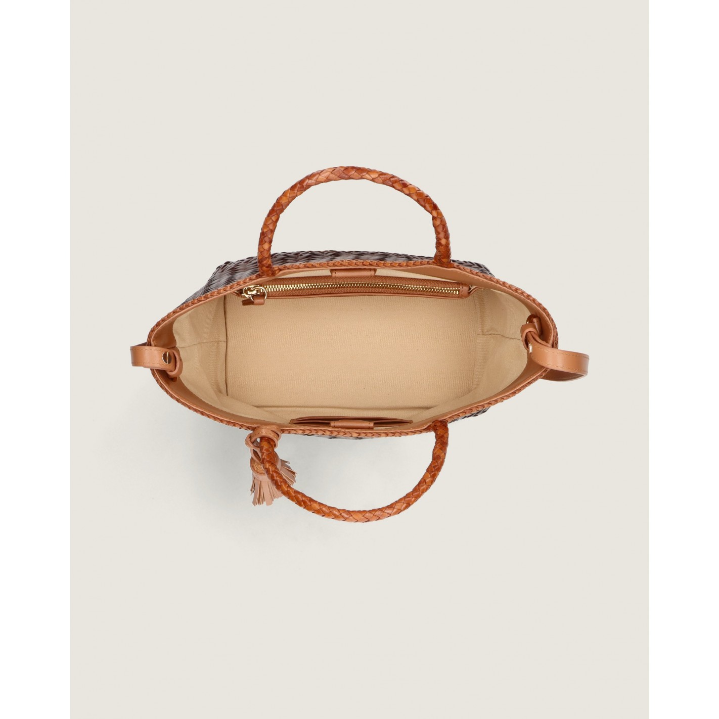 Bolso Tote Woven en piel entrelazada color marrón con asa y borla decorativa. 18cm x 26cm x 12cm (alto x largo x ancho)