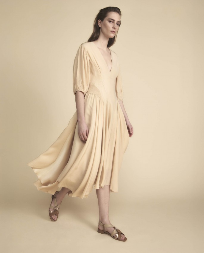 Sandalia modelo Corfu en napa suave color marfil con tacón de 7.5cm, suela de goma, plantilla y forro de piel.