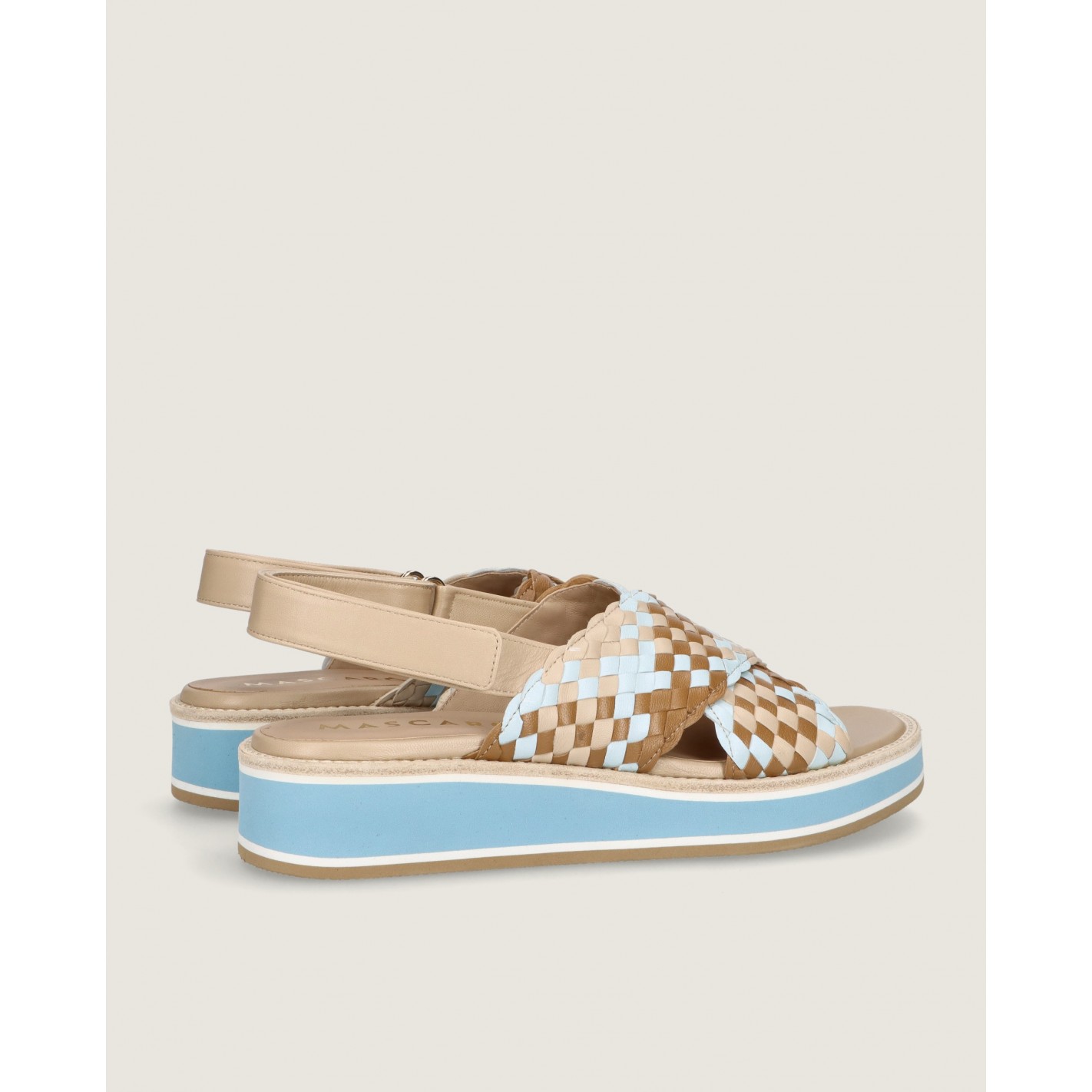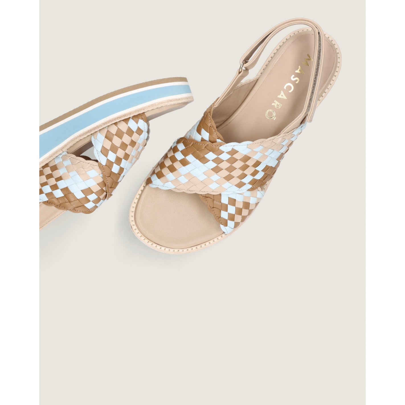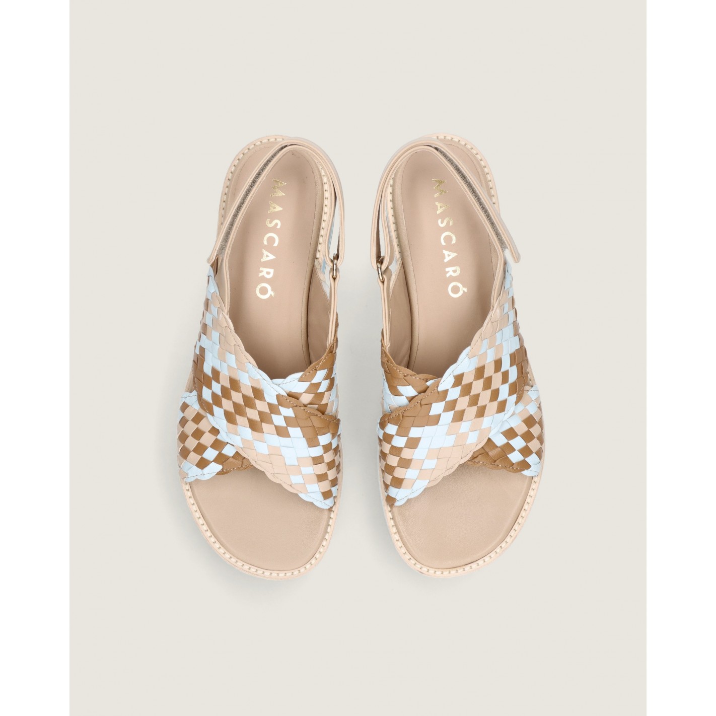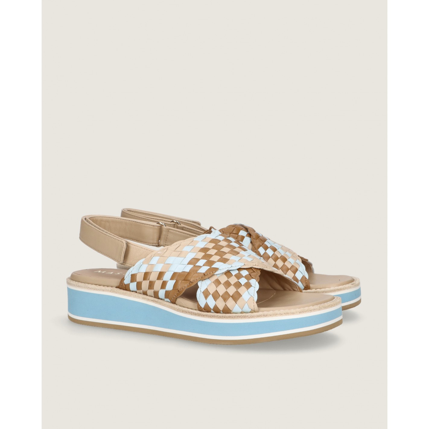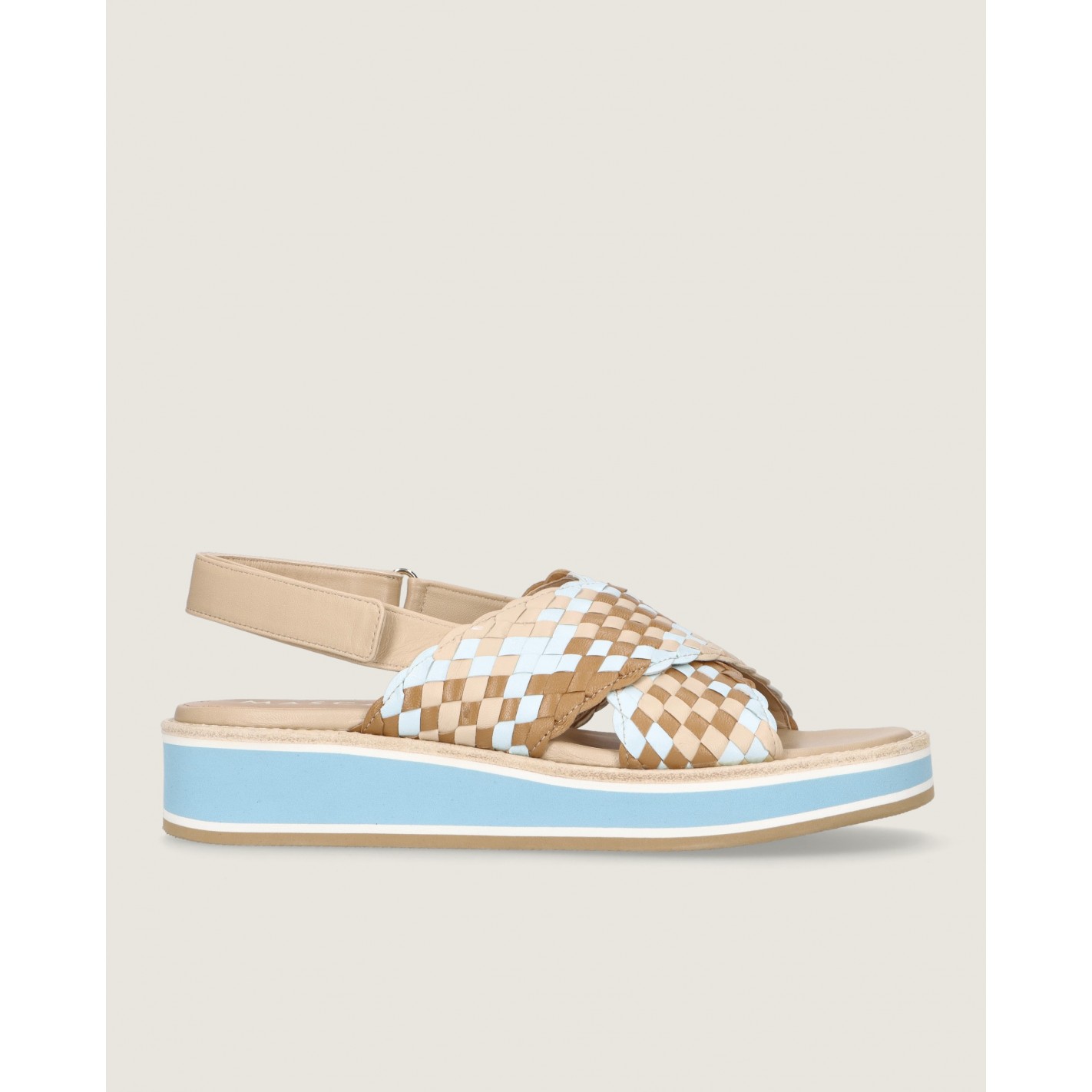 Sandalia Lygia com tira de tornozelo de velcro e salto de 3,5 cm em couro trançado bege, marrom e azul claro com sola de borracha e palmilha de couro.