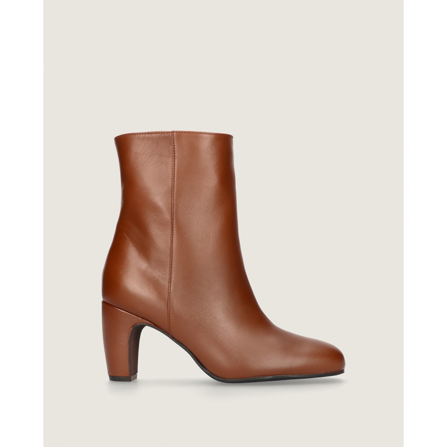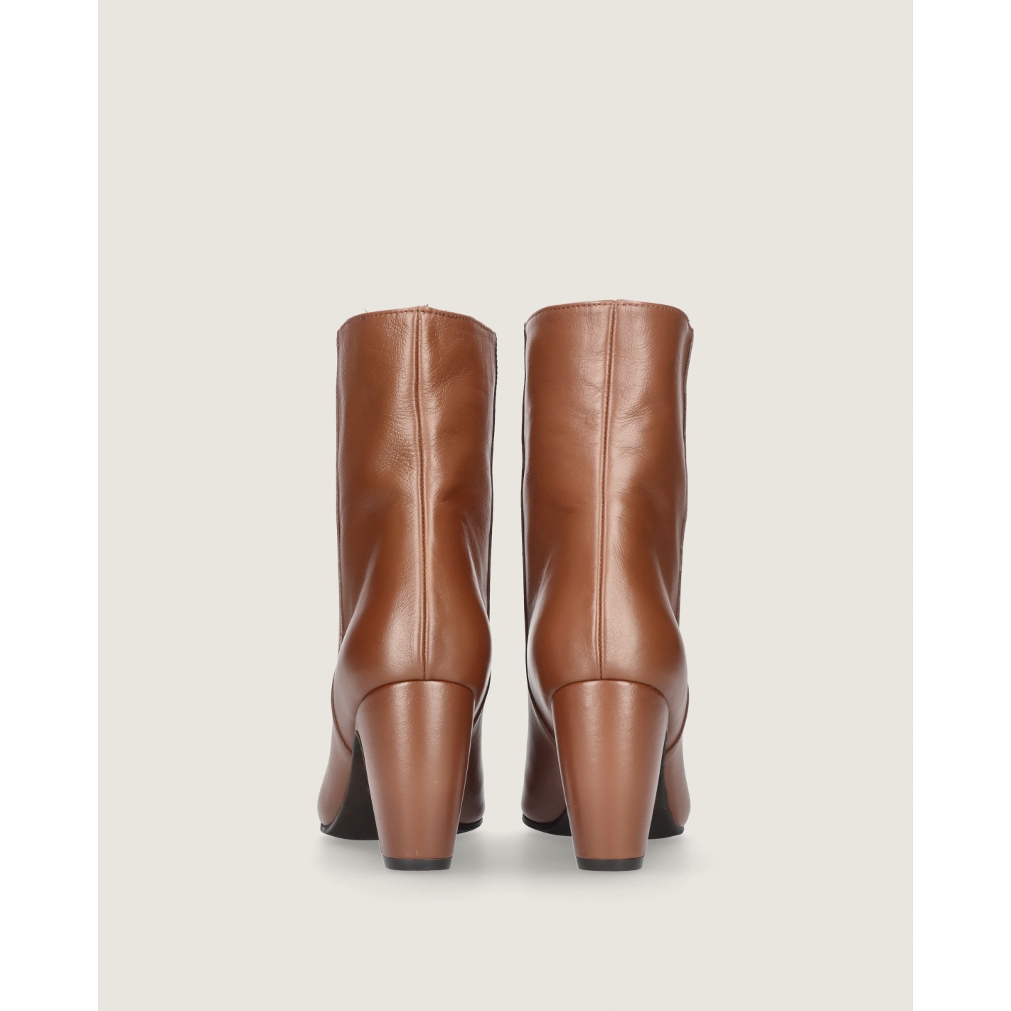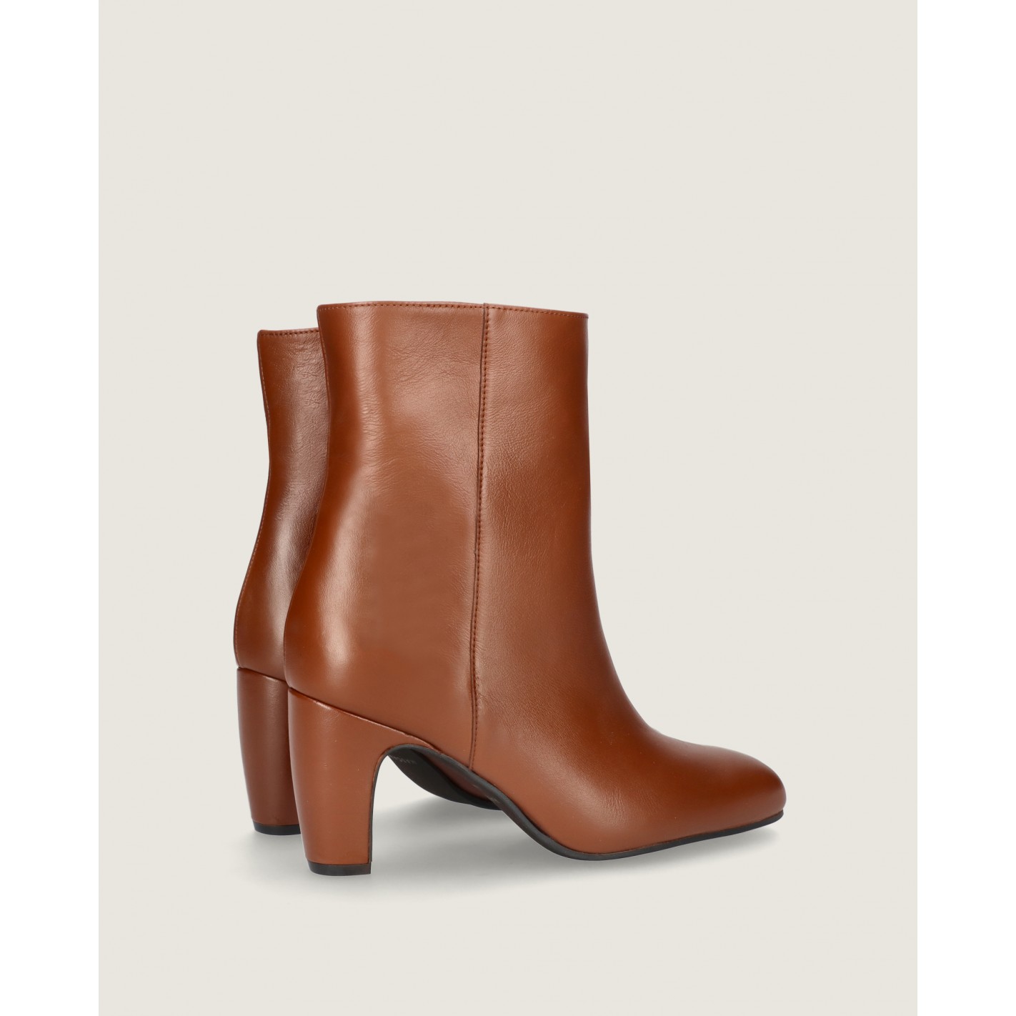 Bota de tornozelo Emily com salto de 8cm em couro macio na cor castanha, com sola de borracha, palmilha e forro de couro.