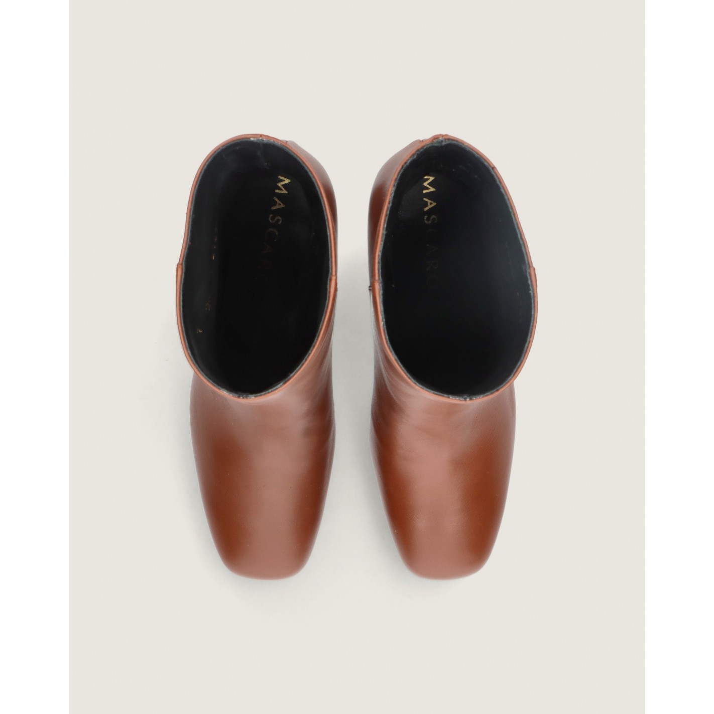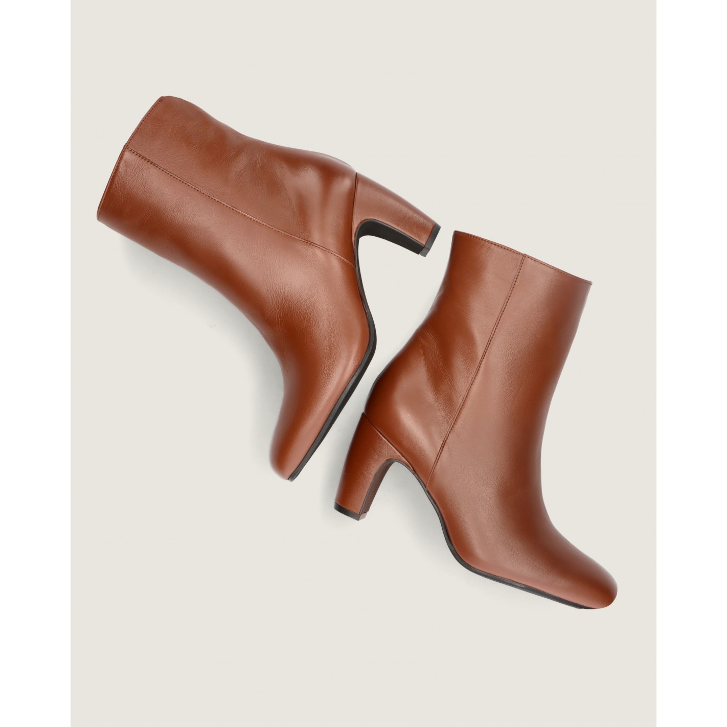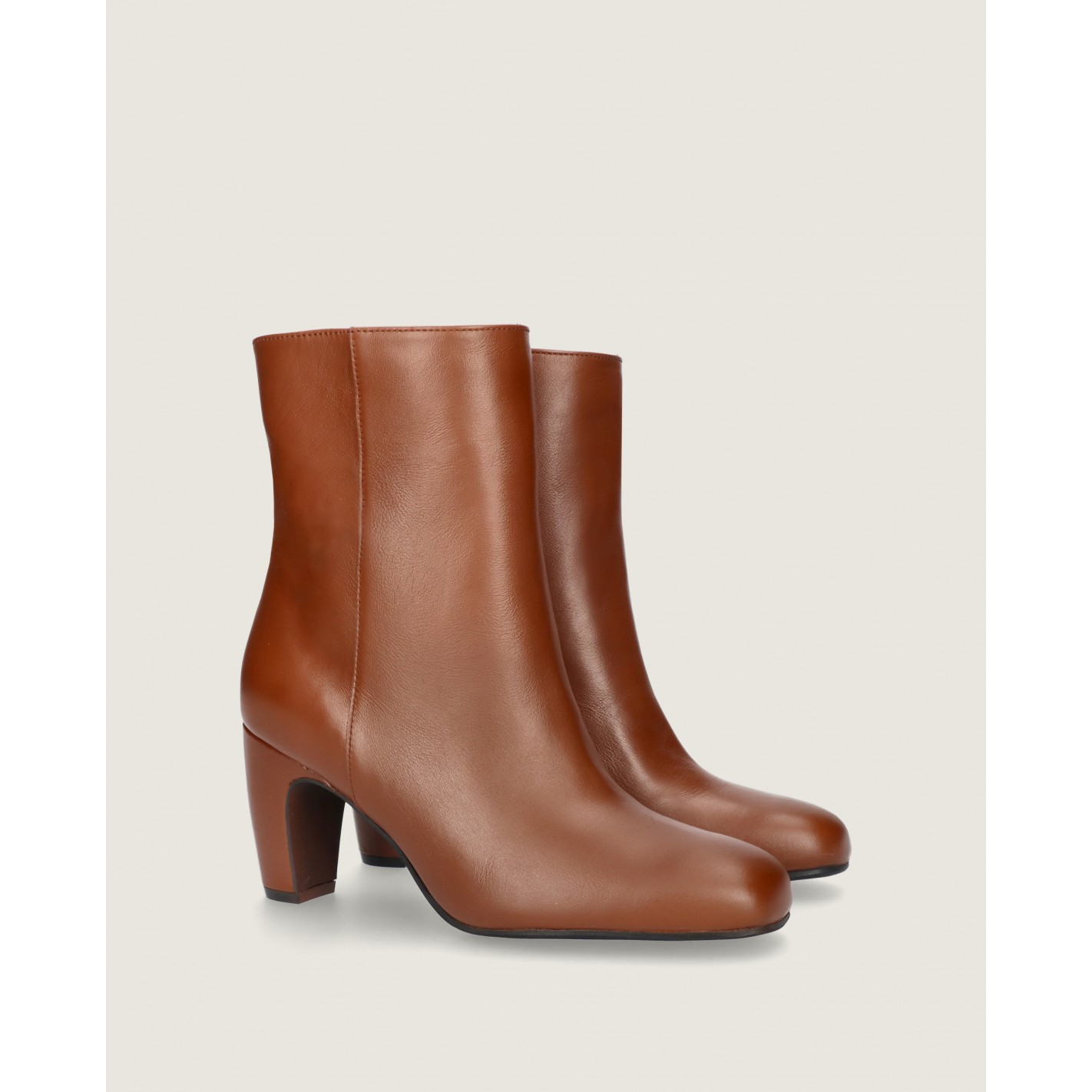 Bota de tornozelo Emily com salto de 8cm em couro macio na cor castanha, com sola de borracha, palmilha e forro de couro.