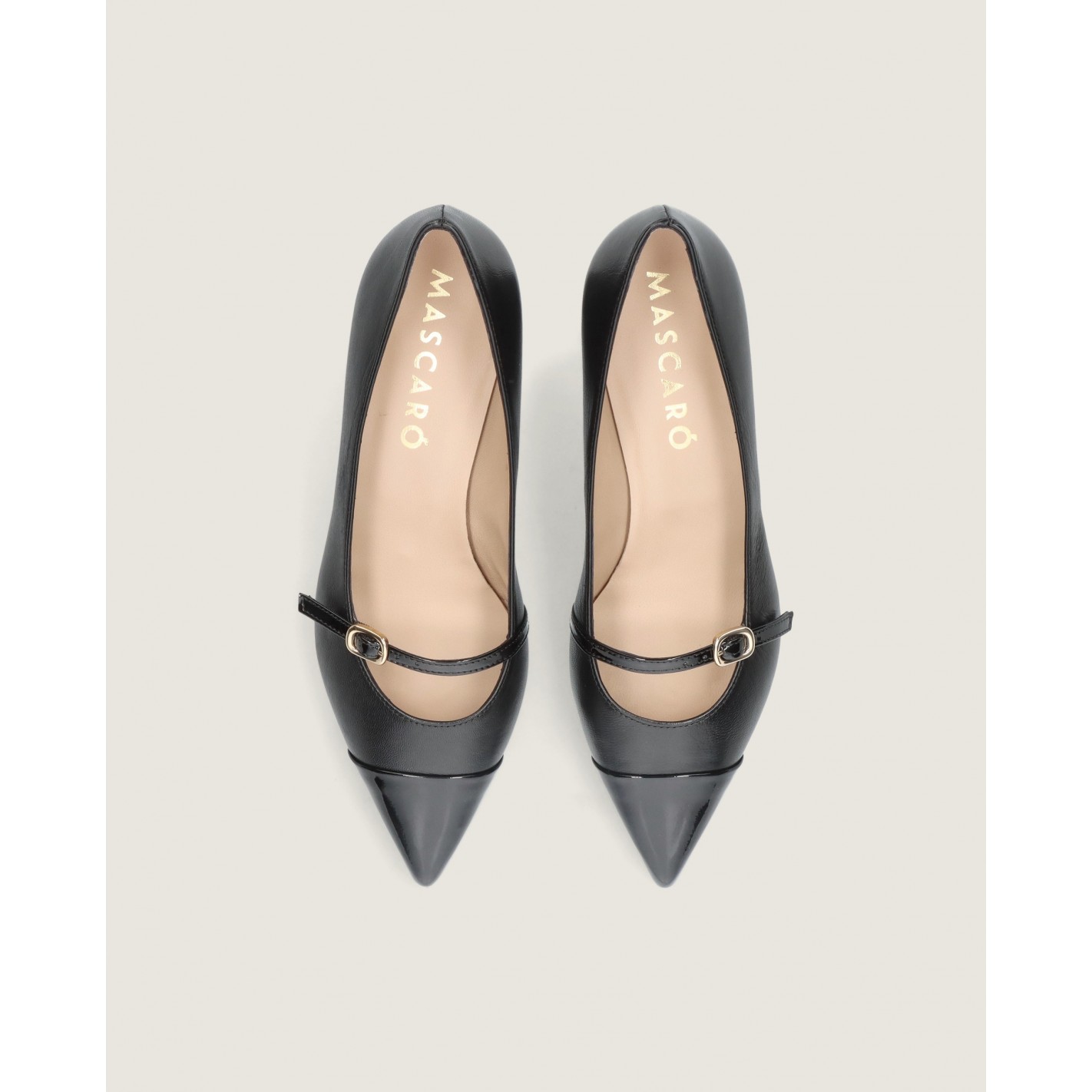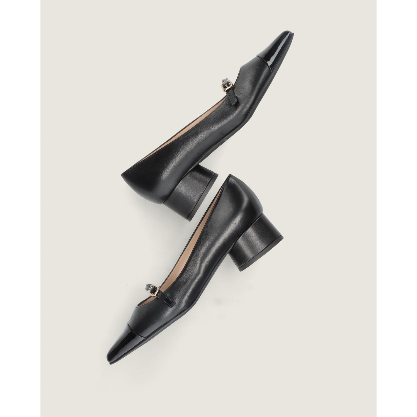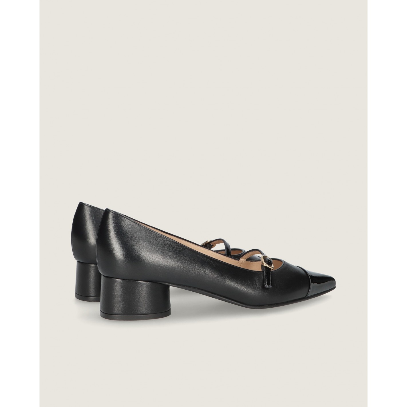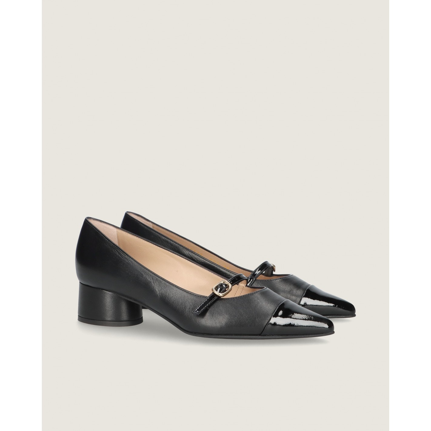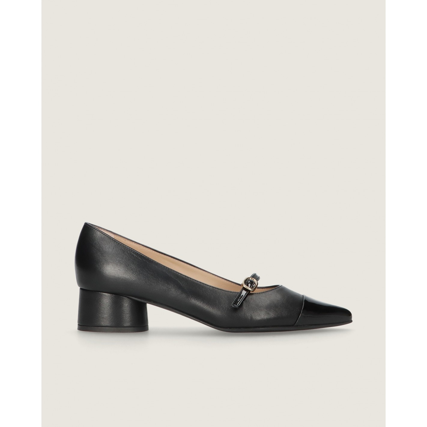 Pump Holly com bico fino e salto redondo de 4 cm em couro preto macio com detalhe de ponta e tira em couro preto envernizado, sola de borracha, palmilha e forro de couro.