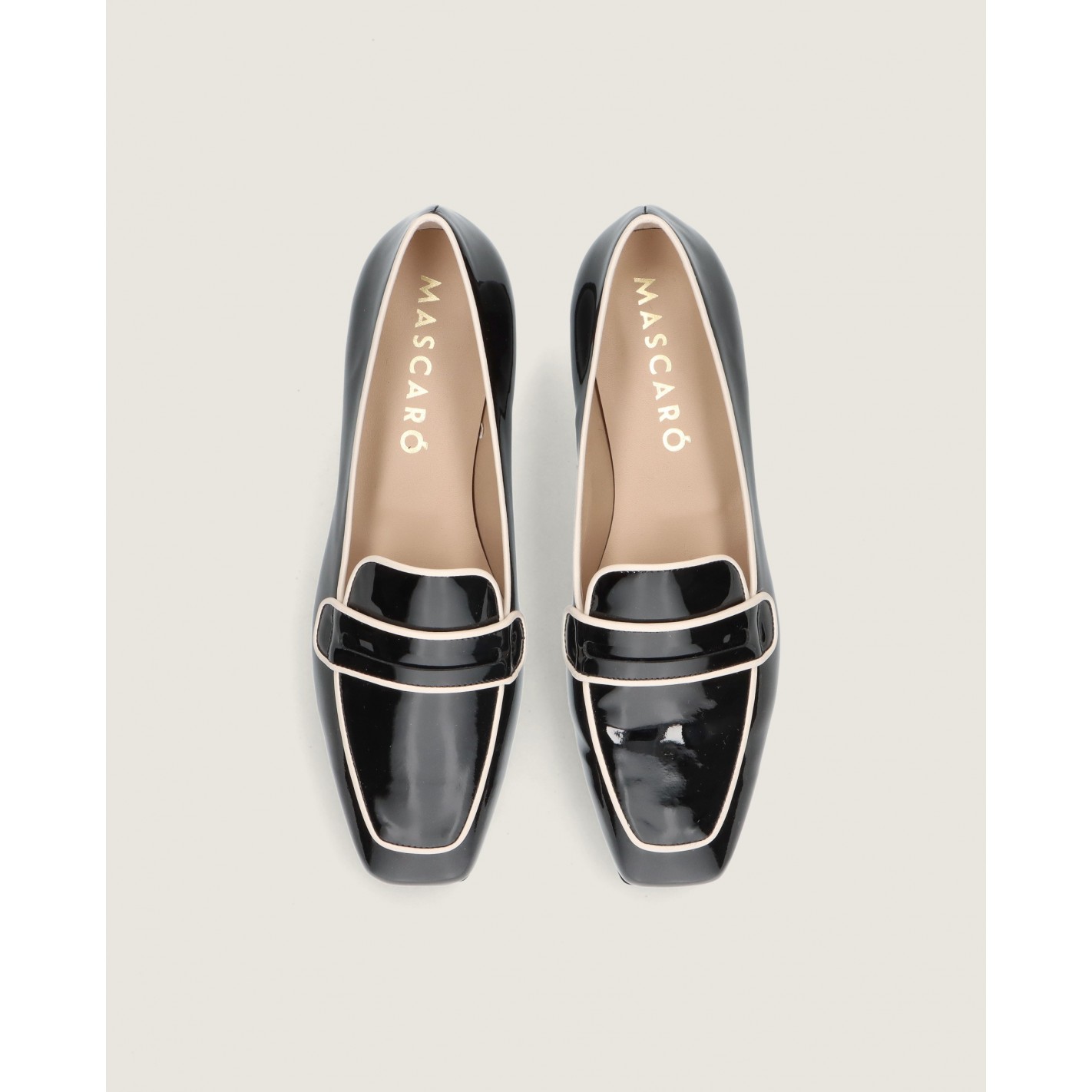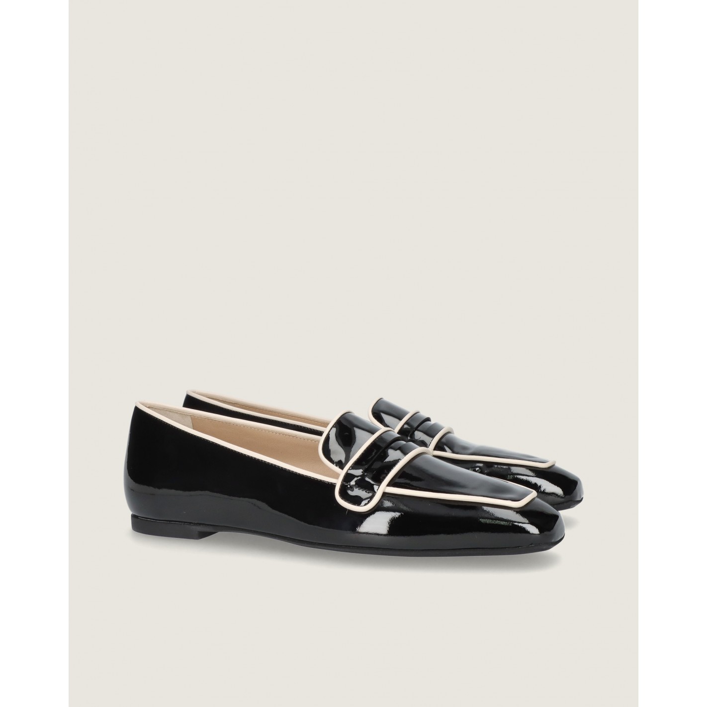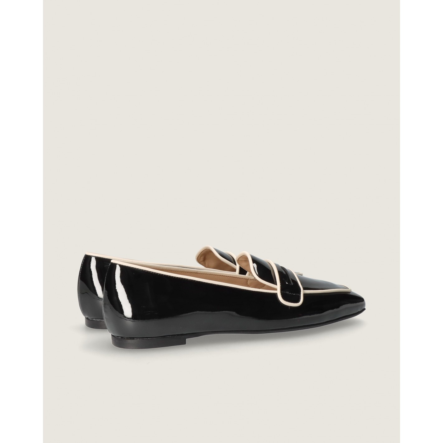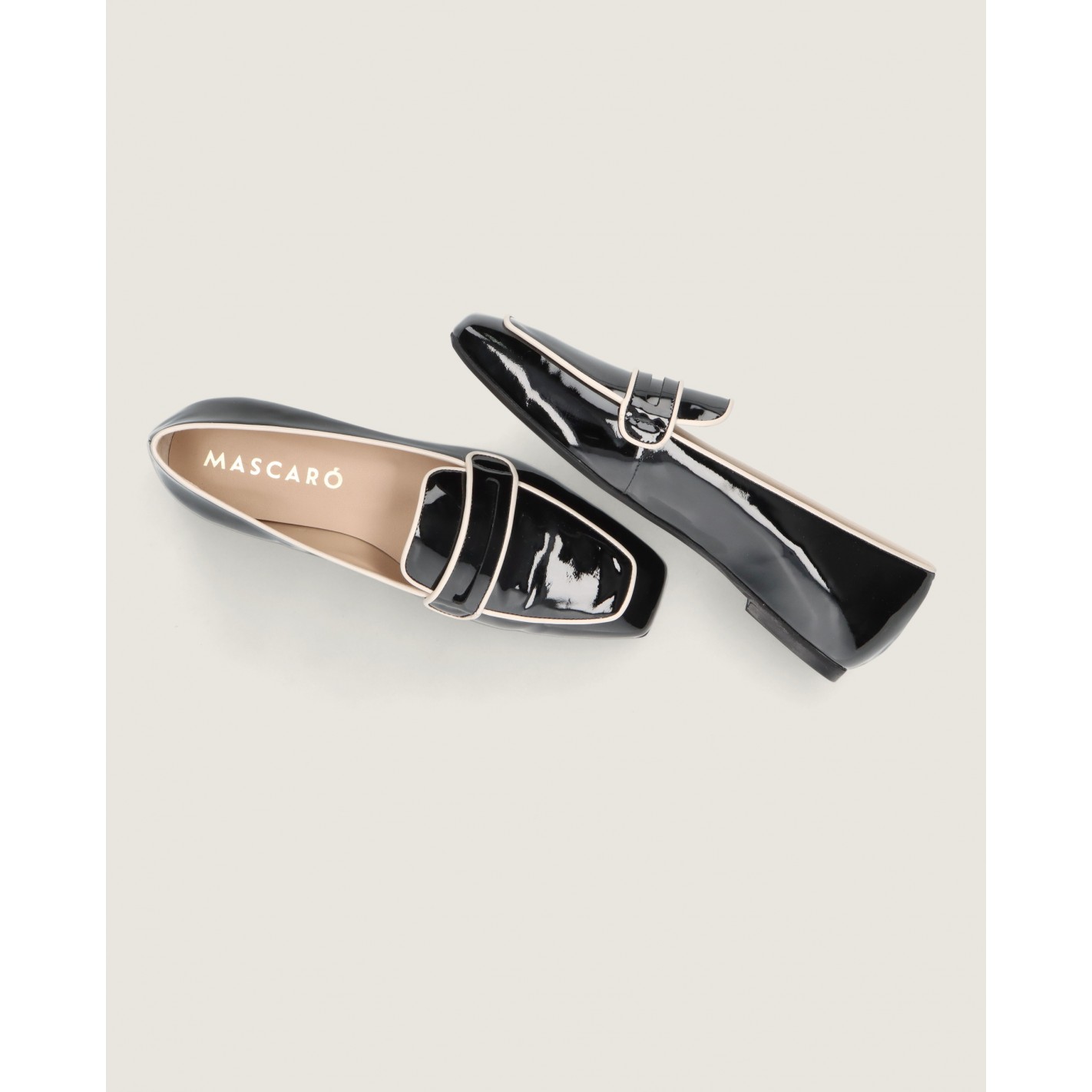 Loafer de punta cuadrada modelo Camille en charol negro con ribete en napa beige, suela de goma, plantilla y forro de piel.